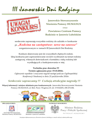 Janowskie Stowarzyszenie Niesienia Pomocy HUMANUS oraz Powiatowe Centrum Pomocy Rodzinie w Janowie Lubelskim serdecznie zapraszają wszystkie rodziny do udziału w konkursie pt. „Rodzina na zastępstwo- serce na zawsze” zorganizowanym w ramach III Janowskich Dni Rodziny Konkurs skierowany jest do wszystkich chętnych rodzin. Ideą konkursu jest zaprezentowanie swoich wyobrażeń na temat rodziny zastępczej, własnych doświadczeń z kontaktu z taką rodziną lub wynikających z funkcjonowania w niej. Technika prac dowolna !!!! Termin zgłaszania prac: 19.10.2016r. Ogłoszenie wyników i wręczenie nagród nastąpi podczas Ogólnopolskiej Konferencji Naukowej w dniu 25 października 2016r. Serdecznie zapraszamy !!! Czekają atrakcyjne nagrody !!! Więcej informacji i miejsce składania prac konkursowych: Janowskie Stowarzyszenie Niesienia Pomocy HUMANUS, ul. Boh. Poryt. Wzgórza 23, tel. 15 8142251, 696 674 684. ORGANIZATORZY: PATRONAT HONOROWY: Janowskie Stowarzyszanie Niesienia Pomocy HUMANUS Powiatowe Centrum Pomocy Rodzinie w Janowie Lubelskim Inicjatywa dofinansowana przez Burmistrza Janowa Lubelskiego w ramach realizacji zadania publicznego
