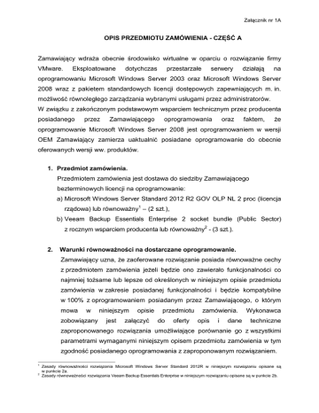 Załącznik nr 1A OPIS PRZEDMIOTU ZAMÓWIENIA - CZĘŚĆ A Zamawiający wdraża obecnie środowisko wirtualne w oparciu o rozwiązanie firmy VMware. Eksploatowane dotychczas przestarzałe serwery działają na oprogramowaniu Microsoft Windows Server 2003 oraz Microsoft Windows Server 2008 wraz z pakietem standardowych licencji dostępowych zapewniających m. in. możliwość równoległego zarządzania wybranymi usługami przez administratorów. W związku z zakończonym podstawowym wsparciem technicznym przez producenta posiadanego przez Zamawiającego oprogramowania oraz faktem, że oprogramowanie Microsoft Windows Server 2008 jest oprogramowaniem w wersji OEM Zamawiający zamierza uaktualnić posiadane oprogramowanie do obecnie oferowanych wersji ww. produktów. 1. Przedmiot zamówienia. Przedmiotem zamówienia jest dostawa do siedziby Zamawiającego bezterminowych licencji na oprogramowanie: a) Microsoft Windows Server Standard 2012 R2 GOV OLP NL 2 proc (licencja rządowa) lub równoważny1 – (2 szt.), b) Veeam Backup Essentials Enterprise 2 socket bundle (Public Sector) z rocznym wsparciem producenta lub równoważny2 - (3 szt.). 2. Warunki równoważności na dostarczane oprogramowanie. Zamawiający uzna, że zaoferowane rozwiązanie posiada równoważne cechy z przedmiotem zamówienia jeżeli będzie ono zawierało funkcjonalności co najmniej tożsame lub lepsze od określonych w niniejszym opisie przedmiotu zamówienia w zakresie posiadanej funkcjonalności i będzie kompatybilne w 100% z oprogramowaniem posiadanym przez Zamawiającego, o którym mowa w zobowiązany niniejszym jest opisie załączyć przedmiotu do oferty zamówienia. opis i dane Wykonawca techniczne zaproponowanego rozwiązania umożliwiające porównanie go z wszystkimi parametrami wymaganymi niniejszym opisem przedmiotu zamówienia w tym zgodność posiadanego oprogramowania z zaproponowanym rozwiązaniem. 1 2 Zasady równoważności rozwiązania Microsoft Windows Server Standard 2012R w niniejszym rozwiązaniu opisane są w punkcie 2a. Zasady równoważności rozwiązania Veeam Backup Essentials Enterprise w niniejszym rozwiązaniu opisane są w punkcie 2b. Załącznik nr 1A Dodatkowo Zamawiający zastrzega sobie prawo do zweryfikowania funkcjonalności, wydajności i kompatybilności zaoferowanego rozwiązania poprzez analizę jego możliwości. W przypadku skorzystania przez Zamawiającego z ww. uprawnienia wykonawca jest zobowiązany w terminie 5 dni od dnia otrzymania od Zamawiającego wezwania do dostarczenia oraz wdrożenia testowej wersji zaproponowanego rozwiązania. a) Licencja na system operacyjny dla serwerów w wersji dla jednostek rządowych (samorządowych). Licencja na oprogramowanie musi być przypisana do każdego procesora fizycznego na serwerze. Liczba rdzeni procesorów i ilość pamięci nie mogą mieć wpływu na liczbę wymaganych licencji. Licencja musi uprawniać do uruchamiania serwerowego systemu operacyjnego (SSO) w środowisku fizycznym i dwóch środowisk wirtualnych serwerowego systemu operacyjnego za pomocą wbudowanych mechanizmów wirtualizacji. Serwerowy system operacyjny (SSO) musi posiadać następujące, wbudowane cechy: 1. Możliwość wykorzystania, co najmniej 320 logicznych procesorów oraz co najmniej 4 TB pamięci RAM w środowisku fizycznym. 2. Możliwość wykorzystywania 64 procesorów wirtualnych oraz 1TB pamięci RAM i dysku o pojemności min. 64TB przez każdy wirtualny serwerowy system operacyjny. 3. Możliwość budowania klastrów składających się z 64 węzłów, z możliwością uruchamiania do 8000 maszyn wirtualnych. 4. Możliwość migracji maszyn wirtualnych bez zatrzymywania ich pracy między fizycznymi serwerami z uruchomionym mechanizmem wirtualizacji (hypervisor) przez sieć Ethernet, bez konieczności stosowania dodatkowych mechanizmów współdzielenia pamięci. 5. Wsparcie (na umożliwiającym to sprzęcie) dodawania i wymiany pamięci RAM bez przerywania pracy. 6. Wsparcie (na umożliwiającym to sprzęcie) dodawania i wymiany procesorów bez przerywania pracy. 7. Automatyczna weryfikacja cyfrowych sygnatur sterowników w celu sprawdzenia, czy sterownik przeszedł testy jakości przeprowadzone Załącznik nr 1A przez producenta systemu operacyjnego. 8. Możliwość dynamicznego obniżania poboru energii przez rdzenie procesorów niewykorzystywane w bieżącej pracy. Mechanizm ten musi uwzględniać specyfikę procesorów wyposażonych w mechanizmy HyperThreading. 9. Wbudowane wsparcie instalacji i pracy na wolumenach, które: a. pozwalają na zmianę rozmiaru w czasie pracy systemu, b. umożliwiają tworzenie w czasie pracy systemu migawek, dających użytkownikom końcowym (lokalnym i sieciowym) prosty wgląd w poprzednie wersje plików i folderów, c. umożliwiają kompresję "w locie" dla wybranych plików i/lub folderów, d. umożliwiają zdefiniowanie list kontroli dostępu (ACL). 10. Wbudowany mechanizm klasyfikowania i indeksowania plików (dokumentów) w oparciu o ich zawartość. 11. Wbudowane szyfrowanie dysków przy pomocy mechanizmów posiadających certyfikat FIPS 140-2 lub równoważny wydany przez NIST lub inną agendę rządową zajmującą się bezpieczeństwem informacji. 12. Możliwość uruchamiania aplikacji internetowych wykorzystujących technologię ASP.NET 13. Możliwość dystrybucji ruchu sieciowego HTTP pomiędzy kilka serwerów. 14. Wbudowana zapora internetowa (firewall) z obsługą definiowanych reguł dla ochrony połączeń internetowych i intranetowych. 15. Graficzny interfejs użytkownika. 16. Zlokalizowane w języku polskim, co najmniej następujące elementy: menu, przeglądarka internetowa, pomoc, komunikaty systemowe. 17. Możliwość zmiany języka interfejsu po zainstalowaniu systemu, dla co najmniej 10 języków poprzez wybór z listy dostępnych lokalizacji. 18. Wsparcie dla większości powszechnie używanych urządzeń peryferyjnych (drukarek, urządzeń sieciowych, standardów USB, Plug&Play). 