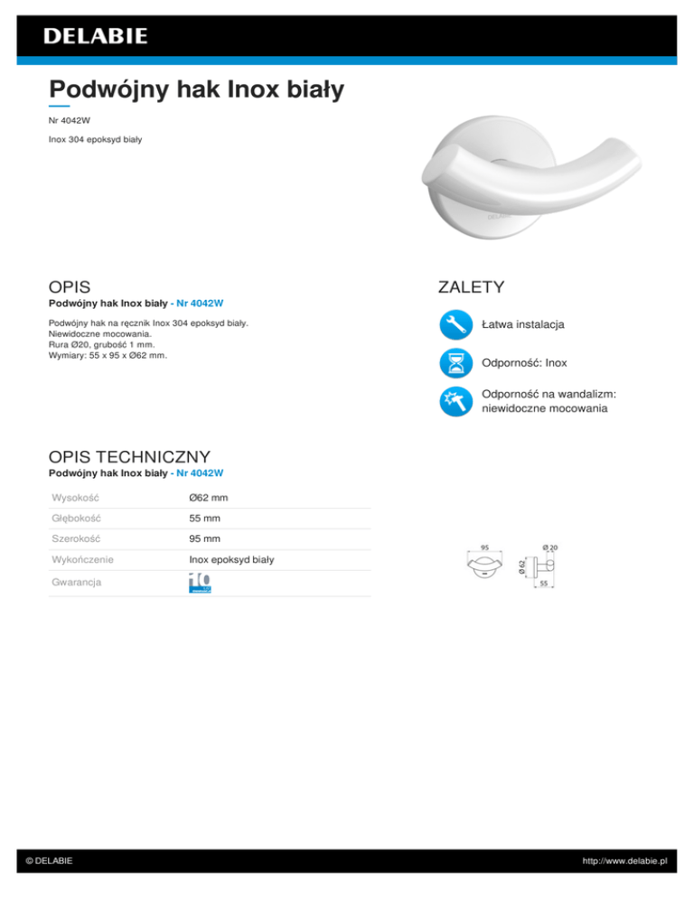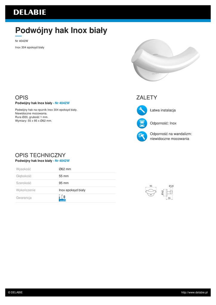 Podwójny hak Inox biały Nr 4042W Inox 304 epoksyd biały OPIS ZALETY Podwójny hak Inox biały - Nr 4042W Podwójny hak na ręcznik Inox 304 epoksyd biały. Niewidoczne mocowania. Rura Ø20, grubość 1 mm. Wymiary: 55 x 95 x Ø62 mm. Łatwa instalacja Odporność: Inox Odporność na wandalizm: niewidoczne mocowania OPIS TECHNICZNY Podwójny hak Inox biały - Nr 4042W Wysokość Ø62 mm Głębokość 55 mm Szerokość 95 mm Wykończenie Inox epoksyd biały Gwarancja © DELABIE http://www.delabie.pl