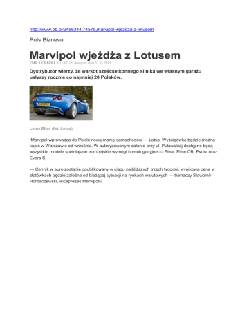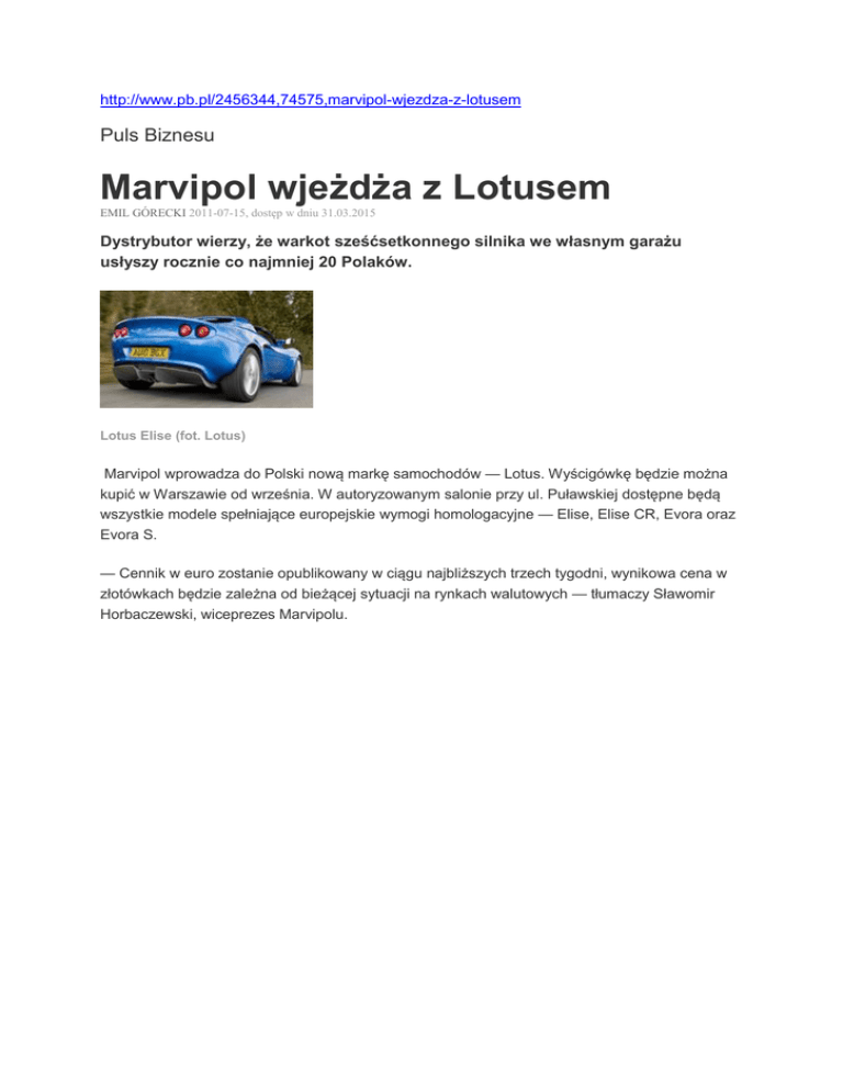 http://www.pb.pl/2456344,74575,marvipol-wjezdza-z-lotusem Puls Biznesu Marvipol wjeżdża z Lotusem EMIL GÓRECKI 2011-07-15, dostęp w dniu 31.03.2015 Dystrybutor wierzy, że warkot sześćsetkonnego silnika we własnym garażu usłyszy rocznie co najmniej 20 Polaków. Lotus Elise (fot. Lotus) Marvipol wprowadza do Polski nową markę samochodów — Lotus. Wyścigówkę będzie można kupić w Warszawie od września. W autoryzowanym salonie przy ul. Puławskiej dostępne będą wszystkie modele spełniające europejskie wymogi homologacyjne — Elise, Elise CR, Evora oraz Evora S. — Cennik w euro zostanie opublikowany w ciągu najbliższych trzech tygodni, wynikowa cena w złotówkach będzie zależna od bieżącej sytuacji na rynkach walutowych — tłumaczy Sławomir Horbaczewski, wiceprezes Marvipolu.
