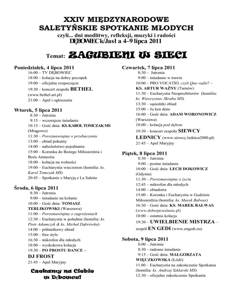 XXIV MIĘDZYNARODOWE SALETYŃSKIE SPOTKANIE MŁODYCH czyli... dni modlitwy, refleksji, muzyki i radości DĘBOWIECk/Jasł a 4–9 lipca 2011 Temat: ZAGUBIENI W SIECI Poniedziałek, 4 lipca 2011 16:00 – TV DĘBOWIEC 18:00 – kolacja na dobry początek 19:00 – oficjalne rozpoczęcie 19:30 – koncert zespołu BETHEL (www.bethel.art.pl) 21:00 – Apel i ogłoszenia Wtorek, 5 lipca 2011 8:30 – Jutrznia 9:15 – wczorajsze śniadanie 10:15 – Gość dnia: KS. KAROL TOMCZAK MS (Mrągowo) 11:30 – Porozmawiajmy o przebaczeniu 13:00 – obiad pokutny 14:00 – nabożeństwo pojednania 15:00 – Koronka do Bożego Miłosierdzia i Boża Amnestia 18:00 – kolacja na wolności 19:00 – Eucharystia wieczorem (homilia: ks. Karol Tomczak MS) 20:45 – Spotkanie z Maryją z La Salette Środa, 6 lipca 2011 8:30 – Jutrznia 9:00 – śniadanie na kolanie 10:00 – Gość dnia: TOMASZ TERLIKOWSKI (Warszawa) 11:00 – Porozmawiajmy o zagrożeniach 12:30 – Eucharystia w południe (homilia: ks. Piotr Adamczyk & ks. Michał Dąbrówka) 14:00 – półmetkowy obiad 15:00 – free style 16:30 – mikrofon dla młodych 18:00 – wyskokowa kolacja 19:30 – PO PROSTU DANCE – DJ FROST 21:45 – Apel Maryjny Czekamy na Ciebie w Dębowcu! Czwartek, 7 lipca 2011 8:30 – Jutrznia 9:00 – śniadanie w trawie 10:00 – PRO VOCATIO, czyli Quo vadis? – KS. ARTUR WAŻNY (Tarnów) 11:30 – Eucharystia Neoprezbiterów (homilia: ks. Wawrzyniec Skraba MS) 13:30 – sąsiedzki obiad 15:00 – Ju ken dens 16:00 – Gość dnia: ADAM WORONOWICZ (Warszawa) 18:00 – kolacja pod dębem 19:30 – koncert zespołu SIEWCY LEDNICY (www.siewcy.lednica2000.pl) 21:45 – Apel Maryjny Piątek, 8 lipca 2011 8:30 – Jutrznia 9:00 – postne śniadanie 10:00 – Gość dnia: LECH DOKOWICZ (Gdynia) 11:30 – Porozmawiajmy o życiu 12:45 – mikrofon dla młodych 14:00 – obiadorra 15:00 – Koronka i Eucharystia w Godzinie Miłosierdzia (homilia: ks. Marek Bałwas) 16:30 – Gość dnia: KS. MAREK BAŁWAS (www.dobreprzeslanie.pl) 18:00 – ostatnia kolacja 19:30 – UWIELBIENIE zespół EN MISTRZA – GEDI (www.engedi.eu) Sobota, 9 lipca 2011 8:00 – Jutrznia 8:30 – radosne śniadanie 9:15 – Gość dnia: MAŁGORZATA WIĘCZKOWSKA (Łódź) 11.00 – Eucharystia na zakończenie Spotkania (homilia: ks. Andrzej Szklarski MS) 12:30 – oficjalne zakończenie Spotkania