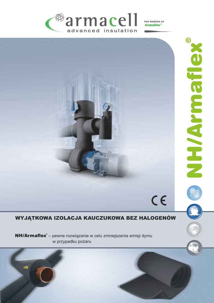 WYJĄTKOWA IZOLACJA KAUCZUKOWA BEZ HALOGENÓW – pewne rozwiązanie w celu zmniejszenia emisji dymu w przypadku pożaru NH/Armaflex jest produktem na bazie kauczuku syntetycznego będącym odpowiedzią na potrzebę stworzenia izolacji przyjaznej dla środowiska oraz emitującej, w przypadku pożaru, minimalne ilości dymu oraz substancji toksycznych. Poprzez dodanie do izolacji NH/Armaflex specjalnych uniepalniaczy, łatwopalna natura polimerów została zredukowana do minimum. W przeciwieństwie do innych produktów kauczukowych, substancje te nie zawierają halogenów (pierwiastków z grupy chlorowców). NH/Armaflex, dzięki swoim unikalnym właściwościom, najczęściej znajduje zastosowanie w przemyśle stoczniowym, w pojazdach transportu publicznego oraz budownictwie o podwyższonych wymogach przeciwpożarowych. Dane techniczne Krótki opis: Bardzo elastyczna izolacja o zamkniętej strukturze komórkowej, nie zawiera halogenów (chlorowców) pod żadną postacią. Materiał: Ekstrudowana pianka na bazie kauczuku syntetycznego w kolorze ciemnoszarym. Materiał nie zawiera halogenów, zgodnie z DIN/VDE 0472 punkt 815. Spełnia wymagania DIN 1988 część 2 i 7. Zastosowanie: NH/Armaflex zapewnia izolację i ochronę rur, kanałów powietrznych, zbiorników (także kształtek i armatury) w instalacjach chłodniczych, klimatyzacyjnych i grzewczych, w których wymagane są materiały nie zawierające chloru: pomieszczenia komputerowe, statki, budynki o dużym zagęszczeniu ludźmi. Nadzór: (kontrola jakości) Cały asortyment podlega oficjalnej kontroli niezależnych instytutów badawczych oraz jednostki notyfikowanej (GSH) jak również wewnętrznej kontroli jakości w fabryce zgodnie z normą PN-EN 14304, przy zastosowaniu procedury przewidzianej w normie EN 13172. Własności materiału Wartość/podstawa Uwagi Temperatury stosowania max. temperatura czynnika min. temperatura czynnika +110°C (+85°C) 1) –50°C (–200°C) 2) zodnie z EN 14706, EN 14707 i PN-EN 14304 Przewodność cieplna l [W/(m·K)] dla temperatury Jm = 0°C 0,040 Przenikanie pary wodnej współczynnik oporu przeciw dyfuzji pary wodnej m 40+0,1·Jm + 0,0009·Jm² W m·K 1000 zgodnie z EN 12086, EN 13469 ł 2 000 Zharmonizowana europejska norma wyrobu budowlanego PN-EN 14304:2009 Właściwości pożarowe: 1. euroklasa wyrobu budowlanego (klasa reakcji na ogień) DL-s3; d0 E badanie zgodnie z EN 13823 (SBI) i EN ISO 11925-2 2. praktyczne właściwości pożarowe samogasnący, niekapiący, bardzo niskie wydzielanie dymu 3. przemysł stoczniowy Bureau Veritas, Det Norske Veritas badanie zgodne z IMO A653(16) 4. transport publiczny Exova Brandhaus badanie zgodne z DIN 54837 oraz ISO 5659 (DIN 5510-2) 5. inne klasyfikacje Underwrites Laboratories (UL) badanie zgodne z UL94, IEC 60695 oraz CAN/CSA-C.22.2 No.0.17., UL 746C badanie zgodne z UBC26-3, Class No.4924 FM-Global 2) Wyroby do izolacji cieplnej wyposażenia budynków i instalacji przemysłowych – wyroby z elastycznej pianki elastomerycznej (FEF) produkowane fabrycznie – specyfikacja klasyfikacja zgodna z EN 13501-1 otuliny role, taśmy 1) wartość deklarowana zgodnie z EN ISO 13787 badanie zgodne z EN ISO 8497 oraz EN 12667 Certyfikat zgodności CE 0543-FEF wydany przez GSH, jednostka notyfikowana nr 0919 Rozmiary i tolerancje zgodnie z asortymentem w cenniku oraz PN-EN 14304, tabela 1 zgodnie z EN 822, EN 823, EN 13467 Odporność na warunki atmosferyczne dobra przy stosowaniu na zewnątrz konieczne pokrycie w ciągu 3 dni, np. farbą Armafinish 99 Kolor ciemnoszary Składowanie, dopuszczalny okres magazynowania taśmy, role samoprzylepne: 1 rok mogą być przechowywane w suchym i czystym pomieszczeniu w normalnej wilgotności względnej powietrza (50%-70%) i temperaturze otoczenia (0°C - 35°C) W przypadku klejenia całą powierzchnią do obiektu W przypadku temperatur poniżej -50°C prosimy o kontakt z Działem Technicznym Armacell Wszystkie dane i informacja techniczna są oparte na wynikach uzyskanych w typowych warunkach użytkowania. Odbiorcy tych danych i informacji są odpowiedzialni, we własnym interesie, za skontaktowanie się z nami w odpowiednim czasie, aby sprawdzić czy te dane i informacje odnoszą się również do planowanych przez nich zastosowań. Zasady montażu izolacji dostępne są w instrukcji montażu Armaflex. W przypadku izolowania instalacji ze stali nierdzewnej prosimy o kontakt z naszym Działem Technicznym. Do prawidłowego montażu NH/Armaflex należy stosować wyłącznie klej Armaflex 520 lub Armaflex HT625. W niektórych nowych systemach chłodniczych zastosowany czynnik może osiągnąć temperaturę +110°C, w takich przypadkach prosimy o kontakt z naszym Działem Technicznym. Przy zastosowaniach izolacji NH/Armaflex na zewnątrz należy zabezpieczyć ją przed działaniem promieniowania słonecznego w ciągu 3 dni np. farbą Armafinish 99 lub osłonami Arma Chek lub OKABELL. Armacell Poland Sp. z o.o. ul. Targowa 2, 55-300 Środa Śląska tel. (71) 31 75 025, fax (71) 31 75 115 40 w w w. a r m a c e l l . c o m e-mail: [email protected] Cennik produktów ważny od 20.01.2014 r. Do cen należy doliczyć podatek VAT 23%. Otuliny [mm] œred. nomin. DN 10 12 14/15 18 22 28 35 42 8 10 10/15 20 25 32 40 54 50 76,1 88,9 65 80 [mm] œred. nomin. DN 1/8 10,2 6 1/4 13,5 17,2 21,3 26,9 33,7 42,4 48,3 54 60,3 76,1 88,9 8 10 15 20 25 32 40 cale 3/8 1/2 3/4 1 11/4 11/2 2 21/2 3 zewn. 50 65 80 10 12 15 18 22 28 35 42 48 54 60 76 89 grubość izolacji 9 mm kod zamówienia NH-09×010 NH-09×012 NH-09×015 NH-09×018 NH-09×022 NH-09×028 NH-09×035 NH-09×042 NH-09×048 grubość izolacji 13 mm iloœæ w kartonie [m] cena [zł/m] kod zamówienia C C B B B B B B D 266 234 192 166 136 98 76 60 50 7,68 8,17 8,46 9,05 10,13 11,36 12,71 14,52 16,86 NH-13×010 NH-13×012 NH-13×015 NH-13×018 NH-13×022 NH-13×028 NH-13×035 NH-13×042 NH-13×048 NH-13×054 NH-13×060 NH-13×076 NH-13×089 dostępność zewn. rury stalowe Fe dostępnoś