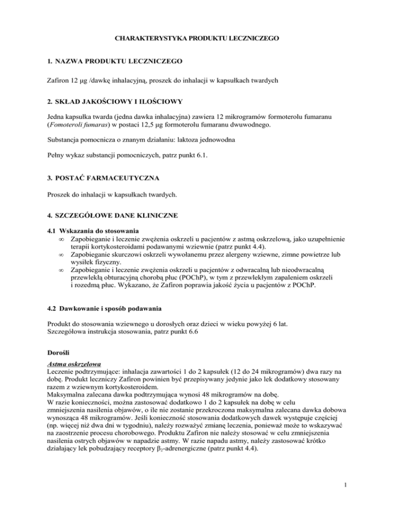 CHARAKTERYSTYKA PRODUKTU LECZNICZEGO 1. NAZWA PRODUKTU LECZNICZEGO Zafiron 12 μg /dawkę inhalacyjną, proszek do inhalacji w kapsułkach twardych 2. SKŁAD JAKOŚCIOWY I ILOŚCIOWY Jedna kapsułka twarda (jedna dawka inhalacyjna) zawiera 12 mikrogramów formoterolu fumaranu (Fomoteroli fumaras) w postaci 12,5 μg formoterolu fumaranu dwuwodnego. Substancja pomocnicza o znanym działaniu: laktoza jednowodna Pełny wykaz substancji pomocniczych, patrz punkt 6.1. 3. POSTAĆ FARMACEUTYCZNA Proszek do inhalacji w kapsułkach twardych. 4. SZCZEGÓŁOWE DANE KLINICZNE 4.1 Wskazania do stosowania • Zapobieganie i leczenie zwężenia oskrzeli u pacjentów z astmą oskrzelową, jako uzupełnienie terapii kortykosteroidami podawanymi wziewnie (patrz punkt 4.4). • Zapobieganie skurczowi oskrzeli wywołanemu przez alergeny wziewne, zimne powietrze lub wysiłek fizyczny. • Zapobieganie i leczenie zwężenia oskrzeli u pacjentów z odwracalną lub nieodwracalną przewlekłą obturacyjną chorobą płuc (POChP), w tym z przewlekłym zapaleniem oskrzeli i rozedmą płuc. Wykazano, że Zafiron poprawia jakość życia u pacjentów z POChP. 4.2 Dawkowanie i sposób podawania Produkt do stosowania wziewnego u dorosłych oraz dzieci w wieku powyżej 6 lat. Szczegółowa instrukcja stosowania, patrz punkt 6.6 Dorośli Astma oskrzelowa Leczenie podtrzymujące: inhalacja zawartości 1 do 2 kapsułek (12 do 24 mikrogramów) dwa razy na dobę. Produkt leczniczy Zafiron powinien być przepisywany jedynie jako lek dodatkowy stosowany razem z wziewnym kortykosteroidem. Maksymalna zalecana dawka podtrzymująca wynosi 48 mikrogramów na dobę. W razie konieczności, można zastosować dodatkowo 1 do 2 kapsułek na dobę w celu zmniejszenia nasilenia objawów, o ile nie zostanie przekroczona maksymalna zalecana dawka dobowa wynosząca 48 mikrogramów. Jeśli konieczność stosowania dodatkowych dawek występuje częściej (np. więcej niż dwa dni w tygodniu), należy rozważyć zmianę leczenia, ponieważ może to wskazywać na zaostrzenie procesu chorobowego. Produktu Zafiron nie należy stosować w celu zmniejszenia nasilenia ostrych objawów w napadzie astmy. W razie napadu astmy, należy zastosować krótko działający lek pobudzający receptory β2-adrenergiczne (patrz punkt 4.4). 1 Zapobieganie skurczowi oskrzeli wywołanemu przez wysiłek fizyczny lub alergeny Wdychanie zawartości jednej kapsułki (12 mikrogramów) przynajmniej 15 minut przed wysiłkiem fizycznym lub narażeniem na alergen. W celu zapobiegania skurczowi oskrzeli u pacjentów z silnym skurczem oskrzeli w wywiadzie, może być konieczne zastosowanie 2 kapsułek do inhalacji (24 mikrogramów). U pacjentów z przewlekłą astmą, klinicznie wskazane jest stosowanie produktu leczniczego Zafiron w celu zapobiegania skurczowi oskrzeli wywołanemu przez wysiłek fizyczny lub alergeny, jednak leczenie astmy powinno również obejmować terapię z zastosowaniem wziewnego kortykosteroidu. Przewlekła obturacyjna choroba płuc Leczenie podtrzymujące: inhalacja zawartości 1 do 2 kapsułek do inhalacji (12 do 24 μg) dwa razy na dobę. Dzieci w wieku powyżej 6 lat Astma oskrzelowa Leczenie podtrzymujące: inhalacja zawartości 1 kapsułki do inhalacji (12 μg) dwa razy na dobę. Produkt leczniczy Zafiron powinien być przepisywany jedynie jako lek dodatkowy stosowany razem z wziewnym kortykosteroidem. Nie należy stosować formoterolu u dzieci w wieku do 6 lat ze względu na brak wystarczającego doświadczenia klinicznego w tej grupie. U dzieci w wieku od 6 do 12 lat zaleca się zastosowanie leczenia produktem złożonym zawierającym wziewny kortykosteroid oraz długo działający lek pobudzający receptory β2-adrenergiczne, z wyjątkiem przypadków, kiedy wymagane jest zastosowanie oddzielnie wziewnego kortykosteroidu oraz długo działającego leku pobudzającego receptory β2-adrenergiczne (patrz punkty 4.4 i 4.8). Maksymalna zalecana dawka wynosi 24 mikrogramy na dobę. Nie należy stosować produktu Zafiron w celu zmniejszenia nasilenia ostrych objawów astmy. W przypadku wystąpienia ostrego napadu astmy, należy zastosować krótko działający lek pobudzający receptory β2-adrenergiczne (patrz punkt 4.4). Zapobieganie skurczowi oskrzeli wywołanemu przez wysiłek fizyczny lub alergeny Wdychanie zawartości jednej kapsułki do inhalacji (12 mikrogramów) przynajmniej 15 minut przed wysiłkiem fizycznym lub narażeniem na alergen. U pacjentów z przewlekłą astmą, stosowanie produktu leczniczego Zafiron w celu zapobiegania skurczowi oskrzeli wywołanemu przez wysiłek fizyczny lub alergeny jest klinicznie wskazane, jednak leczenie astmy powinno również obejmować terapię z zastosowaniem wziewnego kortykosteroidu. Nie zaleca się stosowania produktu Zafiron u dzieci w wieku poniżej 6 lat. Dorośli i dzieci w wieku powyżej 6 lat: Działanie rozszerzające oskrzela utrzymuje się przez 12 godzin po inhalacji produktu Zafiron. Dlatego też, leczenie podtrzymujące, polegające na stosowaniu leku dwa razy na dobę, przyczynia się w większości przypadków do ustąpienia zwężenia oskrzeli, związanego ze stanami przewlekłymi, zarówno w ciągu dnia, jak i w nocy. 4.3 Przeciwwskazania Nadwrażliwość na formoterol, laktozę (która zawiera niewielką ilość białek mleka) lub na którąkolwiek substancję pomocniczą wymienioną w punkcie 6.1. 4.4 Specjalne ostrzeżenia i środki ostrożności dotyczące stosowania 2 Formoterol, substancja czynna produktu Zafiron, należy do grupy długo działających leków pobudzających receptory β2-adrenergiczne. W badaniu z salmeterolem, innym długo działającym lekiem pobudzającym receptory β2-adrenergiczne, zaobserwowano wyższy wskaźnik śmiertelności spowodowanej astmą u pacjentów leczonych salmeterolem (13/13176) niż w grupie pacjentów otrzymujących placebo (3/13179). Nie przeprowadzono odpowiednich badań w celu stwierdzenia, czy wskaźnik śmiertelności związanej z ast