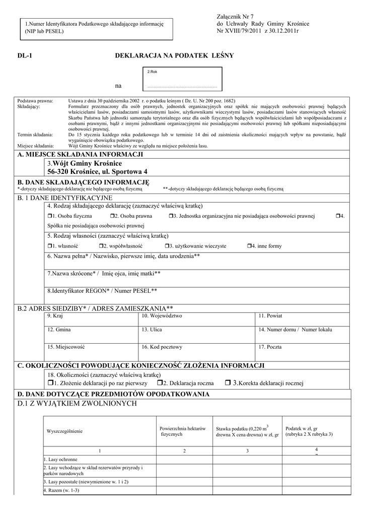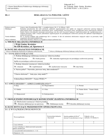 Załącznik Nr 7 do Uchwały Rady Gminy Krośnice Nr XVIII/79/2011 z 30.12.2011r 1.Numer Identyfikatora Podatkowego składającego informację (NIP lub PESEL) ………………………………………………………………… ………… DEKLARACJA NA PODATEK LEŚNY DL-1 2.Rok na Podstawa prawna: Składający: Termin składania: Miejsce składania: ………………………………………………… Ustawa z dnia 30 października 2002 r. o podatku leśnym ( Dz. U. Nr 200 poz. 1682) Formularz przeznaczony dla osób prawnych, jednostek organizacyjnych oraz spółek nie mających osobowości prawnej będących właścicielami lasów, posiadaczami samoistnymi lasów, użytkownikami wieczystymi lasów, posiadaczami lasów stanowiących własność Skarbu Państwa lub jednostki samorządu terytorialnego oraz dla osób fizycznych będących współwłaścicielami lub współposiadaczami z osobami prawnymi, bądź z innymi jednostkami organizacyjnymi nie posiadającymi osobowości prawnej lub spółkami nieposiadającymi osobowości prawnej. Do 15 stycznia każdego roku podatkowego lub w terminie 14 dni od zaistnienia okoliczności mających wpływ na powstanie, bądź wygaśnięcie obowiązku podatkowego. Wójt Gminy Krośnice właściwy ze względu na miejsce położenia lasu. A. MIEJSCE SKŁADANIA INFORMACJI 3.Wójt Gminy Krośnice 56-320 Krośnice, ul. Sportowa 4 B. DANE SKŁADAJĄCEGO INFORMACJĘ *-dotyczy składającego deklarację nie będącego osobą fizyczną **-dotyczy składającego deklarację będącego osobą fizyczną B. 1 DANE IDENTYFIKACYJNE 4. Rodzaj składającego deklarację (zaznaczyć właściwą kratkę) 1. Osoba fizyczna 2. Osoba prawna 3. Jednostka organizacyjna nie posiadająca osobowości prawnej 4. Spółka nie posiadająca osobowości prawnej 5. Rodzaj własności (zaznaczyć właściwą kratkę) 1. własność 2. współwłasność 3. użytkowanie wieczyste 4. inne formy 6. Nazwa pełna* / Nazwisko, pierwsze imię, data urodzenia** 7.Nazwa skrócone* / Imię ojca, imię matki** 8.Identyfikator REGON* / Numer PESEL** B.2 ADRES SIEDZIBY* / ADRES ZAMIESZKANIA** 9. Kraj 10. Województwo 11. Powiat 12. Gmina 13. Ulica 14. Numer domu / Numer lokalu 15. Miejscowość 16. Kod pocztowy 17. Poczta C. OKOLICZNOŚCI POWODUJĄCE KONIECZNOŚĆ ZŁOŻENIA INFORMACJI 18. Okoliczności (zaznaczyć właściwą kratkę) 1. Złożenie deklaracji po raz pierwszy 2. Deklaracja roczna 3.Korekta deklaracji rocznej D. DANE DOTYCZĄCE PRZEDMIOTÓW OPODATKOWANIA D.1 Z WYJĄTKIEM ZWOLNIONYCH Powierzchnia hektarów fizycznych Wyszczególnienie 1 1. Lasy ochronne 2. Lasy wchodzące w skład rezerwatów przyrody i parków narodowych 3. Lasy pozostałe (niewymienione w. 1 i 2) 4. Razem (w. 1-3) 2 3 Stawka podatku (0,220 m drewna X cena drewna) w zł, gr 3 Podatek w zł, gr (rubryka 2 X rubryka 3) 4 7 E. INFORMACJA O PRZEDMIOTACH ZWOLNIONYCH (podać powierzchnię zwolnionego lasu oraz przepis prawa z jakiego tytułu występuje zwolnienie) F. OŚWIADCZENIE I PODPIS SKŁADAJĄCEGO / OSOBY REPREZENTUJĄCEJ SKŁADAJĄCEGO Oświadczam, że podane przez mnie dane są zgodne z prawdą i znane mi są przepisy Kodeksu Karnego Skarbowego o odpowiedzialności za podanie danych niezgodnych z rzeczywistością. 19. Imię 20. Nazwisko 21. Data wypełnienia (dzień – miesiąc- rok) 22. Podpis (pieczęć) składającego / osoby reprezentującej składającego G. ADNOTACJE ORGANU PODATKOWEGO 23. Uwagi organu podatkowego 24. Data 25. Podpis przyjmującego formularz W przypadku niewpłacenia w obowiązujących terminach i ratach kwoty podatku lub wpłacenia jej w niepełnej wysokości, niniejsza deklaracja stanowi podstawę do wystawienia Tytułu wykonawczego, zgodnie z przepisami ustawy z dnia 17 czerwca 1966 r. o postępowaniu egzekucyjnym w administracji (tekst jedn: Dz. U. z 2005 r. Nr. 229, poz. 1954 z późn. zm.)