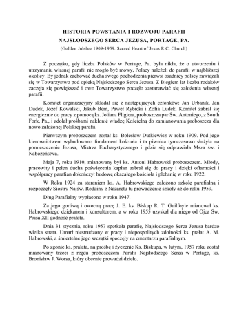 HISTORIA POWSTANIA I ROZWOJU PARAFII NAJSŁODSZEGO SERCA JEZUSA, PORTAGE, PA. (Golden Jubilee 1909-1959. Sacred Heart of Jesus R.C. Church) Z początku, gdy liczba Polaków w Portage, Pa. była nikła, że o utworzeniu i utrzymaniu własnej parafii nie mogło być mowy, Polacy należeli do parafii w najbliższej okolicy. By jednak zachować ducha swego pochodzenia pierwsi osadnicy polscy zawiązali się w Towarzystwo pod opieką Najsłodszego Serca Jezusa. Z Biegiem lat liczba rodaków zaczęła się powiększać i owe Towarzystwo poczęło zastanawiać się założenia własnej parafii. Komitet organizacyjny składał się z następujących członków: Jan Urbanik, Jan Dudek, Józef Kowalski, Jakub Bem, Paweł Rybicki i Zofia Ludek. Komitet zabrał się energicznie do pracy z pomocą ks. Joliana Fligiera, proboszcza par Św. Antoniego, z South Fork, Pa., i zdołał prośbami nakłonić władzę Kościelną do zamianowania proboszcza dla nowo założonej Polskiej parafii. Pierwszym proboszczem został ks. Bolesław Dutkiewicz w roku 1909. Pod jego kierownictwem wybudowano fundament kościoła i ta piwnica tymczasowo służyła na pomieszczenie Jezusa, Mistrza Eucharystycznego i gdzie się odprawiała Msza św. i Nabożeństwa. Maja 7, roku 1910, mianowany był ks. Antoni Habrowski proboszczem. Młody, pracowity i pełen ducha poświęcenia kapłan zabrał się do pracy i dzięki ofiarności i współpracy parafian dokończył budowę okazałego kościoła i plebanię w roku 1922. W Roku 1924 za staraniem ks. A. Habrowskiego założono szkołę parafialną i rozpoczęły Siostry Najśw. Rodziny z Nazaretu tu prowadzenie szkoły aż do roku 1959. Dług Parafialny wypłacono w roku 1947. Za jego gorliwą i owocną pracę J. E. ks. Biskup R. T. Guilfoyle mianował ks. Habrowskiego dziekanem i konsultorem, a w roku 1955 uzyskał dla niego od Ojca Św. Piusa XII godność prałata. Dnia 31 stycznia, roku 1957 spotkała parafię, Najsłodszego Serca Jezusa bardzo wielka strata. Umarł niestrudzony w pracy i niepospolitych zdolności ks. prałat A. M. Habrowski, a śmiertelne jego szczątki spoczęły na cmentarzu parafialnym. Po zgonie ks. prałata, na prośbę i życzenie Ks. Biskupa, w lutym, 1957 roku został mianowany trzeci z rzędu proboszczem Parafii Najsłodszego Serca w Portage, ks. Bronisław J. Worsa, który obecnie prowadzi dzieło.