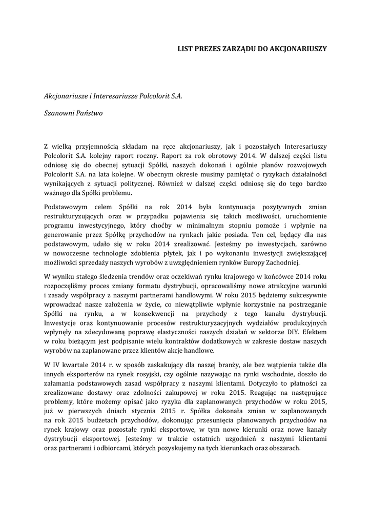 LIST PREZES ZARZĄDU DO AKCJONARIUSZY Akcjonariusze i Interesariusze Polcolorit S.A. Szanowni Państwo Z wielką przyjemnością składam na ręce akcjonariuszy, jak i pozostałych Interesariuszy Polcolorit S.A. kolejny raport roczny. Raport za rok obrotowy 2014. W dalszej części listu odniosę się do obecnej sytuacji Spółki, naszych dokonań i ogólnie planów rozwojowych Polcolorit S.A. na lata kolejne. W obecnym okresie musimy pamiętać o ryzykach działalności wynikających z sytuacji politycznej. Również w dalszej części odniosę się do tego bardzo ważnego dla Spółki problemu. Podstawowym celem Spółki na rok 2014 była kontynuacja pozytywnych zmian restrukturyzujących oraz w przypadku pojawienia się takich możliwości, uruchomienie programu inwestycyjnego, który choćby w minimalnym stopniu pomoże i wpłynie na generowanie przez Spółkę przychodów na rynkach jakie posiada. Ten cel, będący dla nas podstawowym, udało się w roku 2014 zrealizować. Jesteśmy po inwestycjach, zarówno w nowoczesne technologie zdobienia płytek, jak i po wykonaniu inwestycji zwiększającej możliwości sprzedaży naszych wyrobów z uwzględnieniem rynków Europy Zachodniej. W wyniku stałego śledzenia trendów oraz oczekiwań rynku krajowego w końcówce 2014 roku rozpoczęliśmy proces zmiany formatu dystrybucji, opracowaliśmy nowe atrakcyjne warunki i zasady współpracy z naszymi partnerami handlowymi. W roku 2015 będziemy sukcesywnie wprowadzać nasze założenia w życie, co niewątpliwie wpłynie korzystnie na postrzeganie Spółki na rynku, a w konsekwencji na przychody z tego kanału dystrybucji. Inwestycje oraz kontynuowanie procesów restrukturyzacyjnych wydziałów produkcyjnych wpłynęły na zdecydowaną poprawę elastyczności naszych działań w sektorze DIY. Efektem w roku bieżącym jest podpisanie wielu kontraktów dodatkowych w zakresie dostaw naszych wyrobów na zaplanowane przez klientów akcje handlowe. W IV kwartale 2014 r. w sposób zaskakujący dla naszej branży, ale bez wątpienia także dla innych eksporterów na rynek rosyjski, czy ogólnie nazywając na rynki wschodnie, doszło do załamania podstawowych zasad współpracy z naszymi klientami. Dotyczyło to płatności za zrealizowane dostawy oraz zdolności zakupowej w roku 2015. Reagując na następujące problemy, które możemy opisać jako ryzyka dla zaplanowanych przychodów w roku 2015, już w pierwszych dniach stycznia 2015 r. Spółka dokonała zmian w zaplanowanych na rok 2015 budżetach przychodów, dokonując przesunięcia planowanych przychodów na rynek krajowy oraz pozostałe rynki eksportowe, w tym nowe kierunki oraz nowe kanały dystrybucji eksportowej. Jesteśmy w trakcie ostatnich uzgodnień z naszymi klientami oraz partnerami i odbiorcami, których pozyskujemy na tych kierunkach oraz obszarach. Uwzględniając działania jakie prowadzimy, realne plany jakie analizujemy w ich skutkach i wpływie na przychody, uprawniają mnie do optymistycznego stwierdzenia, że rokowania w zakresie wykonania naszych ambitnych planów zwiększenia przychodów Spółki oraz jej rentowności są wykonalne. W tym miejscu chciałabym skierować szczególne podziękowania do naszych Akcjonariuszy za wsparcie dla wszelkich działań prowadzonych przez Spółkę. Wyrazy szacunku składam naszym klientom i partnerom handlowym za owocną współpracę, zaufanie i lojalność. Słowa uznania należą się całej załodze Polcolorit S.A., dzięki której zaangażowaniu i ofiarności osiągnęliśmy wymierne rezultaty. Pozostaję z poważaniem, Prezes Zarządu Polcolorit S.A. Barbara Urbaniak – Marconi