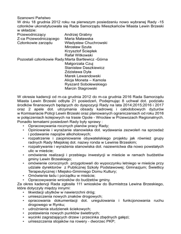 Szanowni Państwo W dniu 18 grudnia 2012 roku na pierwszym posiedzeniu nowo wybranej Rady -15 członków ukonstytuowała się Rada Samorządu Mieszkańców Miasta Lewin Brzeski w składzie: Przewodniczący Andrzej Grabny Z-ca Przewodniczącego Maria Maławska Członkowie zarządu Władysław Chuchrowski Mirosław Szuta Krzysztof Ściepłek Rafał Witkowski Pozostali członkowie Rady:Marta Bartlewicz -Górna Małgorzata Czuj Stanisław Daszkiewicz Zdzisława Dyła Marek Lewandowski Alicja Moneta – Kamola Ryszard Sobolewskiego Marcin Stagrowski W okresie kadencji od m-ca grudnia 2012 do m-ca grudnia 2016 Rada Samorządu Miasta Lewin Brzeski odbyła 21 posiedzeń, Podejmując 8 uchwał dot. podziału środków finansowych będących do dyspozycji Rady na lata 2014;2015;2016 i 2017 oraz 2 apele dot. utrzymania obsady kadrowej i całodobowych dyżurów w Komisariacie Policji Lewin Brzeski oraz planowanych ograniczeniach od roku 2016 w połączeniach kolejowych na trasie Opole - Wrocław w Przewozach Regionalnych. Ponadto tematami posiedzeń Rady były sprawy : • Opracowywania rocznych planów pracy Rady; • Opiniowanie i wyrażanie stanowiska dot. wydawania zezwoleń na sprzedaż i podawanie napojów alkoholowych; • rozpatrzenie i zaopiniowanie obywatelskiego projektu jak również grupy radnych Rady Miejskiej dot. nazwy ronda w Lewinie Brzeskim; • rozpatrywanie i wyrażenia stanowiska dot. nazewnictwa dla nowo powstałych ulic w mieście; • omówienie realizacji i przebiegu inwestycji w mieście w ramach budżetów gminy Lewin Brzeskiego; • omówienie corocznych przygotowań do wypoczynku letniego w mieście przy udziale dyrektorów z Publicznej Szkoły Podstawowej; Gimnazjum; Świetlicy Terapeutycznej i Miejsko-Gminnego Domu Kultury; • Omówienie ładu i porządku w mieście; • Opracowywanie wniosków do budżetów gminy. Za okres kadencji Rada zgłosiła 111 wniosków do Burmistrza Lewina Brzeskiego, które dotyczyły między innymi: • likwidacji ubytków w nawierzchni dróg; • umieszczenia nowych znaków drogowych; • opracowania dokumentacji dot. uregulowania i funkcjonowania ruchu drogowego w Rynku; • udrożnienia studzienek ściekowych; • postawienia nowych punktów świetlnych; • wycinki zagrażających drzew i przecinka zbędnych gałęzi; • umieszczenia stojaków na rowery - dworzec PKP; • • • • • • • • • • • • uporządkowania ronda i jego ozdobienie; przeprowadzenie odkomarzania na terenie miasta i gminy; wykonania chodnika między Lewinem Brzeskim a Kantorowicami; przecięcia drzew na cmentarzu; wykonania parkingu koło cmentarza; wykonania przejść dla pieszych na ulicy Kościuszki i Moniuszki do Market „Biedronka”; wykonania nowych chodników; wykoszenia rowów ul. Kolejowa, Aleja Wojska Polskiego; rozwiązania problemów parkowania samochodów ul. Pocztowa, Narutowicza; Aleja Wojska Polskiego; parkowania samochodów i utrzymania porządku na placu targowym; modernizacji zjazdów do Lewina Brzeskiego od strony Skorogoszczy i Łosiowa; parkowania samochodów na zieleńcach i wałach ppożarowych oraz utrzymania porządku na terenie rekreacyjnym w mieście Lewin Brzeski. Na wszystkie wnioski Rada otrzymywała pisemne odpowiedzi dot. przekazania ich do realizacji względnie ich nie uwzględnienia z uzasadnieniem o czym Przewodniczący informował członków Rady podczas posiedzeń. Środki finansowe jakie Rada otrzymywała do swojej dyspozycji większości były przeznaczane na inwestycje w mieści zgodnie z statutem Rady w tym: • Remont ul. Ochronna; • Wykonanie placu zabaw koło Orlika; • Modernizacja placu zabaw na osiedlu Zatorze; • Wymiana okien w budynku przy ul. Kościuszki 52; • Wykonanie ogrodzenia od strony palcu składowego przy obiekcie sportowym „Olimpia” Lewin Brzeski; • Dofinansowanie zakupu kosiarki; • Wykonanie chodnika Lewin Brzeski – Kantorowice; • Wykonanie alejek na cmentarzu wraz w przecinką drzew-w roku 2017. Na realizacje oczekują dwa zadania tj. wykonanie chodnika Lewin Brzeski Kantorowice; modernizacja placu zabaw na osiedlu Zatorze. Pozostałe środki finansowe były przeznaczana na wsparcie: • OSP w Lewinie Brzeskim -zakup mundurów; • Stowarzyszenie Osób Przyjaciół Osób Niepełnosprawnych „Pomóżmy Im” w Lewinie Brzeskim – zakup materiałów remontowych; • Wsparcie klubu sportowego „Olimpia” Lewin Brzeski – dofinansowanie piecyka gazowego c.o.; • Utrzymanie placów zabaw - ul. Dzierżonia w Lewinie Brzeskim; • Organizacja wypoczynku letniego + ferie; • Wsparcie Gimnazjalnego klubu sportowego -zakup sprzętu oraz promocję miasta w tym: Organizacja imprez kulturalnych - Herody; Plener malarski; Memoriał im .Mieczysława Kawiaka, Memoriał im. Jerzego Sporina; Organizacja Turnieju bokserskiego; Organizacja Biegów Ulicznych „ Lewin Biega”. Przewodniczący Rady Samorządu brał udział w posiedzeniach Komisji Rozwoju Gospodarczego Rady Miejskiej oraz zapraszany jest na sesje Rady Miejskiej. Ponadto członek Rady brał udział w pracach komisji w konkursie „Piękna Wieś”. Wszystkie posiedzenia Rady Samorządu Miasta jak i posiedzenia Zarządu były protokółowane. Protokoły z posiedzeń Rady są publikowane w Biuletynie Informacji Publicznej Urzędu Miejskiego w Lewinie Brzeskim w zakładce Jednostki pomocnicze - Rada Samorządu Mieszkańców-kadencja 2012-2016. Na zakończenie chciałbym podziękować P. Burmistrzowi za dobrą współpracę i udział w posiedzeniach Rady; Radnym Rady Miejskiej z miasta Lewin Brzeski za współpracę i udział w posiedzeniach Rady oraz Wam Panią i Panom członkom Rady Samorządu Miasta Lewin Brzeski za współpracę i pracę w Radzie. Dziękuję. Przewodniczący Rady Samorządu Miasta Lewin Brzeski Andrzej Grabny