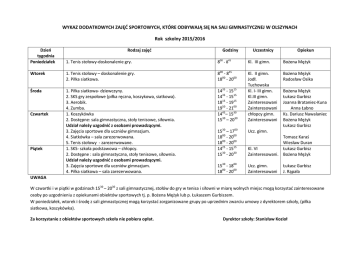 WYKAZ DODATKOWYCH ZAJĘD SPORTOWYCH, KTÓRE ODBYWAJĄ SIĘ NA SALI GIMNASTYCZNEJ W OLSZYNACH Rok szkolny 2015/2016 Dzieo tygodnia Poniedziałek Rodzaj zajęd Godziny Uczestnicy Opiekun 1. Tenis stołowy-doskonalenie gry. 800 - 845 Kl. III gimn. Bożena Mężyk Wtorek 1. Tenis stołowy – doskonalenie gry. 2. Piłka siatkowa. 800 - 845 1800 - 2000 Bożena Mężyk Radosław Osika Środa 1. Piłka siatkowa- dziewczyny. 2. SKS gry zespołowe (piłka ręczna, koszykowa, siatkowa). 3. Aerobik. 4. Zumba. 1. Koszykówka 2. Dostępne: sala gimnastyczna, stoły tenisowe, siłownia. Udział należy uzgodnid z osobami prowadzącymi. 3. Zajęcia sportowe dla uczniów gimnazjum. 4. Siatkówka – sala zarezerwowana. 5. Tenis stołowy - zarezerwowane. 1. SKS- szkoła podstawowa – chłopcy. 2. Dostępne : sala gimnastyczna, stoły tenisowe, siłownia. Udział należy uzgodnid z osobami prowadzącymi. 3. Zajęcia sportowe dla uczniów gimnazjum. 4. Piłka siatkowa – sala zarezerwowana. 1435 - 1515 1435 - 1515 1815 - 1915 1950 - 2100 1445– 1530 1530 – 2030 Kl. II gimn. Jodł. Tuchowska Kl. I- III gimn. Kl.III gimn. Zainteresowani Zainteresowani chłopcy gimn. Zainteresowani Czwartek Piątek 1530 – 1700 1800 - 2000 1800 - 2000 1425 - 1515 1530 - 2030 Ucz. gimn. 1530 - 1800 1800 - 2000 Ucz. gimn. Zainteresowani Bożena Mężyk Łukasz Gurbisz Joanna Brataniec-Kuna Anna Łabno Ks. Dariusz Nawalaniec Bożena Mężyk Łukasz Gurbisz Tomasz Karaś Wiesław Duran Kl. VI Łukasz Gurbisz Zainteresowani. Bożena Mężyk Łukasz Gurbisz J. Rąpała UWAGA W czwartki i w piątki w godzinach 1530 – 2030 z sali gimnastycznej, stołów do gry w tenisa i siłowni w miarę wolnych miejsc mogą korzystad zainteresowane osoby po uzgodnieniu z opiekunami obiektów sportowych tj. p. Bożena Mężyk lub p. Łukaszem Gurbiszem. W poniedziałek, wtorek i środę z sali gimnastycznej mogą korzystad zorganizowane grupy po uprzednim zwarciu umowy z dyrektorem szkoły, (piłka siatkowa, koszykówka). Za korzystanie z obiektów sportowych szkoła nie pobiera opłat. Dyrektor szkoły: Stanisław Kozioł