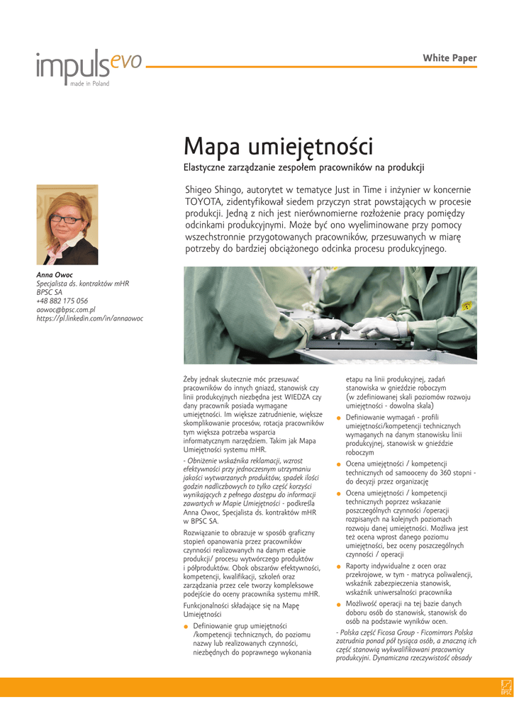 White Paper Mapa umiejêtnoœci Elastyczne zarz¹dzanie zespo³em pracowników na produkcji Shigeo Shingo, autorytet w tematyce Just in Time i in¿ynier w koncernie TOYOTA, zidentyfikowa³ siedem przyczyn strat powstaj¹cych w procesie produkcji. Jedn¹ z nich jest nierównomierne roz³o¿enie pracy pomiêdzy odcinkami produkcyjnymi. Mo¿e byæ ono wyeliminowane przy pomocy wszechstronnie przygotowanych pracowników, przesuwanych w miarê potrzeby do bardziej obci¹¿onego odcinka procesu produkcyjnego. Anna Owoc Specjalista ds. kontraktów mHR BPSC SA +48 882 175 056 [email protected] https://pl.linkedin.com/in/annaowoc ¯eby jednak skutecznie móc przesuwaæ pracowników do innych gniazd, stanowisk czy linii produkcyjnych niezbêdna jest WIEDZA czy dany pracownik posiada wymagane umiejêtnoœci. Im wiêksze zatrudnienie, wiêksze skomplikowanie procesów, rotacja pracowników tym wiêksza potrzeba wsparcia informatycznym narzêdziem. Takim jak Mapa Umiejêtnoœci systemu mHR. - Obni¿enie wskaŸnika reklamacji, wzrost efektywnoœci przy jednoczesnym utrzymaniu jakoœci wytwarzanych produktów, spadek iloœci godzin nadliczbowych to tylko czêœæ korzyœci wynikaj¹cych z pe³nego dostêpu do informacji zawartych w Mapie Umiejêtnoœci - podkreœla Anna Owoc, Specjalista ds. kontraktów mHR w BPSC SA. Rozwi¹zanie to obrazuje w sposób graficzny stopieñ opanowania przez pracowników czynnoœci realizowanych na danym etapie produkcji/ procesu wytwórczego produktów i pó³produktów. Obok obszarów efektywnoœci, kompetencji, kwalifikacji, szkoleñ oraz zarz¹dzania przez cele tworzy kompleksowe podejœcie do oceny pracownika systemu mHR. Funkcjonalnoœci sk³adaj¹ce siê na Mapê Umiejêtnoœci Definiowanie grup umiejêtnoœci l /kompetencji technicznych, do poziomu nazwy lub realizowanych czynnoœci, niezbêdnych do poprawnego wykonania etapu na linii produkcyjnej, zadañ stanowiska w gnieŸdzie roboczym (w zdefiniowanej skali poziomów rozwoju umiejêtnoœci - dowolna skala) Definiowanie wymagañ - profili l umiejêtnoœci/kompetencji technicznych wymaganych na danym stanowisku linii produkcyjnej, stanowisk w gnieŸdzie roboczym Ocena umiejêtnoœci / kompetencji l technicznych od samooceny do 360 stopni do decyzji przez organizacjê Ocena umiejêtnoœci / kompetencji l technicznych poprzez wskazanie poszczególnych czynnoœci /operacji rozpisanych na kolejnych poziomach rozwoju danej umiejêtnoœci. Mo¿liwa jest te¿ ocena wprost danego poziomu umiejêtnoœci, bez oceny poszczególnych czynnoœci / operacji Raporty l indywidualne z ocen oraz przekrojowe, w tym - matryca poliwalencji, wskaŸnik zabezpieczenia stanowisk, wskaŸnik uniwersalnoœci pracownika Mo¿liwoœæ operacji na tej bazie danych l doboru osób do stanowisk, stanowisk do osób na podstawie wyników ocen. - Polska czêœæ Ficosa Group - Ficomirrors Polska zatrudnia ponad pó³ tysi¹ca osób, a znaczn¹ ich czêœæ stanowi¹ wykwalifikowani pracownicy produkcyjni. Dynamiczna rzeczywistoœæ obsady „Polska czêœæ Ficosa Group – Ficomirrors Polska zatrudnia ponad pó³ tysi¹ca osób, a znaczn¹ ich czêœæ stanowi¹ wykwalifikowani pracownicy produkcyjni. Dynamiczna rzeczywistoœæ obsady poszczególnych stanowisk pracy sprawi³a, ¿e zdecydowaliœmy siê na wdro¿enie Macierzy Umiejêtnoœci. Aplikacja stanowi¹ca czêœæ systemu mHR uruchomiona zosta³a w oparciu o wykorzystywany przez nas od kilku lat system oceny pracowników – ILUO. Dziêki takiemu rozwi¹zaniu proces oceny jest sprawniejszy i mniej czasoch³onny, a jednym z elementów koñcowych jest m.in.. raport umiejêtnoœci technicznych." – zauwa¿a Justyna Sikora, Dyrektor ds. zasobów ludzkich w Ficomirrors Polska Sp. z o.o. poszczególnych stanowisk pracy sprawi³a, ¿e zdecydowaliœmy siê na wdro¿enie mapy poliwalencji. Aplikacja stanowi¹ca czêœæ systemu mHR uruchomiona zosta³a w oparciu o wykorzystywany przez nas od kilku lat system oceny pracowników - ILUO. Dziêki takiemu rozwi¹zaniu proces oceny jest sprawniejszy i mniej czasoch³onny, a jednym z elementów koñcowych jest m.in. raport umiejêtnoœci technicznych - zauwa¿a Justyna Sikora, Dyrektor ds. zasobów ludzkich w Ficomirrors Polska Sp. z o.o. System mHR dziêki licznym funkcjonalnoœci¹ w sposób naturalny automatyzuje procesy zwi¹zane z zarz¹dzaniem ludŸmi. £atwo integruje siê z rozwi¹zaniami kadrowop³acowymi - zarówno w³asnymi jak i Firma Ficomirrors Polska (FMP), dostawca czêœci dla czo³owych marek motoryzacyjnych, koñczy w³aœnie wdro¿enie systemu mHR. 500 pracowników objêtych zosta³o oprogramowaniem w takich obszarach jak zarz¹dzanie kwalifikacjami, kompetencjami, efektywnoœci¹ oraz szkoleniami. Oprogramowanie BPSC SA dedykowane jest zarówno pracownikom etatowym jak i tymczasowym. G³ównym celem stawianym przed wdro¿eniem by³o przede wszystkim ujednolicenie polityki personalnej oraz efektywniejsze zarz¹dzanie procesem ocen pracowniczych. Informacje o kompetencjach i kwalifikacjach pracowników, przechowywane w jednym miejscu, maj¹ pozwoliæ na skuteczne zarz¹dzanie ich zewnêtrznymi tworz¹c kompletne Ÿród³o wiedzy o pracowniku. Firmy wykorzystuj¹ce to rozwi¹zanie podkreœlaj¹ mo¿liwoœæ szybkiego dostêpu do informacji m.in.. o umiejêtnoœciach pracowników, ukoñczonych szkoleniach, uprawnieniach, wynikach oceny pracowniczej, stawianych celach, a tak¿e wynagrodzeniu, premiach czy dodatkowych benefitach. Rozwi¹zanie to spe³nia oczekiwania zarówno producentów jak i poddostawców, a dziêki wersjom jêzykowym otwarty jest na komunikacjê w ramach rozproszonych, miêdzynarodowych struktur. rozwojem, a to natomiast przek³adaæ siê bêdzie na lepsze wyniki przedsiêbiorstwa. Wybrany zestaw funkcjonalnoœci mHR uzupe³nia Macierz Umiejêtnoœci. Firma Ficomirrors Polska (FMP), wchodz¹ca w sk³ad grupy Ficosa International, jest wiod¹cym producentem lusterek samochodowych, zbiorników do systemów spryskiwaczy szyb w E