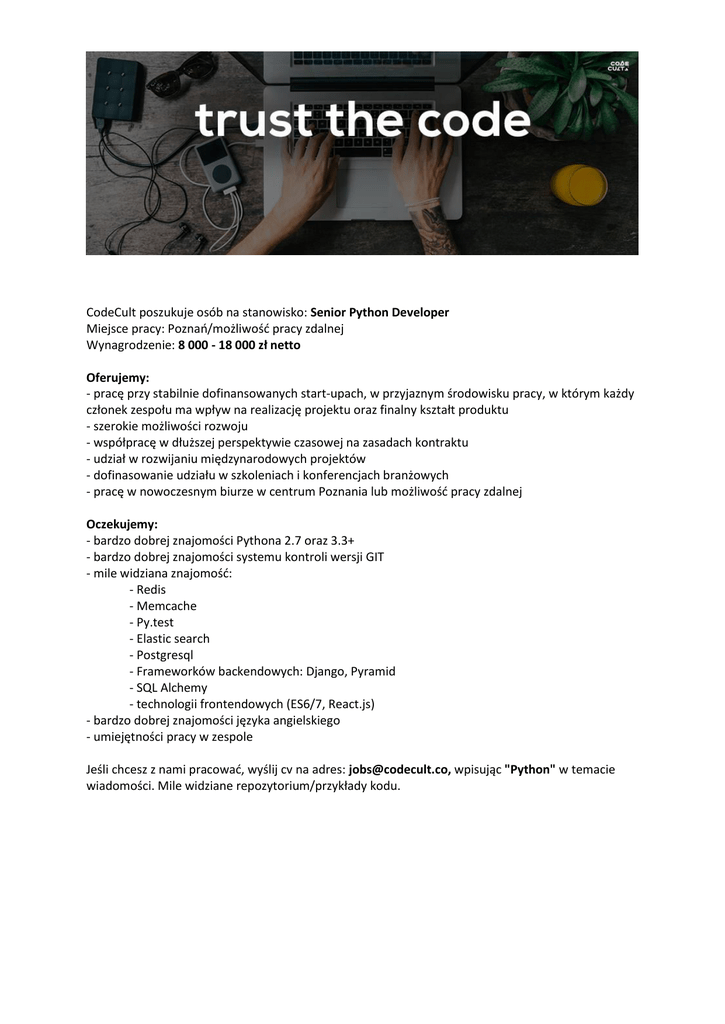 CodeCult poszukuje osób na stanowisko: Senior Python Developer Miejs e pra y: Poz ań/ ożli ość pra y zdal ej Wynagrodzenie: 8 000 - 8 zł netto Oferujemy: - pra ę przy sta il ie dofi a so a y h start-upa h, przyjaz y środo isku pra y, zło ek zespołu a pły a realiza ję projektu oraz fi al y kształt produktu - szerokie ożli oś i roz oju - spółpra ę dłuższej perspekty ie zaso ej a zasada h ko traktu - udział roz ija iu iędzy arodo y h projektó - dofinasowanie udziału szkole ia h i ko fere ja h ra żo y h - pra ę o o zes y iurze e tru Poz a ia lu ożli ość pra y zdal ej który każdy Oczekujemy: - ardzo do rej z ajo oś i Pytho a .7 oraz . + - ardzo do rej z ajo oś i syste u ko troli ersji GIT - mile widzia a z ajo ość: - Redis - Memcache - Py.test - Elastic search - Postgresql - Frameworków backendowych: Django, Pyramid - SQL Alchemy - technologii frontendowych (ES6/7, React.js) - ardzo do rej z ajo oś i języka a gielskiego - u iejęt oś i pracy w zespole Jeśli h esz z a i pra o ać, yślij a adres: [email protected], pisują "Python" w temacie iado oś i. Mile idzia e repozytoriu /przykłady kodu.