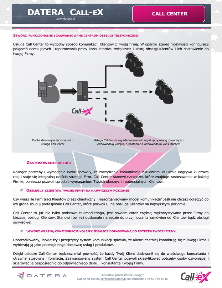 DATERA CALL-EX CALL CENTER www.datera.pl STWÓRZ FUNKCJONALNE I ZAAWANSOWANE CENTRUM OBSŁUGI TELEFONICZNEJ Usługa Call Center to wygodny sposób komunikacji Klientów z Twoją firmą. W oparciu szereg możliwości konfiguracji połączeń oczekujących i raportowania pracy konsultantów, zwiększasz kulturę obsługi Klientów i ich nastawienie do twojej Firmy. Osoba dzwoniąca łączona jest z usługą CallCenter Usługa CallCenter wg zdefiniowanych reguł łączy osobę dzwoniącą z odpowiednią kolejką, a następnie z odpowiednim konsultantem ZASTOSOWANIE USŁUGI Rosnące potrzeby i wymagania rynku sprawiły, że zarządzanie komunikacją z Klientami w Firmie odgrywa kluczową rolę i staje się integralną częścią strategii Firm. Call Center stanowi narzędzie, które znajduje zastosowanie w każdej Firmie, ponieważ pozwoli sprostać wymaganiom Twoich obecnych i potencjalnych Klientów. OBSŁUGUJ KLIENTÓW TWOJEJ FIRMY NA NAJWYŻSZYM POZIOMIE Czy wiesz ile Firm traci Klientów przez chaotyczny i niezorganizowany model komunikacji? Jeśli nie chcesz dołączyć do ich grona zbuduj profesjonale Call Center, które pozwoli Ci na obsługę Klientów na najwyższym poziomie. Call Center to już nie tylko podstawa telemarketingu, jest bowiem coraz częściej wykorzystywane przez Firmy do bieżącej obsługi Klientów. Stanowi również doskonałe narzędzie do przyjmowania zamówień od Klientów bądź obsługi serwisowej. STWÓRZ WŁASNĄ KONFIGURACJĘ KOLEJEK IDEALNIE DOPASOWANĄ DO POTRZEB TWOJEJ FIRMY Uporządkowany, łatwiejszy i przejrzysty system komunikacji sprawia, że Klienci chętniej kontaktują się z Twoją Firmą i wybierają ją jako potencjalnego dostawcę usług i produktów. Dzięki usłudze Call Center będziesz miał pewność, że każdy Twój Klient dodzwonił się do właściwego konsultanta i otrzymał stosowną informację. Zaawansowany system Call Center pozwoli sklasyfikować potrzeby osoby dzwoniącej i skierować ją bezpośrednio do odpowiedniego działu i konsultanta Twojej Firmy. Chciałbyś przetestować usługę? Napisz do nas na [email protected] lub zadzwoń +48 58 739 60 02 DATERA CALL-EX CALL CENTER www.datera.pl ZREDUKUJ KOSZTY PRZY JEDNOCZESNYM WZROŚCIE EFEKTYWNOŚCI Każdej Firmie zależy na generowaniu oszczędności. Czy chciałbyś zatrudniać mniej pracowników, przy jednoczesnym wzroście wydajności ich pracy? Usługa Call Center umożliwi obsłużenie optymalnej liczby zgłoszeń, przy jak najkrótszym czasie obsługi i minimalnym zaangażowaniu pracowników firmy. Dodatkowo pozwoli znacząco zmniejszyć liczbę niewłaściwych (niezrealizowanych) wywołań. KONTROLUJ WYDAJNOŚĆ PRACY KONSULTANTÓW W FIRMIE Wiedza o ruchu telekomunikacyjnym w Twojej Firmie odgrywa istotną rolę. Dzięki systemowi raportowania w usłudze Call Center masz dostęp do informacji, które pomogą zwiększyć wydajność pracy Twojego zespołu. Dzięki raportom ukazującym m. in. czasy oczekiwania w kolejce, statystyki pracy konsultantów, obciążenie kolejek w różnych okresach itp. będziesz mógł dokonać właściwych zmian w budowie systemu. ZMIENIAJ KONFIGURACJĘ SYSTEMU WEDŁUG SWOICH POTRZEB Twoja Firma rozwija się? Wiesz, że w perspektywie czasu powstaną nowe działy, a w związku z tym zwiększyszt zatrudnienie? Nie musisz martwić się, że poświęcisz czas i pieniądze na rozbudowę systemu. Innowacyjność usługi polega między innymi na tym, że została zaprojektowana właśnie z myślą o nowoczesnych i ewoluujących Firmach. Elastyczność systemu Call Center sprawia, że modyfikacje w jego konfiguracji nie są skomplikowane i nie wymagają inwestycji. Będziesz mógł we własnym zakresie, w prosty sposób dodawać lub usuwać konsultantów, zmieniać system kolejek itp. WYKORZYSTAJ W PEŁNI FUNKCJONALNOŚĆ CALL CENTER W POŁĄCZENIU Z INNYMI USŁUGAMI Aby promować swoje produkty, informować Klientów o nowych usługach, przypomnieć im o terminach lub zaległych płatnościach musisz zatrudniać i utrzymywać ogromny zespół ludzi? Powiązanie Call Center z systemem Interaktywnych Zapowiedzi Głosowych lub nagrywaniem połączeń daje Ci wiele korzystnych możliwości. Automatyczne komunikaty pozwolą Ci na jeszcze większą efektywność i przyniosą wymierne korzyści. Chciałbyś przetestować usługę? Napisz do nas na [email protected] lub zadzwoń +48 58 739 60 02