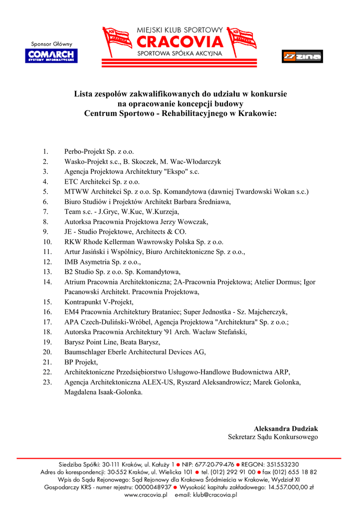 Lista zespołów zakwalifikowanych do udziału w konkursie na opracowanie koncepcji budowy Centrum Sportowo - Rehabilitacyjnego w Krakowie: 1. 2. 3. 4. 5. 6. 7. 8. 9. 10. 11. 12. 13. 14. 15. 16. 17. 18. 19. 20. 21. 22. 23. Perbo-Projekt Sp. z o.o. Wasko-Projekt s.c., B. Skoczek, M. Wac-Włodarczyk Agencja Projektowa Architektury "Ekspo" s.c. ETC Architekci Sp. z o.o. MTWW Architekci Sp. z o.o. Sp. Komandytowa (dawniej Twardowski Wokan s.c.) Biuro Studiów i Projektów Architekt Barbara Średniawa, Team s.c. - J.Gryc, W.Kuc, W.Kurzeja, Autorksa Pracownia Projektowa Jerzy Wowczak, JE - Studio Projektowe, Architects & CO. RKW Rhode Kellerman Wawrowsky Polska Sp. z o.o. Artur Jasiński i Wspólnicy, Biuro Architektoniczne Sp. z o.o., IMB Asymetria Sp. z o.o., B2 Studio Sp. z o.o. Sp. Komandytowa, Atrium Pracownia Architektoniczna; 2A-Pracownia Projektowa; Atelier Dormus; Igor Pacanowski Architekt. Pracownia Projektowa, Kontrapunkt V-Projekt, EM4 Pracownia Architektury Brataniec; Super Jednostka - Sz. Majcherczyk, APA Czech-Duliński-Wróbel, Agencja Projektowa "Architektura" Sp. z o.o.; Autorska Pracownia Architektury '91 Arch. Wacław Stefański, Barysz Point Line, Beata Barysz, Baumschlager Eberle Architectural Devices AG, BP Projekt, Architektoniczne Przedsiębiorstwo Usługowo-Handlowe Budownictwa ARP, Agencja Architektoniczna ALEX-US, Ryszard Aleksandrowicz; Marek Golonka, Magdalena Isaak-Golonka. Aleksandra Dudziak Sekretarz Sądu Konkursowego