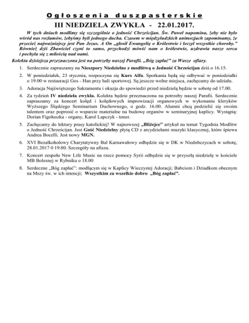 Ogłoszenia duszpasterskie III NIEDZIELA ZWYKŁA - 22.01.2017. W tych dniach modlimy się szczególnie o jedność Chrześcijan. Św. Paweł napomina, żeby nie było wśród nas rozłamów, żebyśmy byli jednego ducha. Czasem w międzyludzkich animozjach zapominamy, że przecież najważniejszy jest Pan Jezus. A On „głosił Ewangelię o Królestwie i leczył wszystkie choroby.” Również dziś Zbawiciel czyni to samo, przychodzi mówić nam o królestwie, uzdrawia nasze serca i pochyla się z miłością nad nami. Kolekta dzisiejsza przeznaczona jest na potrzeby naszej Parafii. „Bóg zapłać” za Wasze ofiary. 1. Serdecznie zapraszamy na Nieszpory Niedzielne z modlitwą o Jedność Chrześcijan dziś o 16.15. 2. W poniedziałek, 23 stycznia, rozpoczyna się Kurs Alfa. Spotkania będą się odbywać w poniedziałki o 19.00 w restauracji Gos - Han przy hali sportowej. Są jeszcze wolne miejsca, zachęcamy do udziału. 3. Adoracja Najświętszego Sakramentu i okazja do spowiedzi przed niedzielą będzie w sobotę od 17.00. 4. Za tydzień IV niedziela zwykła. Kolekta będzie przeznaczona na potrzeby naszej Parafii. Serdecznie zapraszamy za koncert kolęd i kolędowych improwizacji organowych w wykonaniu kleryków Wyższego Śląskiego Seminarium Duchownego, o godz. 16.00. Alumni chcą podzielić się swoim talentem oraz poprosić o wsparcie materialne na budowę organów w seminaryjnej kaplicy. Wystąpią: Dorian Figołuszka - organy, Karol Lapczyk - tenor. 5. Zachęcamy do lektury prasy katolickiej! W najnowszej „Bliżejce” artykuł na temat Tygodnia Modlitw o Jedność Chrześcijan. Jest Gość Niedzielny płytą CD z arcydziełami muzyki klasycznej, które śpiewa Andrea Bocelli. Jest nowy MGN. 6. XVI Bezalkoholowy Charytatywny Bal Karnawałowy odbędzie się w DK w Niedobczycach w sobotę, 28.01.2017 0 19.00. Szczegóły na afiszu. 7. Koncert zespołu New Life Music na rzecz pomocy Syrii odbędzie się w przyszłą niedzielę w kościele MB Bolesnej w Rybniku o 18.00 8. Serdeczne „Bóg zapłać”: modlącym się w Kaplicy Wieczystej Adoracji; Babciom i Dziadkom obecnym na Mszy św. w ich intencji; Wszystkim za wszelkie dobro „Bóg zapłać”.