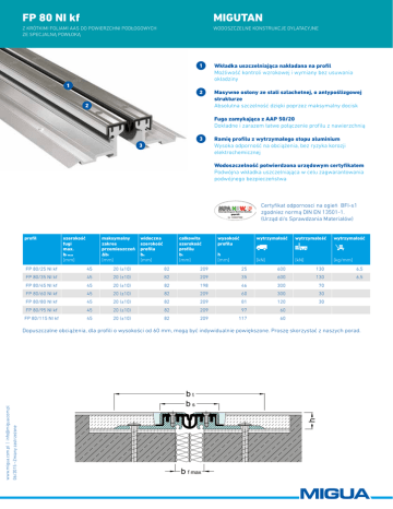 FP 80 NI kf MIGUTAN Z KRÓTKIMI FOLIAMI AAS DO POWIERZCHNI PODŁOGOWYCH ZE SPECJALNĄ POWŁOKĄ WODOSZCZELNE KONSTRUKCJE DYLATACYJNE Wkładka uszczelniająca nakładana na profil Możliwość kontroli wzrokowej i wymiany bez usuwania okładziny Masywne osłony ze stali szlachetnej, o antypoślizgowej strukturze Absolutna szczelność dzięki poprzez maksymalny docisk Fuga zamykająca z AAP 50/20 Dokładne i zarazem łatwe połączenie profilu z nawierzchnią Ramię profilu z wytrzymałego stopu aluminium Wysoka odporność na obciążenia, bez ryzyka korozji elektrochemicznej Wodoszczelność potwierdzona urzędowym certyfikatem Podwójna wkładka uszczelniająca w celu zagwarantowania podwójnego bezpieczeństwa Certyfikat odpornosci na ogień BFI-s1 zgodniez normą DIN EN 13501-1. (Urząd d/s Sprawdzania Materiałów) profil szerokość fugi max. bf max [mm] maksymalny zakres przemieszczeń ∆bf [mm] widoczna szerokość profilu bs [mm] całkowita szerokość profilu bt [mm] wysokość profilu h [mm] wytrzymałość wytrzymałość wytrzymałość [kN] [kN] [kg/mm] FP 80/25 NI kf 45 20 (±10) 82 209 25 600 130 6,5 FP 80/35 NI kf 45 20 (±10) 82 209 35 600 130 6,5 FP 80/45 NI kf 45 20 (±10) 82 198 46 300 70 FP 80/60 NI kf 45 20 (±10) 82 209 60 300 30 FP 80/80 NI kf 45 20 (±10) 82 209 81 120 30 FP 80/95 NI kf 45 20 (±10) 82 209 97 60 FP 80/115 NI kf 45 20 (±10) 82 209 117 60 h bt bs 06/2015 –Zmiany zastrzeżone www.migua.com.pl | [email protected] Dopuszczalne obciążenia, dla profili o wysokości od 60 mm, mogą być indywidualnie powiększone. Proszę skorzystać z naszych porad. b f max