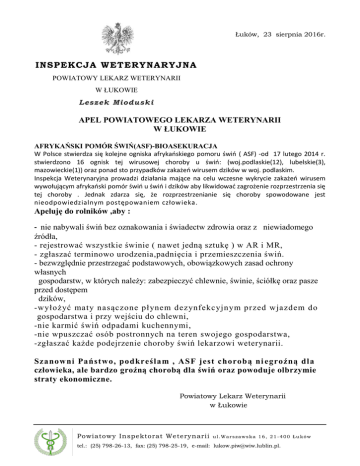 Apel Powiatowego Lekarza Weterynarii w Łukowie.