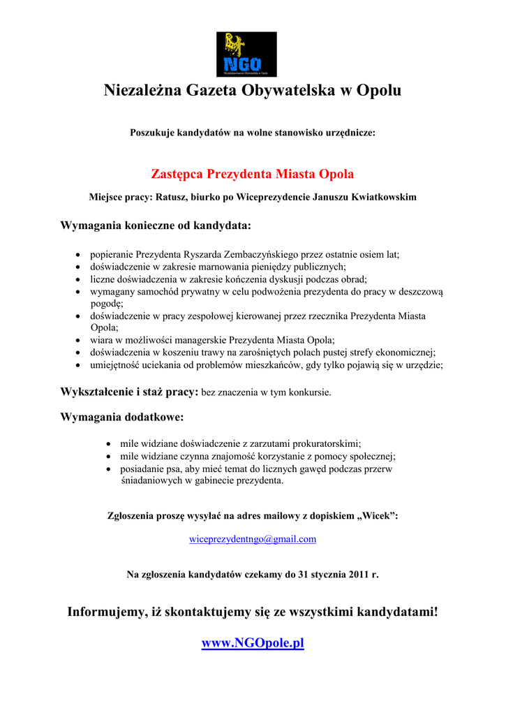 Niezależna Gazeta Obywatelska w Opolu Poszukuje kandydatów na wolne stanowisko urzędnicze: Zastępca Prezydenta Miasta Opola Miejsce pracy: Ratusz, biurko po Wiceprezydencie Januszu Kwiatkowskim Wymagania konieczne od kandydata: popieranie Prezydenta Ryszarda Zembaczyńskiego przez ostatnie osiem lat; doświadczenie w zakresie marnowania pieniędzy publicznych; liczne doświadczenia w zakresie kończenia dyskusji podczas obrad; wymagany samochód prywatny w celu podwożenia prezydenta do pracy w deszczową pogodę; doświadczenie w pracy zespołowej kierowanej przez rzecznika Prezydenta Miasta Opola; wiara w możliwości managerskie Prezydenta Miasta Opola; doświadczenia w koszeniu trawy na zarośniętych polach pustej strefy ekonomicznej; umiejętność uciekania od problemów mieszkańców, gdy tylko pojawią się w urzędzie; Wykształcenie i staż pracy: bez znaczenia w tym konkursie. Wymagania dodatkowe: mile widziane doświadczenie z zarzutami prokuratorskimi; mile widziane czynna znajomość korzystanie z pomocy społecznej; posiadanie psa, aby mieć temat do licznych gawęd podczas przerw śniadaniowych w gabinecie prezydenta. Zgłoszenia proszę wysyłać na adres mailowy z dopiskiem „Wicek”: [email protected] Na zgłoszenia kandydatów czekamy do 31 stycznia 2011 r. Informujemy, iż skontaktujemy się ze wszystkimi kandydatami! www.NGOpole.pl