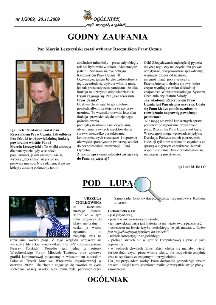 nr 3/2009, 20.11.2009 OGÓLNIAK _________________________________czyli szczegóły o ogółach___________________________________ GODNY ZAUFANIA Pan Marcin Leszczyński został wybrany Rzecznikiem Praw Ucznia Iga Lech : Niedawno został Pan Rzecznikiem Praw Ucznia. Jak odbiera Pan fakt, iż tę odpowiedzialną funkcję powierzono właśnie Panu? Marcin Leszczyński : To wielki zaszczyt dla nauczyciela, gdy w sondażu popularności, jakim niewątpliwie są wybory „rzecznika”, uzyskuje się pierwsze miejsce. Nie sądziłem, iż po raz kolejny zostanę obdarzony takim zaufaniem młodzieży – przez cały ubiegły rok nie było mnie w szkole. Ale teraz już jestem i postaram się być dobrym Rzecznikiem Praw Ucznia. J Oczywiście, jestem bardzo zadowolony z tego, że młodzież wybrała właśnie mnie, jednak przez cały czas pamiętam , że taka funkcja to olbrzymia odpowiedzialność. Czym zajmuje się Pan jako Rzecznik Praw Ucznia? Gdybym chciał ująć to górnolotnie powiedziałbym, iż stoję na straży praw uczniów. To wszystko prawda, lecz taka funkcja sprowadza się do umiejętnego pośredniczenia pomiędzy uczniami a nauczycielami, objaśniania prawnych aspektów danej sprawy, nierzadko poszukiwania kompromisowych rozwiązań i naprawdę niezwykle sporadycznie (w naszej szkole) do bezpośrednich interwencji u Pani Dyrektor. Z jakimi sprawami młodzież zwraca się do Pana najczęściej? Och! Zdecydowanie najczęściej pytania dotyczą tego, czy nauczyciel ma prawo: odpytywać, przeprowadzać sprawdziany, wymagać czegoś od uczniów, uniemożliwiać poprawę oceny. Przeważnie są to drobne sprawy, które często wynikają z braku dokładniej znajomości Wewnątrzszkolnego Systemu Oceniania czy Statutu Szkoły. Jak wiadomo, Rzecznikiem Praw Ucznia jest Pan nie pierwszy raz. Udało się Panu kiedyś pomóc uczniowi w rozwiązaniu naprawdę poważnego problemu? Nie mogę omawiać konkretnych spraw, ponieważ postępowanie prowadzone przez Rzecznika Praw Ucznia jest tajne. W szczegóły mogę wprowadzać jedynie Dyrekcję. Podczas moich poprzednich kadencji tylko raz miałem do czynienia ze sprawą o cięższym charakterze. Jednak wspólnie z Panią Dyrektor udało nam się rozwiązać ją pozytywnie. Iga Lech kl. IIc LO POD URSZULA CIOŁKOWSKA to uczennica naszego liceum. Mimo że w tym roku uczęszcza do klasy maturalnej i czeka ją ważny egzamin, to znajduje czas na rozwijanie swoich pasji. Z tego względu uczęszcza na warsztaty literackie wrocławskiej filii SPP (Stowarzyszenia Pisarzy Polskich). Ponadto jest jedną z autorek Wrocławskiego Forum Młodych Twórców oraz wystawy grafiki komputerowej połączonej z wieczorkiem autorskim Saloniku Trzech Muz we Wrocławiu organizowanej w czerwcu 2008r. Ula chętnie angażuje się również w życie społeczne naszej szkoły. Rok temu była przewodniczącą LUPĄ Samorządu Uczniowskiego, a także organizowała Konkurs Literacki. Ciekawostki o Uli: - jest jedynaczką, - poszła o rok wcześniej do szkoły, - jej największą pasją jest historia i z nią wiąże swoją przyszłość, - uczęszcza na lekcje języka łacińskiego, bo jak mawia: „ łacina jest najpiękniejszym językiem na świecie”, - udziela korepetycji z angielskiego, - próbuje swoich sił w grafice komputerowej i pracuje jako copywriter, - w wolnych chwilach (choć takich chyba nie ma zbyt wiele) bardzo dużo czyta, pisze własne teksty, ale oczywiście znajduje czas na spotkania ze znajomymi i przyjaciółmi. Ula jest przykładem osoby, która doskonale gospodaruje swoim czasem i dzięki temu stopniowo realizuje wszystkie swoje plany i zamierzenia. OGÓLNIAK nr 3/2009, 20.11.2009 OGÓLNIAK _________________________________czyli szczegóły o ogółach___________________________________ Karolina Pietraszewska kl. IIc LO KTO TRZYMA WŁADZĘ W NASZEJ SZKOLE? Wywiad z Bartoszem Bednarzem – przewodniczącym gimnazjum, uczniem klasy IIIA … Jakie są Twoje wrażenia w związku z objęciem stanowiska przewodniczącego gimnazjum? Jestem bardzo szczęśliwy i czuję się ogromnie usatysfakcjonowany. Byłem pod wrażeniem, gdy okazało się jak duży miałem elektorat. Z tego miejsca jeszcze raz pragnę podziękować wyborcom. Jakie są Twoje plany na tegoroczną kadencję? Mam wiele planów związanych z objęciem tego stanowiska. Przede wszystkim, chcę godnie reprezentować uczniów. Na pewno wiele osób uczących się w naszej szkole ma mnóstwo pomysłów na przydatne zmiany, które mogłyby służyć rozwojowi tej placówki, a także uczniom. Chcę je realizować. To uczniowie są najważniejsi i samorząd powinien dbać o ich dobro. Co byś chciał zmienić w naszej szkole? Na początku chcę uruchomić radiowęzeł. Wielu osobom brakuje dobrej muzyki na przerwach. Planuję też zniesienie podatku od dyskotek szkolnych. W najbliższych tygodniach SU będzie debatował nad tym problemem. Dzięki temu przedsięwzięciu „imprezowe” życie gimnazjum mogłoby być barwniejsze. Samorząd chce też inicjować i wspierać akcje charytatywne. Dobro człowieka to jeden z ważnych celów w naszej pracy. Myślę, że przydałby się także gruntowny remont naszej małej sali gimnastycznej, ale to niestety nie zależy ode mnie. Jaki układa Ci się współpraca z pozostałymi członkami samorządu szkolnego? Dziękuję, nie narzekam. Stanowimy zgraną ekipę. Myślę, że wyborcy nie będą narzekać na swoich wybrańców. Karolina Pietraszewska kl. IIc LO ... i Mateuszem Kempą – przewodniczącym liceum, uczniem klasy Id. (Poniżej drukujemy odpowiedzi na pytania OGÓLNIAKA przesłane przez Mateusza do naszej redakcji) Największy sukces? Hmm…najbardziej cieszy fakt, że pomogliśmy rodzinie, która w wyniku pożaru straciła dach nad głową. Jak układa Ci się współpraca z paniami opiekunkami Samorządu Szkolnego? Można powiedzieć, że znakomicie :-) Każdy wie, o kim mowa i myślę, że nie tylko ja jestem zadowolony :-) Co uważasz za swój najwięk