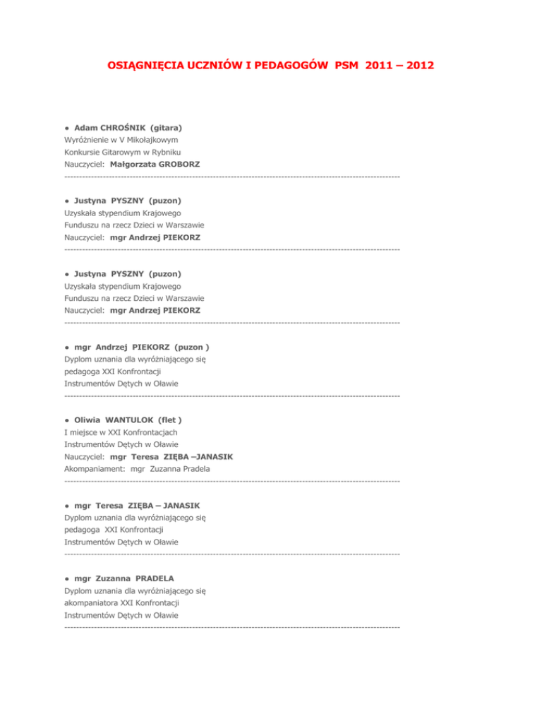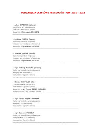 OSIĄGNIĘCIA UCZNIÓW I PEDAGOGÓW PSM 2011 – 2012 ● Adam CHROŚNIK (gitara) Wyróżnienie w V Mikołajkowym Konkursie Gitarowym w Rybniku Nauczyciel: Małgorzata GROBORZ ----------------------------------------------------------------------------------------------------------------● Justyna PYSZNY (puzon) Uzyskała stypendium Krajowego Funduszu na rzecz Dzieci w Warszawie Nauczyciel: mgr Andrzej PIEKORZ ----------------------------------------------------------------------------------------------------------------● Justyna PYSZNY (puzon) Uzyskała stypendium Krajowego Funduszu na rzecz Dzieci w Warszawie Nauczyciel: mgr Andrzej PIEKORZ ----------------------------------------------------------------------------------------------------------------● mgr Andrzej PIEKORZ (puzon ) Dyplom uznania dla wyróżniającego się pedagoga XXI Konfrontacji Instrumentów Dętych w Oławie ----------------------------------------------------------------------------------------------------------------● Oliwia WANTULOK (flet ) I miejsce w XXI Konfrontacjach Instrumentów Dętych w Oławie Nauczyciel: mgr Teresa ZIĘBA –JANASIK Akompaniament: mgr Zuzanna Pradela ----------------------------------------------------------------------------------------------------------------● mgr Teresa ZIĘBA – JANASIK Dyplom uznania dla wyróżniającego się pedagoga XXI Konfrontacji Instrumentów Dętych w Oławie ----------------------------------------------------------------------------------------------------------------● mgr Zuzanna PRADELA Dyplom uznania dla wyróżniającego się akompaniatora XXI Konfrontacji Instrumentów Dętych w Oławie ----------------------------------------------------------------------------------------------------------------- ● Adam CHROŚNIK (gitara) II Nagroda w II Ogólnopolskim Konkursie Gitarowym w Dobczycach Nauczyciel: Małgorzata GROBORZ ----------------------------------------------------------------------------------------------------------------● Paweł CIEŚLAR ( gitara ) Wyróżnienie w II Ogólnopolskim Konkursie Gitarowym w Dobczycach Nauczyciel: Małgorzata GROBORZ ----------------------------------------------------------------------------------------------------------------● Oliwia WANTULOK (flet ) I miejsce w Międzynarodowym Konkursie Fletowym w Jastrzębiu Zdroju Nauczyciel: mgr Teresa ZIĘBA – JANASIK Akompaniament: mgr Zuzanna Pradela ----------------------------------------------------------------------------------------------------------------● Oliwia WANTULOK (flet ) I miejsce w Międzynarodowym Konkursie Fletowym w Jastrzębiu Zdroju Nauczyciel: mgr Teresa ZIĘBA – JANASIK Akompaniament: mgr Zuzanna Pradela ----------------------------------------------------------------------------------------------------------------● Joanna KUPCZAK (skrzypce) Awans do II etapu Forum Młodych Instrumentalistów w Rybniku Nauczyciel: mgr Krzysztof DURLOW Akompaniament: ad. Witold Pieńkowski ----------------------------------------------------------------------------------------------------------------● Bianka KOSECKA (skrzypce) Wyróżnienie w I Cieszyńskim Konkursie Skrzypcowym Nauczyciel: mgr Joanna LUDWIK Akompaniament: mgr Ewa Krupa ----------------------------------------------------------------------------------------------------------------● Joanna KUPCZAK (skrzypce) III miejsce w I Cieszyńskim Konkursie Skrzypcowym Nauczyciel: mgr Krzysztof DURLOW ----------------------------------------------------------------------------------------------------------------● Julia MITAS (skrzypce) Wyróżnienie w I Cieszyńskim Konkursie Skrzypcowym Nauczyciel: mgr Krzysztof DURLOW Akompaniament: ad. Witold Pieńkowski ---------------------------------------------------------------------------------------------------------------● Paweł RIESS (skrzypce) Wyróżnienie w I Cieszyńskim Konkursie Skrzypcowym Nauczyciel: mgr Krzysztof DURLOW Akompaniament: ad. Witold Pieńkowski ----------------------------------------------------------------------------------------------------------------● Bartłomiej PODSIADŁY, Tomasz RAKOWSKI (duet fortepianowy) Wyróżnienie w XIII Festiwalu Dziecięcej i Młodzieżowej Muzyki Instrumentalnej w Rybniku Nauczyciel: mgr Danuta GOCIEK, mgr Danuta HECZKO ----------------------------------------------------------------------------------------------------------------● Daria BRANNY (flet ) I nagroda w XI Ogólnopolskim Wiosennym Festiwalu Fletowym w Sochaczewie Nauczyciel: mgr Dorota PARZYK Akompaniament: mgr Małgorzata Przybyła ----------------------------------------------------------------------------------------------------------------● Kamila STAWARZ (flet) Wyróżnienie w XI Ogólnopolskim Wiosennym Festiwalu Fletowym w Sochaczewie Nauczyciel: mgr Dorota PARZYK Akompaniament: mgr Małgorzata Przybyła ----------------------------------------------------------------------------------------------------------------● Michalina KANIA (fortepian ) Wyróżnienie w V Międzynarodowym XXX Konkursie Młodych Pianistów nad Kamienną w Skarżysku – Kamiennej Nauczyciel: mgr Beata DRZEWIECKA ----------------------------------------------------------------------------------------------------------------● Daria BRANNY ( flet ) II miejsce w XIX Śląskim Konkursie Instrumenty Dęte w Dąbrowie Górniczej Nauczyciel: mgr Dorota PARZYK Akompaniament: mgr Małgorzata Przybyła ----------------------------------------------------------------------------------------------------------------● Oliwia WANTULOK ( flet ) II miejsce w VI Konkursie Instrumentów Dętych Jupiter 2012 w Krakowie Nauczyciel: mgr Teresa ZIĘBA – JANASIK Akompaniament: mgr Zuzanna Pradela ----------------------------------------------------------------------------------------------------------------● Daria BRANNY (flet) Wyróżnienie w XXXV Konkursie Młodego Muzyka w Szczecinku Nauczyciel: mgr Dorota PARZYK Akompaniament: mgr Małgor