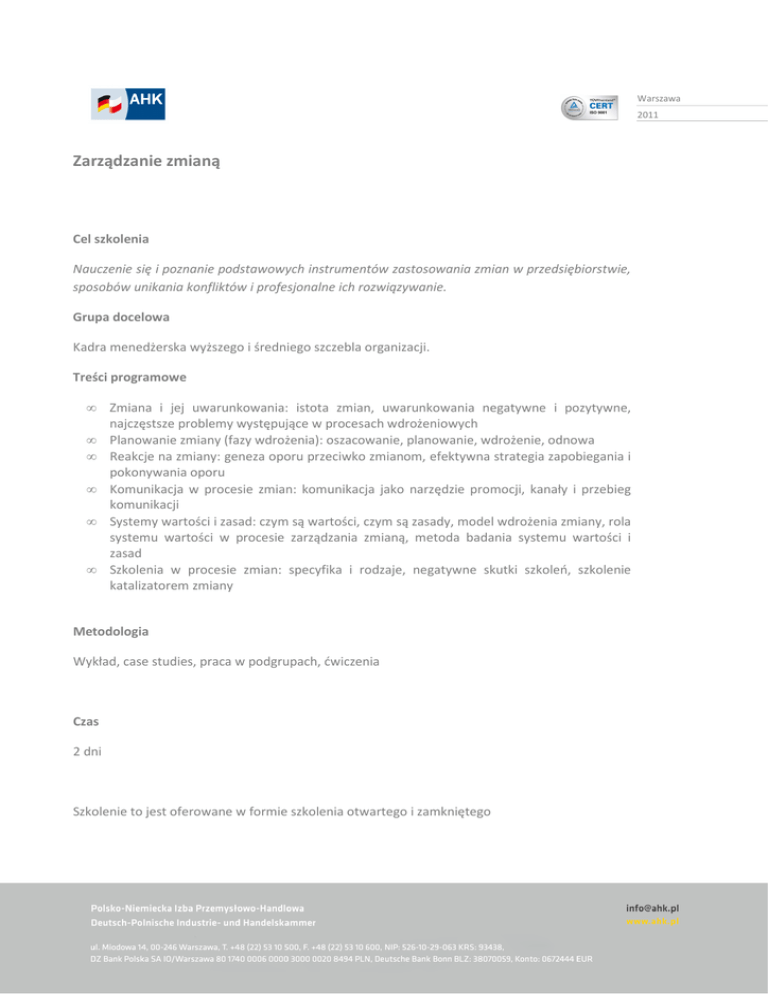 Warszawa 2011 Zarządzanie zmianą Cel szkolenia Nauczenie się i poznanie podstawowych instrumentów zastosowania zmian w przedsiębiorstwie, sposobów unikania konfliktów i profesjonalne ich rozwiązywanie. Grupa docelowa Kadra menedżerska wyższego i średniego szczebla organizacji. Treści programowe • • • • • • Zmiana i jej uwarunkowania: istota zmian, uwarunkowania negatywne i pozytywne, najczęstsze problemy występujące w procesach wdrożeniowych Planowanie zmiany (fazy wdrożenia): oszacowanie, planowanie, wdrożenie, odnowa Reakcje na zmiany: geneza oporu przeciwko zmianom, efektywna strategia zapobiegania i pokonywania oporu Komunikacja w procesie zmian: komunikacja jako narzędzie promocji, kanały i przebieg komunikacji Systemy wartości i zasad: czym są wartości, czym są zasady, model wdrożenia zmiany, rola systemu wartości w procesie zarządzania zmianą, metoda badania systemu wartości i zasad Szkolenia w procesie zmian: specyfika i rodzaje, negatywne skutki szkoleń, szkolenie katalizatorem zmiany Metodologia Wykład, case studies, praca w podgrupach, ćwiczenia Czas 2 dni Szkolenie to jest oferowane w formie szkolenia otwartego i zamkniętego