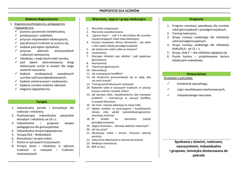 PROPOZYCJE DLA UCZNIÓW Badania diagnostyczne Warsztaty, zajęcia i grupy edukacyjne 1. Diagnoza psychologiczna, pedagogiczna i logopedyczna: poziomu sprawności intelektualnej; predyspozycji i uzdolnień; przyczyn niepowodzeń edukacyjnych; specyficznych trudności w uczeniu się; badanie pod kątem dyskalkulii; przyczyn zaburzeń emocjonalnych i zaburzeń zachowania; młodzieży z wadą słuchu lub/i wzroku; pod kątem ukierunkowania drogi edukacyjnej ucznia w nowym dla niego systemie nauczania; badanie predyspozycji zawodowych uczniów szkół ponadpodstawowych; badanie zainteresowań i osobowości; badanie uczniów wybitnie zdolnych; diagnoza logopedyczna. 1. 2. 3. 4. 5. 6. 7. 8. 9. 10. 11. 12. 13. 14. 15. Terapia 1. Indywidualne porady i konsultacje dla rodziców i młodzieży. 2. Psychoterapia indywidualna pacjentów dorosłych i młodzieży od 16 r.ż. 3. Indywidualna i grupowa terapia pedagogiczna dla gimnazjalistów. 4. Indywidualna terapia logopedyczna. 5. Terapia EEG – Biofeedback. 6. Konsultacje i terapia rodzin. 7. Pomoc w sytuacjach kryzysowych. 8. Terapia dzieci i młodzieży w zakresie trudności w relacjach i trudności motywacyjnych. 25. 16. 17. 18. 19. 20. 21. 26. 27. 22. 23. 24. Warsztaty integracyjne. Warsztaty zawodoznawcze. „Zgrana klasa” – cykl 2-3 warsztatów dla uczniów rozpoczynających nowe etap edukacyjny. Kryzysy rozwojowe okresu dorastania – jak sobie z nimi radzić (szkoły ponadgimnazjalne) Jak skutecznie radzić sobie ze stresem? Uzależnienia. Dlaczego młodzież pije alkohol i pali papierosy (gimnazjum). Asertywność. Tolerancja (gimnazjum). Komunikacja. Jak rozwiązywać konflikty? Jak skutecznie porozumiewać się ze sobą, aby nie ranić innych? Trening konstruktywnych zachowań. Radzenie sobie w sytuacjach trudnych, w sytuacji kryzysu rodziny: rozwód, śmierć. Jak wyrażać złość, niezadowolenia, aby rozwiązać problem? – interwencja w sytuacji konfliktu w zespole klasowym. Jak stres i emocje wpływają na nasze ciało. Wpływ mediów na postrzeganie i kształtowanie obrazu ciała wśród nastolatków(zagrożenia: anoreksja, bulimia). W drodze ku dorosłości (szkoły ponadgimnazjalne). Zajęcia dramowe – „Rozwój zdolności twórczych”. Jak się uczyć? Akceptacja siebie i innych. Poczucie własnej wartości. Zaburzenia depresyjne w okresie dorastania. Mediacje rówieśnicze. BHP w sieci. Programy 1. Program orientacji zawodowej dla uczniów szkół gimnazjalnych i ponadgimnazjalnych. 2. Trening twórczości. 3. Grupa rozwoju osobistego dla młodzieży szkół ponadgimnazjalnych. 4. Grupa rozwoju osobistego dla młodzieży KARUZELA - od 12 r. ż. 5. Grupa „Kub J” – dla młodzieży jąkającej się. 6. Puzzle kariery – projektowanie kariery edukacyjno-zawodowej. Orzecznictwo Orzekanie o potrzebie: kształcenia specjalnego, zajęć rewalidacyjno-wychowawczych, indywidualnego nauczania . Spotkania z dziećmi, rodzicami, nauczycielami, indywidualne i grupowe, tematyka dostosowana do potrzeb PROPOZYCJE DLA RODZICÓW PROPOZYCJE DLA NAUCZYCIELI Warsztaty i prelekcje Zajęcia warsztatowe: 1. Platforma wymiany informacji – cykl warsztatów poświęcony rodzicom dzieci nastoletnich. 2. Jak rozmawiać z dziećmi, aby nie sięgały po alkohol? 3. Przeciwdziałanie przemocy i agresji. W jaki sposób porozumiewać się z nastoletnim dzieckiem? 4. Dlaczego młodzież sięga po używki? 5. „Młodzieńczość – trud istnienia” – grupa dla rodziców nastolatków. Prelekcje: 1. Komunikacja z nastolatkiem. 2. Typy postaw rodzicielskich i konsekwencje wynikające z ich stosowania. Funkcje wychowawcze rodziny. 3. Sposoby motywowania dziecka do nauki. 4. Jak pomóc dziecku w podjęciu świadomej decyzji edukacyjno-zawodowej? 5. Jak komunikować się z dziećmi i wraz z nimi dojrzewać? 6. Problemy rozwojowe okresu dojrzewania. 7. Wspólne dorastanie – mamy w domu nastolatka. Inne 1. 2. 3. 4. Szkoła dla rodziców. . Porady indywidualne związane z wyborem kierunku kształcenia, wyborem zawodu i planowaniem kariery. Wsparcie dla rodziców dzieci niepełnosprawnych. Konsultacje dla osób i rodzin z problemem alkoholowym. Szkolenia rad pedagogicznych 1. 2. 3. 4. 5. 6. 7. 8. Jak interpretować opinie psychologiczno-pedagogiczne? Socjoterapia jako forma pomocy psychologicznej uczniom. Praca z uczniem z FAS. Praca z uczniem z nadpobudliwością psychoruchową. Praca z uczniem z niepełnosprawnością intelektualną. „Autyzm”. Świat ucznia z Zespołem Aspergera. Komunikacja z nastolatkiem. Motywowanie uczniów do nauki poprzez system oceniania wspierającego. 9. Doskonalenie umiejętności wychowawczych i komunikacyjnych (nadpobudliwość, agresja, wagary…). 10. Twoje motywacyjne DNA. 11. Dynamika grup. Programy 1. 2. 3. 4. Komunikacja interpersonalna. Szkoła dla wychowawców i nauczycieli. Praca z grupą jako procesem grupowym. Grupa wsparcia dla nauczycieli, pedagogów, psychologów 50+ „Ciało mówi STOP, głowa JESZCZE”. Poradnia PsychologicznoPedagogiczna nr 1 w Gdyni Oferta dla uczniów gimnazjów i szkół ponadgimnazjalnych, ich rodziców i nauczycieli Warsztaty i szkolenia 1. Interpretacja zapisów zawartych w opiniach i orzeczeniach wydawanych przez poradnię dzieciom o specjalnych potrzebach edukacyjnych . 2. Grupa wsparcia dla psychologów i pedagogów szkolnych. 3. Asertywność w pracy nauczyciela. 4. Drama w nauczaniu i wychowaniu. 5. Jak współpracować z rodzicami „trudnych dzieci”? 6. Praca z uczniem ze specjalnymi potrzebami edukacyjnym 7. Warsztat dla psychologów: Jak prowadzić warsztaty? 8. Praca z uczniem ze specjalnymi potrzebami edukacyjnymi. 9. Superwizje dla nauczycieli, wychowawców, psychologów i pedagogów szkolnych. Prelekcje i inne 1. Praca z uczniem dyslektycznym na poszczególnych przedmiotach w szkole. 2. Interwencja kryzysowa. 3. Afazja rozwojowa. 4. Sposoby motywowania dziecka do nauki. 5. Coaching, czyli wsparcie rozwoju zawodowego nauczyciela/dyrektora. na rok szkolny 2016/2