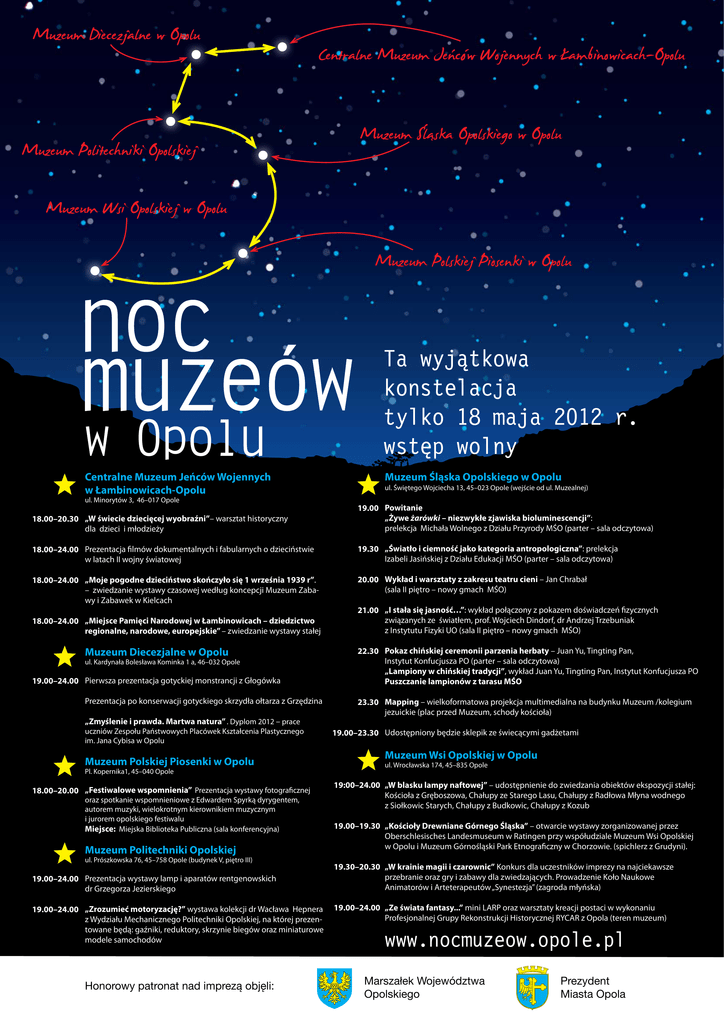 Ta wyjątkowa konstelacja tylko 18 maja 2012 r. wstęp wolny Centralne Muzeum Jeńców Wojennych w Łambinowicach-Opolu ul. Minorytów 3, 46–017 Opole Muzeum Śląska Opolskiego w Opolu ul. Świętego Wojciecha 13, 45–023 Opole (wejście od ul. Muzealnej) 18.00–20.30 „W świecie dziecięcej wyobraźni”– warsztat historyczny dla dzieci i młodzieży 19.00 Powitanie „Żywe żarówki – niezwykłe zjawiska bioluminescencji”: prelekcja Michała Wolnego z Działu Przyrody MŚO (parter – sala odczytowa) 18.00–24.00 Prezentacja filmów dokumentalnych i fabularnych o dzieciństwie w latach II wojny światowej 19.30 „Światło i ciemność jako kategoria antropologiczna”: prelekcja Izabeli Jasińskiej z Działu Edukacji MŚO (parter – sala odczytowa) 18.00–24.00 „Moje pogodne dzieciństwo skończyło się 1 września 1939 r”. – zwiedzanie wystawy czasowej według koncepcji Muzeum Zabawy i Zabawek w Kielcach 20.00 Wykład i warsztaty z zakresu teatru cieni – Jan Chrabał (sala II piętro – nowy gmach MŚO) 18.00–24.00 „Miejsce Pamięci Narodowej w Łambinowicach – dziedzictwo regionalne, narodowe, europejskie” – zwiedzanie wystawy stałej Muzeum Diecezjalne w Opolu ul. Kardynała Bolesława Kominka 1 a, 46–032 Opole 19.00–24.00 Pierwsza prezentacja gotyckiej monstrancji z Głogówka Prezentacja po konserwacji gotyckiego skrzydła ołtarza z Grzędzina „Zmyślenie i prawda. Martwa natura” . Dyplom 2012 – prace uczniów Zespołu Państwowych Placówek Kształcenia Plastycznego im. Jana Cybisa w Opolu Muzeum Polskiej Piosenki w Opolu Pl. Kopernika1, 45–040 Opole 18.00–20.00 „Festiwalowe wspomnienia” Prezentacja wystawy fotograficznej oraz spotkanie wspomnieniowe z Edwardem Spyrką dyrygentem, autorem muzyki, wielokrotnym kierownikiem muzycznym i jurorem opolskiego festiwalu Miejsce: Miejska Biblioteka Publiczna (sala konferencyjna) Muzeum Politechniki Opolskiej ul. Prószkowska 76, 45–758 Opole (budynek V, piętro III) 19.00–24.00 Prezentacja wystawy lamp i aparatów rentgenowskich dr Grzegorza Jezierskiego 19.00–24.00 „Zrozumieć motoryzację?” wystawa kolekcji dr Wacława Hepnera z Wydziału Mechanicznego Politechniki Opolskiej, na której prezentowane będą: gaźniki, reduktory, skrzynie biegów oraz miniaturowe modele samochodów Honorowy patronat nad imprezą objęli: 21.00 „I stała się jasność…”: wykład połączony z pokazem doświadczeń fizycznych związanych ze światłem, prof. Wojciech Dindorf, dr Andrzej Trzebuniak z Instytutu Fizyki UO (sala II piętro – nowy gmach MŚO) 22.30 Pokaz chińskiej ceremonii parzenia herbaty – Juan Yu, Tingting Pan, Instytut Konfucjusza PO (parter – sala odczytowa) „Lampiony w chińskiej tradycji”, wykład Juan Yu, Tingting Pan, Instytut Konfucjusza PO Puszczanie lampionów z tarasu MŚO 23.30 Mapping – wielkoformatowa projekcja multimedialna na budynku Muzeum /kolegium jezuickie (plac przed Muzeum, schody kościoła) 19.00–23.30 Udostępniony będzie sklepik ze świecącymi gadżetami Muzeum Wsi Opolskiej w Opolu ul. Wrocławska 174, 45–835 Opole 19:00–24.00 „W blasku lampy naftowej” – udostępnienie do zwiedzania obiektów ekspozycji stałej: Kościoła z Gręboszowa, Chałupy ze Starego Lasu, Chałupy z Radłowa Młyna wodnego z Siołkowic Starych, Chałupy z Budkowic, Chałupy z Kozub 19.00–19.30 „Kościoły Drewniane Górnego Śląska” – otwarcie wystawy zorganizowanej przez Oberschlesisches Landesmuseum w Ratingen przy współudziale Muzeum Wsi Opolskiej w Opolu i Muzeum Górnośląski Park Etnograficzny w Chorzowie. (spichlerz z Grudyni). 19.30–20.30 „W krainie magii i czarownic” Konkurs dla uczestników imprezy na najciekawsze przebranie oraz gry i zabawy dla zwiedzających. Prowadzenie Koło Naukowe Animatorów i Arteterapeutów „Synestezja” (zagroda młyńska) 19.00–24.00 „Ze świata fantasy...” mini LARP oraz warsztaty kreacji postaci w wykonaniu Profesjonalnej Grupy Rekonstrukcji Historycznej RYCAR z Opola (teren muzeum) www.nocmuzeow.opole.pl Marszałek Województwa Opolskiego Prezydent Miasta Opola