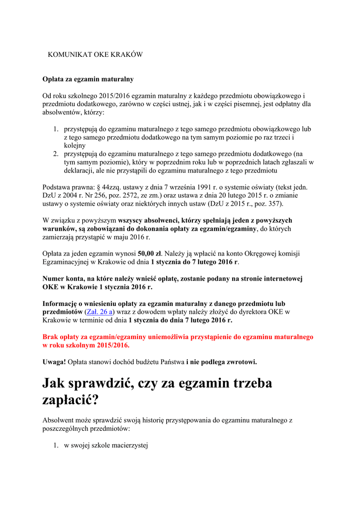 KOMUNIKAT OKE KRAKÓW Opłata za egzamin maturalny Od roku szkolnego 2015/2016 egzamin maturalny z każdego przedmiotu obowiązkowego i przedmiotu dodatkowego, zarówno w części ustnej, jak i w części pisemnej, jest odpłatny dla absolwentów, którzy: 1. przystępują do egzaminu maturalnego z tego samego przedmiotu obowiązkowego lub z tego samego przedmiotu dodatkowego na tym samym poziomie po raz trzeci i kolejny 2. przystępują do egzaminu maturalnego z tego samego przedmiotu dodatkowego (na tym samym poziomie), który w poprzednim roku lub w poprzednich latach zgłaszali w deklaracji, ale nie przystąpili do egzaminu maturalnego z tego przedmiotu Podstawa prawna: § 44zzq. ustawy z dnia 7 września 1991 r. o systemie oświaty (tekst jedn. DzU z 2004 r. Nr 256, poz. 2572, ze zm.) oraz ustawa z dnia 20 lutego 2015 r. o zmianie ustawy o systemie oświaty oraz niektórych innych ustaw (DzU z 2015 r., poz. 357). W związku z powyższym wszyscy absolwenci, którzy spełniają jeden z powyższych warunków, są zobowiązani do dokonania opłaty za egzamin/egzaminy, do których zamierzają przystąpić w maju 2016 r. Opłata za jeden egzamin wynosi 50,00 zł. Należy ją wpłacić na konto Okręgowej komisji Egzaminacyjnej w Krakowie od dnia 1 stycznia do 7 lutego 2016 r. Numer konta, na które należy wnieść opłatę, zostanie podany na stronie internetowej OKE w Krakowie 1 stycznia 2016 r. Informację o wniesieniu opłaty za egzamin maturalny z danego przedmiotu lub przedmiotów (Zał. 26 a) wraz z dowodem wpłaty należy złożyć do dyrektora OKE w Krakowie w terminie od dnia 1 stycznia do dnia 7 lutego 2016 r. Brak opłaty za egzamin/egzaminy uniemożliwia przystąpienie do egzaminu maturalnego w roku szkolnym 2015/2016. Uwaga! Opłata stanowi dochód budżetu Państwa i nie podlega zwrotowi. Jak sprawdzić, czy za egzamin trzeba zapłacić? Absolwent może sprawdzić swoją historię przystępowania do egzaminu maturalnego z poszczególnych przedmiotów: 1. w swojej szkole macierzystej lub 2. w OKE w Krakowie, wysyłając e-mail na adres: [email protected] Uwaga! e-mail należy podpisać, a w jego treści podać: imię i nazwisko, nr PESEL oraz egzaminy, do których chce się przystąpić w 2016 r. Wniosek o zwolnienie z opłaty Absolwent może zwrócić się do dyrektora OKE w Krakowie z Wnioskiem o zwolnienie z opłaty za egzamin maturalny z danego przedmiotu lub przedmiotów ( Zał. 26 b ) z powodu niskiego dochodu. Do wniosku należy dołączyć dokumenty potwierdzające wysokość dochodów (szczegółowa informacja znajduje się we wniosku). Wniosek wraz z dokumentami potwierdzającymi wysokość dochodów należy złożyć do OKE w Krakowie nie później niż do dnia 31 grudnia 2015 r.