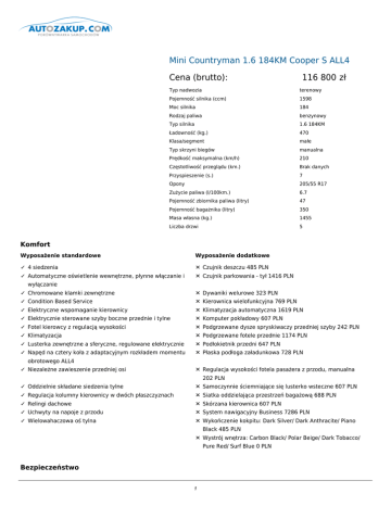 Mini Countryman 1.6 184KM Cooper S ALL4 Cena (brutto): 116 800 zł Typ nadwozia terenowy Pojemność silnika (ccm) 1598 Moc silnika 184 Rodzaj paliwa benzynowy Typ silnika 1.6 184KM Ładowność (kg.) 470 Klasa/segment małe Typ skrzyni biegów manualna Prędkość maksymalna (km/h) 210 Częstotliwość przeglądu (km.) Brak danych Przyspieszenie (s.) 7 Opony 205/55 R17 Zużycie paliwa (l/100km.) 6.7 Pojemność zbiornika paliwa (litry) 47 Pojemność bagażnika (litry) 350 Masa własna (kg.) 1455 Liczba drzwi 5 Komfort Wyposażenie standardowe Wyposażenie dodatkowe ✓ 4 siedzenia ✕ Czujnik deszczu 485 PLN ✓ Automatyczne oświetlenie wewnętrzne, płynne włączanie i ✕ Czujnik parkowania - tył 1416 PLN wyłączanie ✓ Chromowane klamki zewnętrzne ✕ Dywaniki welurowe 323 PLN ✓ Condition Based Service ✕ Kierownica wielofunkcyjna 769 PLN ✓ Elektryczne wspomaganie kierownicy ✕ Klimatyzacja automatyczna 1619 PLN ✓ Elektrycznie sterowane szyby boczne przednie i tylne ✕ Komputer pokładowy 607 PLN ✓ Fotel kierowcy z regulacją wysokości ✕ Podgrzewane dysze spryskiwaczy przedniej szyby 242 PLN ✓ Klimatyzacja ✕ Podgrzewane fotele przednie 1174 PLN ✓ Lusterka zewnętrzne a sferyczne, regulowane elektrycznie ✕ Podłokietnik przedni 647 PLN ✓ Napęd na cztery koła z adaptacyjnym rozkładem momentu ✕ Płaska podłoga załadunkowa 728 PLN obrotowego ALL4 ✓ Niezależne zawieszenie przedniej osi ✕ Regulacja wysokości fotela pasażera z przodu, manualna ✓ Oddzielnie składane siedzenia tylne ✕ Samoczynnie ściemniające się lusterko wsteczne 607 PLN ✓ Regulacja kolumny kierownicy w dwóch płaszczyznach ✕ Siatka oddzielająca przestrzeń bagażową 688 PLN ✓ Relingi dachowe ✕ Skórzana kierownica 607 PLN ✓ Uchwyty na napoje z przodu ✕ System nawigacyjny Business 7286 PLN ✓ Wielowahaczowa oś tylna ✕ Wykończenie kokpitu: Dark Silver/ Dark Anthracite/ Piano 202 PLN Black 485 PLN ✕ Wystrój wnętrza: Carbon Black/ Polar Beige/ Dark Tobacco/ Pure Red/ Surf Blue 0 PLN Bezpieczeństwo 1 Wyposażenie standardowe Wyposażenie dodatkowe ✓ ABS ✕ Opony z funkcją jazdy awaryjnej 364 PLN ✓ Apteczka oraz trójkąt ostrzegawczy ✕ Reflektory biksenonowe 2793 PLN ✓ Automatyczne ryglowanie drzwi przy prędkości 16 km/h ✕ Śruby zabezpieczające koła przed kradzieżą 80 PLN ✓ Boczne poduszki powietrzne\n ✓ CBC - system siły hamowania w zakrętach\n ✓ Dezaktywacja poduszki powietrznej pasażera\n ✓ DSC\n ✓ EBV\n ✓ Hamulce tarczowe z przodu, wentylowane\n ✓ Hamulce tarczowe z tyłu\n ✓ Mocowanie fotelika dziecięcego ISOFIX z tyłu\n ✓ Pasy bezpieczeństwa - trzypunktowe, z pirotechnicznymi napinaczami z przodu\n ✓ Poduszki powietrzne chroniące głowę dla podróżujących z przodu i z tyłu\n ✓ Poduszki powietrzne dla kierowcy i pasażera\n ✓ Sygnalizacja uszkodzenia opony\n Dodatki Wyposażenie standardowe Wyposażenie dodatkowe ✓ 4 - cylindrowy rzędowy silnik benzynowy w technologii 4 - ✕ Białe kierunkowskazy boczne 323 PLN zaworowej ✓ Bezpieczny zacisk akumulatora ✕ Białe sportowe pasy na pokrywie silnika 445 PLN ✓ Brake Energy Regeneration ✕ Czarne sportowe pasy na pokrywie silnika 445 PLN ✓ Centralny zamek ✕ Dostęp komfortowy 2105 PLN ✓ Chromowane końcówki rury wydechowej ✕ Dynamic Traction Control (DTC) 647 PLN ✓ Dach w kolorze kontrastowym ✕ Elektrycznie sterowany szklany dach 3967 PLN ✓ Fotele przednie z regulacją manualną ✕ Hak holowniczy ze zdejmowaną głowicą kulową 3117 PLN ✓ Funkcja Auto Start Stop, tylko w połączeniu z manualną ✕ Kierownica sportowa, skórzana, z dźwigienkami zmiany skrzynią biegów biegów 1376 PLN ✓ Immobiliser ✕ Kolor wnętrza: Carbon Black/ Polar Beige/ Dark Tobacco 0 ✓ Lakier niemetalizowany ✕ Lakier metalizowany 1821 PLN ✓ Listwy atrapy chłodnicy w kolorze czarnym ✕ Listwy ozdobne:Fluid Silver/ Piano Black 809 PLN ✓ Norma emisji spalin: Euro 5 ✕ Lusterka boczne chromowane 202 PLN ✓ Obręcze kół stalowe, 15 cali ✕ Lusterka przyciemniane automatycznie 1012 PLN ✓ Obręcze kół ze stopu lekkiego 5-Star Double Spoke, 17 cali, ✕ MINI Connected 1012 PLN PLN opony 205/55 R17 ✓ Radio MINI CD / MP3 / WAV ✕ Obręcze kół ze stopu lekkiego 5-Star Circular Spoke, 16 cali, opony 205/60 R16 2024 PLN ✓ Sportowa kierownica pokryta skórą ✕ Podsufitka w kolorze antracytowym 647 PLN ✓ Sportowe fotele przednie ✕ Przycisk Sport 526 PLN ✓ System alarmowy ✕ Przygotowanie do telefonu komórkowego ze złączem Bluetooth + interfejs audioiPod/USB 4007 PLN ✓ Tapicerka materiałowa Diagonal Track ✕ Radio MINI Boost CD 850 PLN ✓ 2 Trzecie światło stop ✕ 3 Radio MINI Visual Boost 4857 PLN 4 ✓ Wejście AUX ✕ Reflektory adaptacyjne 1295 PLN ✓ Zderzaki w kolorze nadwozia ✕ Rezygnacja z emblematu modelu 0 PLN ✓ Zestaw naprawczy MINI Mobility System ✕ Rozszerzenie interfejsu audio o telefony komórkowe 0 PLN ✕ Sportowa kierownica pokryta skórą 1052 PLN ✕ Sportowe fotele przednie 1254 PLN ✕ Sportowe zawieszenie 809 PLN ✕ Sterowanie głosem 1174 PLN ✕ Światła przeciwmgielne 607 PLN ✕ Szyby przeciwsłoneczne 647 PLN ✕ Tapicerka materiałowo - skórzana Parallel Lines 2631 PLN ✕ Tapicerka skórzana Gravity 5829 PLN ✕ Tapicerka skórzana Lounge 7084 PLN ✕ Tuner DAB do odbioru cyfrowych stacji radiowych 769 PLN ✕ Tylny spoiler 688 PLN ✕ Uchwyty do bagażnika na rowery 607 PLN ✕ Wykończenia zewnętrzne Chrome Line Exterior 688 PLN ✕ Wykończenie wnętrza Chrome Line Interior 404 PLN ✕ Zestaw 10 głosników HiFi Harman Kardon 3441 PLN ✕ Zestaw głośnomówiący ze złączem Bluetooth + interfejs audio iPod/USB 1700 PLN Doprecyzowanie oferty ✕ Pakiet Chili - 12653 PLN Dywaniki welurowe Kierownica wielofunkcyjna Klimatyzacja automatyczna Komputer pokładowy Pakiet dodatkowego oświetlenia Pakiet dodatkowych schowków Radio MINI Boost CD Regulacja wysokości fotela pa
