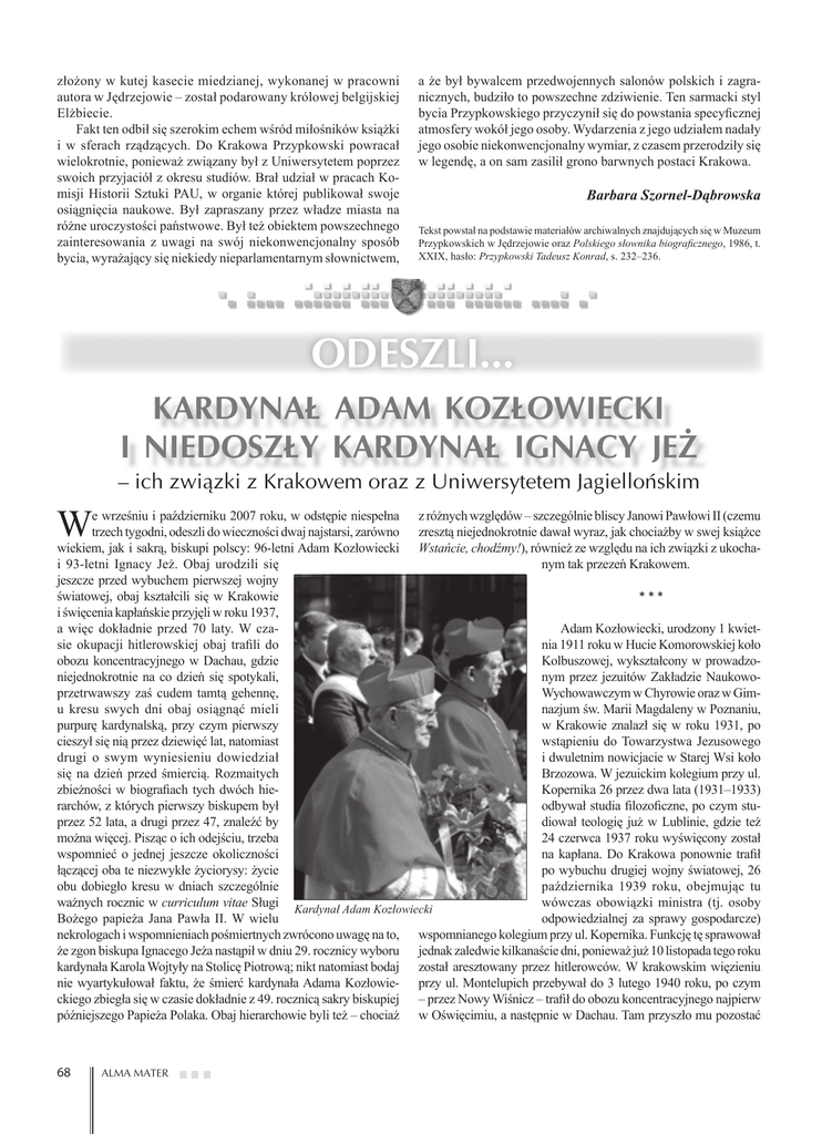 złożony w kutej kasecie miedzianej, wykonanej w pracowni autora w Jędrzejowie – został podarowany królowej belgijskiej Elżbiecie. Fakt ten odbił się szerokim echem wśród miłośników książki i w sferach rządzących. Do Krakowa Przypkowski powracał wielokrotnie, ponieważ związany był z Uniwersytetem poprzez swoich przyjaciół z okresu studiów. Brał udział w pracach Komisji Historii Sztuki PAU, w organie której publikował swoje osiągnięcia naukowe. Był zapraszany przez władze miasta na różne uroczystości państwowe. Był też obiektem powszechnego zainteresowania z uwagi na swój niekonwencjonalny sposób bycia, wyrażający się niekiedy nieparlamentarnym słownictwem, a że był bywalcem przedwojennych salonów polskich i zagranicznych, budziło to powszechne zdziwienie. Ten sarmacki styl bycia Przypkowskiego przyczynił się do powstania specyficznej atmosfery wokół jego osoby. Wydarzenia z jego udziałem nadały jego osobie niekonwencjonalny wymiar, z czasem przerodziły się w legendę, a on sam zasilił grono barwnych postaci Krakowa. Barbara Szornel-Dąbrowska Tekst powstał na podstawie materiałów archiwalnych znajdujących się w Muzeum Przypkowskich w Jędrzejowie oraz Polskiego słownika biograficznego, 1986, t. XXIX, hasło: Przypkowski Tadeusz Konrad, s. 232–236. ODESZLI... KARDYNAŁ ADAM KOZŁOWIECKI I NIEDOSZŁY KARDYNAŁ IGNACY JEŻ – ich związki z Krakowem oraz z Uniwersytetem Jagiellońskim W e wrześniu i październiku 2007 roku, w odstępie niespełna z różnych względów – szczególnie bliscy Janowi Pawłowi II (czemu trzech tygodni, odeszli do wieczności dwaj najstarsi, zarówno zresztą niejednokrotnie dawał wyraz, jak chociażby w swej książce wiekiem, jak i sakrą, biskupi polscy: 96-letni Adam Kozłowiecki Wstańcie, chodźmy!), również ze względu na ich związki z ukochai 93-letni Ignacy Jeż. Obaj urodzili się nym tak przezeń Krakowem. jeszcze przed wybuchem pierwszej wojny światowej, obaj kształcili się w Krakowie *** i święcenia kapłańskie przyjęli w roku 1937, a więc dokładnie przed 70 laty. W czaAdam Kozłowiecki, urodzony 1 kwietsie okupacji hitlerowskiej obaj trafili do nia 1911 roku w Hucie Komorowskiej koło obozu koncentracyjnego w Dachau, gdzie Kolbuszowej, wykształcony w prowadzoniejednokrotnie na co dzień się spotykali, nym przez jezuitów Zakładzie Naukowoprzetrwawszy zaś cudem tamtą gehennę, Wychowawczym w Chyrowie oraz w Gimu kresu swych dni obaj osiągnąć mieli nazjum św. Marii Magdaleny w Poznaniu, purpurę kardynalską, przy czym pierwszy w Krakowie znalazł się w roku 1931, po cieszył się nią przez dziewięć lat, natomiast wstąpieniu do Towarzystwa Jezusowego drugi o swym wyniesieniu dowiedział i dwuletnim nowicjacie w Starej Wsi koło się na dzień przed śmiercią. Rozmaitych Brzozowa. W jezuickim kolegium przy ul. zbieżności w biografiach tych dwóch hieKopernika 26 przez dwa lata (1931–1933) rarchów, z których pierwszy biskupem był odbywał studia filozoficzne, po czym stuprzez 52 lata, a drugi przez 47, znaleźć by diował teologię już w Lublinie, gdzie też można więcej. Pisząc o ich odejściu, trzeba 24 czerwca 1937 roku wyświęcony został wspomnieć o jednej jeszcze okoliczności na kapłana. Do Krakowa ponownie trafił łączącej oba te niezwykłe życiorysy: życie po wybuchu drugiej wojny światowej, 26 obu dobiegło kresu w dniach szczególnie października 1939 roku, obejmując tu ważnych rocznic w curriculum vitae Sługi Kardynał Adam Kozłowiecki wówczas obowiązki ministra (tj. osoby Bożego papieża Jana Pawła II. W wielu odpowiedzialnej za sprawy gospodarcze) nekrologach i wspomnieniach pośmiertnych zwrócono uwagę na to, wspomnianego kolegium przy ul. Kopernika. Funkcję tę sprawował że zgon biskupa Ignacego Jeża nastąpił w dniu 29. rocznicy wyboru jednak zaledwie kilkanaście dni, ponieważ już 10 listopada tego roku kardynała Karola Wojtyły na Stolicę Piotrową; nikt natomiast bodaj został aresztowany przez hitlerowców. W krakowskim więzieniu nie wyartykułował faktu, że śmierć kardynała Adama Kozłowie- przy ul. Montelupich przebywał do 3 lutego 1940 roku, po czym ckiego zbiegła się w czasie dokładnie z 49. rocznicą sakry biskupiej – przez Nowy Wiśnicz – trafił do obozu koncentracyjnego najpierw późniejszego Papieża Polaka. Obaj hierarchowie byli też – chociaż w Oświęcimiu, a następnie w Dachau. Tam przyszło mu pozostać 68 ALMA MATER przez blisko cztery i pół roku. Jak napisał o nim jeden ze współwięźniów, późniejszy biskup Franciszek Korszyński – w najcięższych chwilach zachowywał pogodę ducha, bo w wierze i modlitwie czerpał męstwo nadprzyrodzone. Po wyzwoleniu Dachau przyszły kardynał nie powrócił już do Polski, zdecydował się wyjechać na misje do Afryki. Trafił wówczas do Północnej Rodezji, dzisiejszej Zambii, już w roku 1950 obejmując tam obowiązki administratora apostolskiego wikariatu apostolskiego Lusaki, a pięć lat później zostając biskupem (1955 r.). W latach 1959–1969 Adam Kozłowiecki był pierwszym metropolitą nowo utworzonej archidiecezji Lusaki, z której to godności jednak zrezygnował, chcąc umożliwić obsadzenie miejscowych stolic biskupich rodowitymi Zambijczykami (sam skądinąd przyjął obywatelstwo zambijskie). Od tamtego momentu aż po kres swych dni, również po nominacji kardynalskiej, pracował jako szeregowy misjonarz, przeprowadziwszy się ze stolicy Zambii na prowincję. Do powojennej Polski po raz pierwszy zawitał dopiero w roku 1970, kiedy to na zaproszenie kardynała Karola Wojtyły wziął udział w procesji św. Biskup Ignacy Jeż Stanisława w Krakowie. Także w późniejszych latach kilkakrotnie przybywał w odwiedziny do ojczyzny – po raz ostatni w roku 1998, już jako kardynał (purpurę kardynalską otrzymał 21 lutego 1998 r.), kiedy to również uczestniczył w dorocznej procesji z Wawelu 