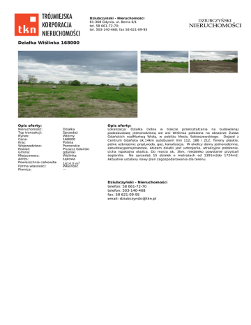 Dziubczyński - Nieruchomości 81-368 Gdynia, ul. Bema 6/1 tel. 58 661-72-70; tel. 503-140-468; fax 58 621-09-95 Działka Wiślinka 168000 Opis oferty: Nieruchomość: Typ transakcji: Rynek: Cena: Kraj: Wojewodztwo: Powiat: Gmina: Miejscowosc: Adres: Powierzchnia całkowita: Forma własności: Piwnica: Opis oferty: Działka Sprzedaż Wtórny 168000 Polska Pomorskie Pruszcz Gdański gdański Wiślinka Łąkowa Lokalizacja: Działka (rolna w trakcie przekształcania na budowlaną) podzabudowę jednorodzinną we wsi Wiślinka położona na obszarze Żuław Gdańskich nadMartwą Wisłą, w pobliżu Mostu Sobieszewskiego. Dojazd z Centrum Gdańska ok.14km autobusem linii 112, 186 i 212. Tereny płaskie, pełne uzbrojenie: prąd,woda, gaz, kanalizacja. W okolicy domy jednorodzinne, zabudowypensjonatowe. Atutem działki jest uzbrojenie, atrakcyjne położenie, cicha ispokojna okolica. Do morza ok. 3km, niedaleko powstanie przystań żeglarska. Na sprzedaż 15 działek o metrażach od 1391m2do 1724m2. Aktualnie ustalany nowy plan zagospodarowania dla terenu. 1414.0 m2 Własność --- Dziubczyński - Nieruchomości telefon: 58 661-72-70 telefon: 503-140-468 fax: 58 621-09-95 email: [email protected]