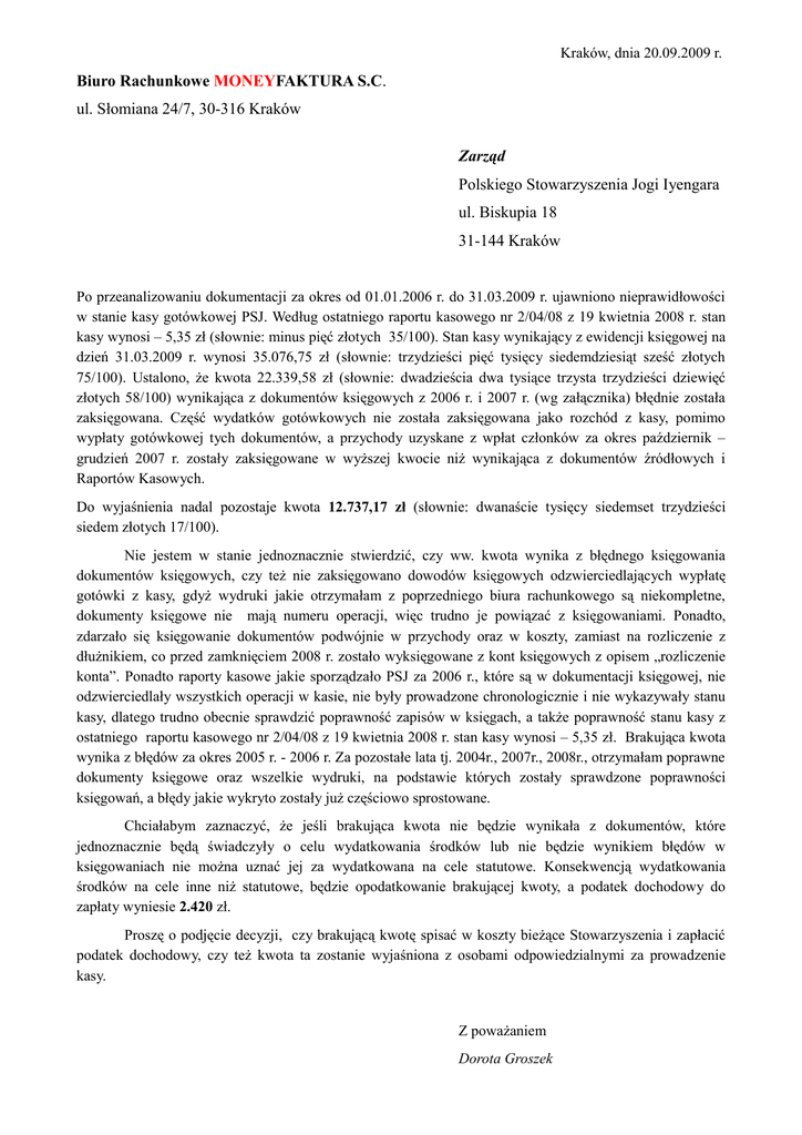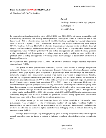 Kraków, dnia 20.09.2009 r. Biuro Rachunkowe MONEYFAKTURA S.C. ul. Słomiana 24/7, 30-316 Kraków Zarząd Polskiego Stowarzyszenia Jogi Iyengara ul. Biskupia 18 31-144 Kraków Po przeanalizowaniu dokumentacji za okres od 01.01.2006 r. do 31.03.2009 r. ujawniono nieprawidłowości w stanie kasy gotówkowej PSJ. Według ostatniego raportu kasowego nr 2/04/08 z 19 kwietnia 2008 r. stan kasy wynosi – 5,35 zł (słownie: minus pięć złotych 35/100). Stan kasy wynikający z ewidencji księgowej na dzień 31.03.2009 r. wynosi 35.076,75 zł (słownie: trzydzieści pięć tysięcy siedemdziesiąt sześć złotych 75/100). Ustalono, że kwota 22.339,58 zł (słownie: dwadzieścia dwa tysiące trzysta trzydzieści dziewięć złotych 58/100) wynikająca z dokumentów księgowych z 2006 r. i 2007 r. (wg załącznika) błędnie została zaksięgowana. Część wydatków gotówkowych nie została zaksięgowana jako rozchód z kasy, pomimo wypłaty gotówkowej tych dokumentów, a przychody uzyskane z wpłat członków za okres październik – grudzień 2007 r. zostały zaksięgowane w wyższej kwocie niż wynikająca z dokumentów źródłowych i Raportów Kasowych. Do wyjaśnienia nadal pozostaje kwota 12.737,17 zł (słownie: dwanaście tysięcy siedemset trzydzieści siedem złotych 17/100). Nie jestem w stanie jednoznacznie stwierdzić, czy ww. kwota wynika z błędnego księgowania dokumentów księgowych, czy też nie zaksięgowano dowodów księgowych odzwierciedlających wypłatę gotówki z kasy, gdyż wydruki jakie otrzymałam z poprzedniego biura rachunkowego są niekompletne, dokumenty księgowe nie mają numeru operacji, więc trudno je powiązać z księgowaniami. Ponadto, zdarzało się księgowanie dokumentów podwójnie w przychody oraz w koszty, zamiast na rozliczenie z dłużnikiem, co przed zamknięciem 2008 r. zostało wyksięgowane z kont księgowych z opisem „rozliczenie konta”. Ponadto raporty kasowe jakie sporządzało PSJ za 2006 r., które są w dokumentacji księgowej, nie odzwierciedlały wszystkich operacji w kasie, nie były prowadzone chronologicznie i nie wykazywały stanu kasy, dlatego trudno obecnie sprawdzić poprawność zapisów w księgach, a także poprawność stanu kasy z ostatniego raportu kasowego nr 2/04/08 z 19 kwietnia 2008 r. stan kasy wynosi – 5,35 zł. Brakująca kwota wynika z błędów za okres 2005 r. - 2006 r. Za pozostałe lata tj. 2004r., 2007r., 2008r., otrzymałam poprawne dokumenty księgowe oraz wszelkie wydruki, na podstawie których zostały sprawdzone poprawności księgowań, a błędy jakie wykryto zostały już częściowo sprostowane. Chciałabym zaznaczyć, że jeśli brakująca kwota nie będzie wynikała z dokumentów, które jednoznacznie będą świadczyły o celu wydatkowania środków lub nie będzie wynikiem błędów w księgowaniach nie można uznać jej za wydatkowana na cele statutowe. Konsekwencją wydatkowania środków na cele inne niż statutowe, będzie opodatkowanie brakującej kwoty, a podatek dochodowy do zapłaty wyniesie 2.420 zł. Proszę o podjęcie decyzji, czy brakującą kwotę spisać w koszty bieżące Stowarzyszenia i zapłacić podatek dochodowy, czy też kwota ta zostanie wyjaśniona z osobami odpowiedzialnymi za prowadzenie kasy. Z poważaniem Dorota Groszek