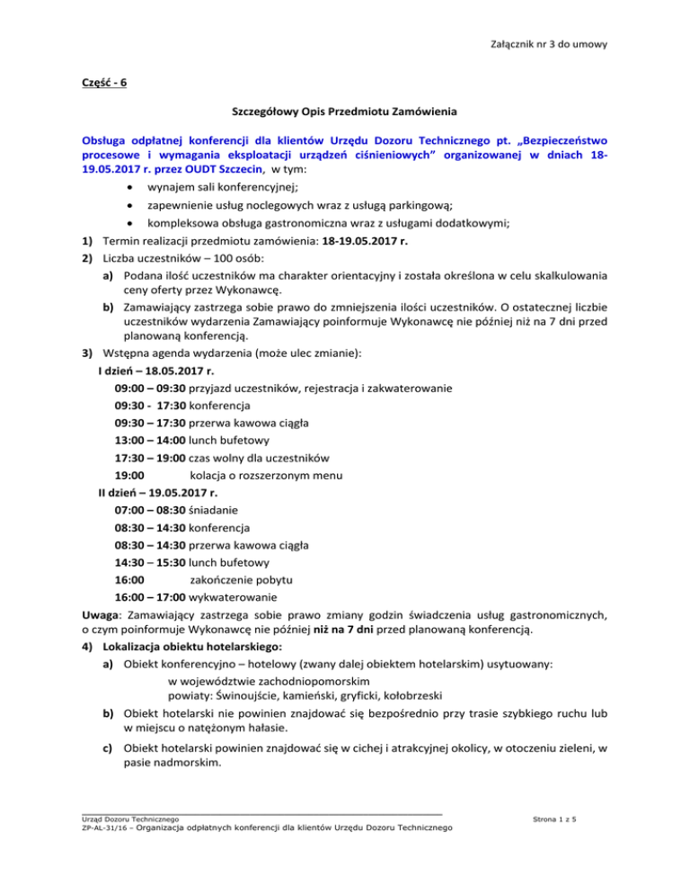 Załącznik nr 3 do umowy Część - 6 Szczegółowy Opis Przedmiotu Zamówienia Obsługa odpłatnej konferencji dla klientów Urzędu Dozoru Technicznego pt. „Bezpieczeństwo procesowe i wymagania eksploatacji urządzeń ciśnieniowych” organizowanej w dniach 1819.05.2017 r. przez OUDT Szczecin, w tym: wynajem sali konferencyjnej; zapewnienie usług noclegowych wraz z usługą parkingową; kompleksowa obsługa gastronomiczna wraz z usługami dodatkowymi; 1) Termin realizacji przedmiotu zamówienia: 18-19.05.2017 r. 2) Liczba uczestników – 100 osób: a) Podana ilość uczestników ma charakter orientacyjny i została określona w celu skalkulowania ceny oferty przez Wykonawcę. b) Zamawiający zastrzega sobie prawo do zmniejszenia ilości uczestników. O ostatecznej liczbie uczestników wydarzenia Zamawiający poinformuje Wykonawcę nie później niż na 7 dni przed planowaną konferencją. 3) Wstępna agenda wydarzenia (może ulec zmianie): I dzień – 18.05.2017 r. 09:00 – 09:30 przyjazd uczestników, rejestracja i zakwaterowanie 09:30 - 17:30 konferencja 09:30 – 17:30 przerwa kawowa ciągła 13:00 – 14:00 lunch bufetowy 17:30 – 19:00 czas wolny dla uczestników 19:00 kolacja o rozszerzonym menu II dzień – 19.05.2017 r. 07:00 – 08:30 śniadanie 08:30 – 14:30 konferencja 08:30 – 14:30 przerwa kawowa ciągła 14:30 – 15:30 lunch bufetowy 16:00 zakończenie pobytu 16:00 – 17:00 wykwaterowanie Uwaga: Zamawiający zastrzega sobie prawo zmiany godzin świadczenia usług gastronomicznych, o czym poinformuje Wykonawcę nie później niż na 7 dni przed planowaną konferencją. 4) Lokalizacja obiektu hotelarskiego: a) Obiekt konferencyjno – hotelowy (zwany dalej obiektem hotelarskim) usytuowany: w województwie zachodniopomorskim powiaty: Świnoujście, kamieński, gryficki, kołobrzeski b) Obiekt hotelarski nie powinien znajdować się bezpośrednio przy trasie szybkiego ruchu lub w miejscu o natężonym hałasie. c) Obiekt hotelarski powinien znajdować się w cichej i atrakcyjnej okolicy, w otoczeniu zieleni, w pasie nadmorskim. _________________________________________________________________________ Urząd Dozoru Technicznego ZP-AL-31/16 – Organizacja odpłatnych konferencji dla klientów Urzędu Dozoru Technicznego Strona 1 z 5 5) Standard i ogólne wymagania Zamawiającego w stosunku do zaoferowanego obiektu hotelarskiego: a) Wykonawca zapewni realizację usług w obiekcie hotelarskim o standardzie min pięciu gwiazdek, tzn. zapewniony obiekt hotelarski musi spełniać kryteria określone dla hoteli co najmniej pięciogwiazdkowych – ***** zgodnie z załącznikiem nr 1 do Rozporządzenia Ministra Gospodarki i Pracy z dnia 19 sierpnia 2004 r. w sprawie obiektów hotelarskich i innych obiektów, w których są świadczone usługi hotelarskie (Dz. U. z 2006 r. Nr 22, poz.169 z pózn.zm.) b) Obiekt hotelarski powinien być oddany do użytku lub wyremontowany nie wcześniej niż 10 lat przed dniem opublikowania niniejszego postępowania. c) Obiekt hotelarski nie może być w trakcie prac remontowych w czasie realizacji usług, tj. w czasie konferencji. d) Jeśli w obiekcie hotelarskim, w terminie realizacji przedmiotu zamówienia, będzie jednocześnie organizowana inna impreza/konferencja, nie może ona w jakikolwiek sposób kolidować lub wpływać na przebieg konferencji Zamawiającego, komfort uczestników, identyfikację konferencji Zamawiającego, czy w inny sposób powodować np. hałas, mieszanie się uczestników, połączenie oznaczeń, stoisk czy punktów rejestracji uczestników itp. e) Wykonawca zobligowany jest do świadczenia usługi konferencyjnej i gastronomicznej oraz noclegowej w tym samym obiekcie (dopuszczalne jest kilka budynków pod tym samym adresem z dogodnym przejściem z jednego budynku do drugiego). f) Na terenie obiektu – bar/restauracja do skorzystania przez uczestników konferencji we własnym zakresie (zakup napojów zimnych, gorących, alkoholowych, przekąsek). 6) Wykonawca zapewni obiekt hotelarski spełniający poniższe szczegółowe wymagania: a) Odpowiednia ilości pokoi do ułożenia grupy max 100 osób do ułożenia w pokojach jednoosobowych lub dwuosobowych z możliwością pojedynczego wykorzystania. (WAŻNE) Pokoje posiadające standard minimum ***** (pięciogwiazdkowy) - zgodnie z załącznikiem nr 1 do Rozporządzenia Ministra Gospodarki i Pracy z dnia 19 sierpnia 2004 r. w sprawie obiektów hotelarskich i innych obiektów, w których są świadczone usługi hotelarskie (Dz. U. z 2006 r. Nr. 22, poz. 169, z późn. zm.). Uwaga: Zamawiający może, w uzgodnieniu z Wykonawcą, zamówić usługi noclegowe w dobie hotelowej poprzedzającej dzień rozpoczęcia konferencji, lub dobie następującej po ostatnim dniu konferencji, w miarę dostępności pokoi w obiekcie hotelarskim. Sumaryczna liczba noclegów w ramach realizowanych usług nie przekroczy 100. b) Sala konferencyjna: - swobodnie mieszcząca grupę 100 osób w ustawieniu szkolnym lub w podkowę/literę U po zewnętrznej stronie (ustawienie sali w każdym dniu konferencji do uzgodnienia z Zamawiającym) oraz umożliwiająca postawienie stoisk wystawienniczych; - sala konferencyjna nie może znajdować się w tym samym miejscu co sala restauracyjna; - wyposażona w nagłośnienie, mównicę, stół prezydialny dla 5 osób, rzutnik multimedialny, ekran, co najmniej 2 mikrofony bezprzewodowe, tablica (papierowa lub tablica biała sucho ścieralna), markery do tablicy; ekran jest dobrze widoczny z każdego miejsca sali; - wskazane jest, by sala miała dwa wyjścia z przodu i z tyłu; - z dostępem do światła dziennego, możliwością zaciemnienia (WAŻNE) oraz możliwością regulacji oświetlenia sztucznego; - sala klimatyzowana z możliwością regulacji temperatury; - każdego dnia konferencji Zamawiający korzysta z tej samej sali w obiekcie; _________________________________________________________________________ Urząd Dozoru Technicznego ZP-AL-55/16 