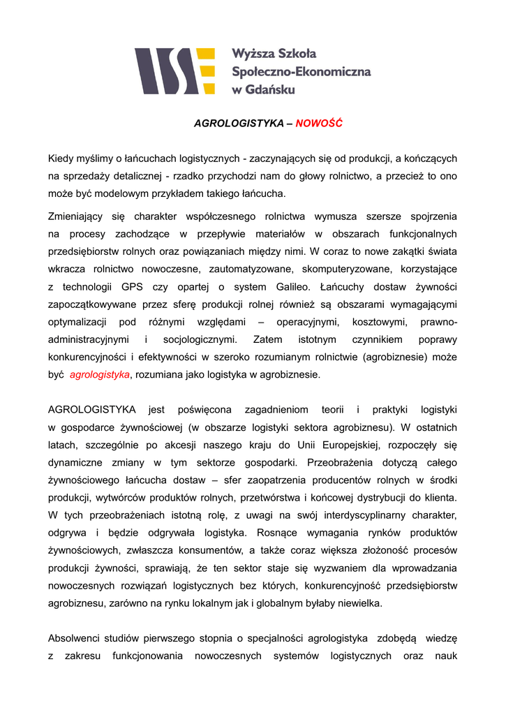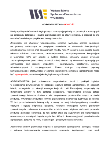 AGROLOGISTYKA – NOWOŚĆ Kiedy myślimy o łańcuchach logistycznych - zaczynających się od produkcji, a kończących na sprzedaży detalicznej - rzadko przychodzi nam do głowy rolnictwo, a przecież to ono może być modelowym przykładem takiego łańcucha. Zmieniający się charakter współczesnego rolnictwa wymusza szersze spojrzenia na procesy zachodzące w przepływie materiałów w obszarach funkcjonalnych przedsiębiorstw rolnych oraz powiązaniach między nimi. W coraz to nowe zakątki świata wkracza rolnictwo nowoczesne, zautomatyzowane, skomputeryzowane, korzystające z technologii GPS czy opartej o system Galileo. Łańcuchy dostaw żywności zapoczątkowywane przez sferę produkcji rolnej również są obszarami wymagającymi optymalizacji pod administracyjnymi różnymi i względami socjologicznymi. – operacyjnymi, Zatem istotnym kosztowymi, prawno- czynnikiem poprawy konkurencyjności i efektywności w szeroko rozumianym rolnictwie (agrobiznesie) może być agrologistyka, rozumiana jako logistyka w agrobiznesie. AGROLOGISTYKA jest poświęcona zagadnieniom teorii i praktyki logistyki w gospodarce żywnościowej (w obszarze logistyki sektora agrobiznesu). W ostatnich latach, szczególnie po akcesji naszego kraju do Unii Europejskiej, rozpoczęły się dynamiczne zmiany w tym sektorze gospodarki. Przeobrażenia dotyczą całego żywnościowego łańcucha dostaw – sfer zaopatrzenia producentów rolnych w środki produkcji, wytwórców produktów rolnych, przetwórstwa i końcowej dystrybucji do klienta. W tych przeobrażeniach istotną rolę, z uwagi na swój interdyscyplinarny charakter, odgrywa i będzie odgrywała logistyka. Rosnące wymagania rynków produktów żywnościowych, zwłaszcza konsumentów, a także coraz większa złożoność procesów produkcji żywności, sprawiają, że ten sektor staje się wyzwaniem dla wprowadzania nowoczesnych rozwiązań logistycznych bez których, konkurencyjność przedsiębiorstw agrobiznesu, zarówno na rynku lokalnym jak i globalnym byłaby niewielka. Absolwenci studiów pierwszego stopnia o specjalności agrologistyka zdobędą wiedzę z zakresu funkcjonowania nowoczesnych systemów logistycznych oraz nauk ekonomicznych, organizacji i zarządzania a także umiejętności menedżerskie. Posiądą umiejętności analizy otoczenia przedsiębiorstw w sektorze gospodarki rolnej i leśnej, a w szczególności środowiska rynkowego i konkurencyjnego firmy, partnerów w łańcuchu logistycznym, analizy zasobów wewnętrznych przedsiębiorstwa oraz planowania strategii rozwoju i działania przedsiębiorstw sektora rolno-spożywczego, w tym jego podstawowych strategii logistycznych, zarządzania produkcją, finansami i personelem firmy. Absolwent specjalności uzyskuje ponadto wiedzę z zakresu analizy, interpretacji i oceny procesów zachodzących w otoczeniu przedsiębiorstw agrobiznesu oraz gospodarstw rolniczych, możliwości stosowania nowoczesnych rozwiązań w sferze powiązań integracyjnych pomiędzy gospodarstwami rolniczymi a partnerami handlowymi, podstaw marketingu i zarządzania w agrobiznesie, możliwości wykorzystania instrumentów regulacji rynków rolnych oraz absorpcji środków finansowych na rozwój gospodarstw rolniczych i pozostałych podmiotów agrobiznesu. Absolwenci są przygotowani do podjęcia studiów drugiego stopnia oraz pracy w przedsiębiorstwach w których wymagana jest wiedza logistyczna, ekonomiczna, wiedza z obszaru zarządzania transportem, a także umiejętności organizacyjne. WYBRANE STANOWISKA PRACY ABSOLWENTÓW: specjalista lub analityk ds. logistyki w przedsiębiorstwach sfery agrobiznesu; specjalista ds. informacji w przedsiębiorstwach logistycznych; logistyk w instytucjach obsługi rolnictwa; specjalista ds. transportu, importu oraz eksportu w instytucjach agrobiznesu; specjalista ds. logistyki w firmach agrokonsultingowych. otoczenia