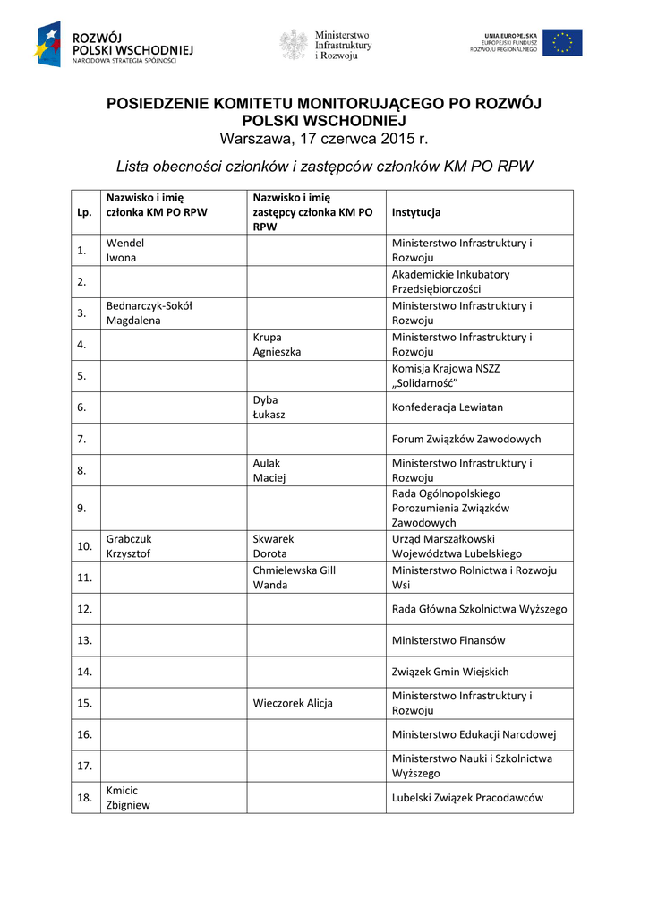 POSIEDZENIE KOMITETU MONITORUJĄCEGO PO ROZWÓJ POLSKI WSCHODNIEJ Warszawa, 17 czerwca 2015 r. Lista obecności członków i zastępców członków KM PO RPW Lp. 1. Nazwisko i imię członka KM PO RPW Nazwisko i imię zastępcy członka KM PO RPW Wendel Iwona 2. 3. Bednarczyk-Sokół Magdalena Krupa Agnieszka 4. 5. Dyba Łukasz 6. 7. Ministerstwo Infrastruktury i Rozwoju Akademickie Inkubatory Przedsiębiorczości Ministerstwo Infrastruktury i Rozwoju Ministerstwo Infrastruktury i Rozwoju Komisja Krajowa NSZZ „Solidarność” Konfederacja Lewiatan Forum Związków Zawodowych Aulak Maciej 8. 9. 10. Instytucja Grabczuk Krzysztof 11. Skwarek Dorota Chmielewska Gill Wanda Ministerstwo Infrastruktury i Rozwoju Rada Ogólnopolskiego Porozumienia Związków Zawodowych Urząd Marszałkowski Województwa Lubelskiego Ministerstwo Rolnictwa i Rozwoju Wsi 12. Rada Główna Szkolnictwa Wyższego 13. Ministerstwo Finansów 14. Związek Gmin Wiejskich 15. Wieczorek Alicja Ministerstwo Infrastruktury i Rozwoju 16. Ministerstwo Edukacji Narodowej 17. Ministerstwo Nauki i Szkolnictwa Wyższego 18. Kmicic Zbigniew Lubelski Związek Pracodawców 19. Komisarczuk Teresa 20. 21. Ministerstwo Środowiska Kroszczyńska Elżbieta 22. Nowopolska Kinga 23. Fleiszfreser Jacek 25. Kocon Beata Głowienka Jadwiga 26. 27. 28. Bernacki Bartosz 29. Wais Paweł 31 Pałasz Monika Piątkowska Konstancja Złakowski Tomasz 32. 33. 34. Szymoszek-Łata Ewa Renkiewicz Czesław 35. 36. 37. Ryszko Elżbieta Szewczyk Dariusz 39. Ministerstwo Gospodarki Konferencja Rektorów Akademickich Szkół Polskich Ministerstwo Infrastruktury i Rozwoju Urząd Marszałkowski Województwa Świętokrzyskiego Ministerstwo Infrastruktury i Rozwoju Urząd Marszałkowski Województwa Podkarpackiego Ministerstwo Infrastruktury i Rozwoju Ministerstwo Infrastruktury i Rozwoju Urząd Marszałkowski Województwa Podlaskiego Ministerstwo Infrastruktury i Rozwoju Urząd Miasta Suwałk Dariusz Kołodziejczyk 38. Związek Powiatów Polskich Rada FSNT NOT w Białymstoku Berliński Maciej Polska Agencja Rozwoju Przedsiębiorczości Fundacja Rozwoju Demokracji Lokalnej Unia Metropolii Polskich 40. 41. Ministerstwo Administracji i Cyfryzacji Ministerstwo Infrastruktury i Rozwoju Kancelaria Prezesa Rady Ministrów 24. 30. Związek Rzemiosła Polskiego Wojszko Rafał Urząd Marszałkowski Województwa WarmińskoMazurskiego Związek Pracodawców Business Centre Club 42. Wyrwicz Elżbieta Ministerstwo Sportu i Turystyki Pałucka Beata 43. 44. Ministerstwo Infrastruktury i Rozwoju Ministerstwo Infrastruktury i Rozwoju Zygadło Piotr Lista obecności obserwatorów KM PO RPW Lp. Imię i nazwisko obserwatora KM PO RPW 1. 2. 3. 4. 5. Katarzyna Kwiecińska-Gruszka 6. Instytucja Departament Koordynacji Strategii i Polityk Rozwoju, MIiR Departament Polityki Regionalnej i Rolnictwa, Ministerstwo Finansów Departament Ochrony Interesów Finansowych UE, Ministerstwo Finansów Departament Ochrony Interesów Finansowych UE, Ministerstwo Finansów Departament Ochrony Interesów Finansowych UE, Ministerstwo Finansów Departament Instytucji Płatniczej, Ministerstwo Finansów 7. NIK 8. NIK 9. NIK 10. Urząd Marszałkowski woj. lubelskiego 11. Urzad Marszałkowski woj. podkarpackiego 12. Marek Mika Zarząd Koneckiego Stowarzyszenia Wspierania Przedsiębiorczości 13. Justyna Lis Urząd Marszałkowski woj. warmińsko-mazurskiego 14. Michał Krawczyk Lubelski Urząd Wojewódzki 15. Podkarpacki Urząd Wojewódzki 16. Podlaski Urząd Wojewódzki 17. Świętokrzyski Urząd Wojewódzki 18. Warmińsko-Mazurski Urząd Wojewódzki 19. Związek Miast Polskich 20. Unia Miasteczek Polskich 21. Związek Banków Polskich 22. Fundacja Ekonomistów Środowiska i Zasobów Naturalnych 23. Krzysztof Załęgowski Bank Gospodarstwa Krajowego Departament Funduszy Europejskich, Ministerstwo Zdrowia 24. 25. Katarzyna Łuczkowska-Sutkowska Generalna Dyrekcja Dróg Krajowych i Autostrad 26. Anna Pietrzak Generalna Dyrekcja Dróg Krajowych i Autostrad Lista obecności gości KM PO RPW Lp. Imię i nazwisko gościa KM PO RPW Instytucja 1. Cezary Sławiński Instytut Agrofizyki PAN 2. Andrzej Bieganowski Instytut Agrofizyki PAN 3. Stanisława Bęben Urząd Miasta Rzeszowa 4. Paweł Potyrański Urząd Miasta Rzeszowa 5. Eliza Popławska-Jodko Uniwersytet Warmińsko-Mazurski 6. Marta Wangin Uniwersytet Warmińsko-Mazurski 7. Dariusz Szymańczak PARP 8. Magdalena Jasińska IZ PO PRW 9. Maria Ślesik IZ PO PRW 10. Anna Jaworska IZ PO PRW 11. Michał Kober IZ PO PRW 12. Katarzyna Wójcicka Ministerstwo Infrastruktury i Rozwoju 13. Joanna Kossowska IZ PO PRW 14. Monika Majewska IZ PO PRW 15. Joanna Gradowska IZ PO PRW 16. Judyta Szóstakowska IZ PO PRW 17. Paweł Królak IZ PO PRW 18. Bartłomiej Pocztowski IZ PO PRW 19. Karolina Bakalarska IZ PO PRW 20. Ewelina Dobosz IZ PO PRW 21. Ewa Malik-Kapler IZ PO PRW 22. Renata Calak IZ PO PRW 23. Magdalena Puzio IZ PO PRW 24. Agnieszka Jannasz Ministerstwo Infrastruktury i Rozwoju