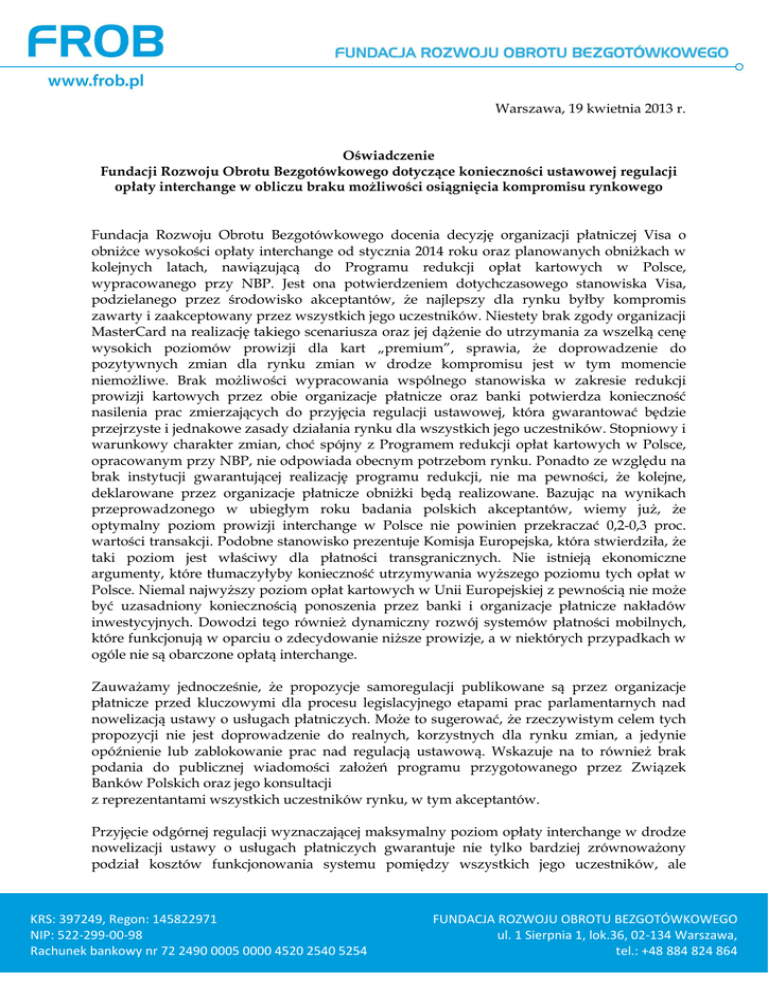 Warszawa, 19 kwietnia 2013 r. Oświadczenie Fundacji Rozwoju Obrotu Bezgotówkowego dotyczące konieczności ustawowej regulacji opłaty interchange w obliczu braku możliwości osiągnięcia kompromisu rynkowego Fundacja Rozwoju Obrotu Bezgotówkowego docenia decyzję organizacji płatniczej Visa o obniżce wysokości opłaty interchange od stycznia 2014 roku oraz planowanych obniżkach w kolejnych latach, nawiązującą do Programu redukcji opłat kartowych w Polsce, wypracowanego przy NBP. Jest ona potwierdzeniem dotychczasowego stanowiska Visa, podzielanego przez środowisko akceptantów, że najlepszy dla rynku byłby kompromis zawarty i zaakceptowany przez wszystkich jego uczestników. Niestety brak zgody organizacji MasterCard na realizację takiego scenariusza oraz jej dążenie do utrzymania za wszelką cenę wysokich poziomów prowizji dla kart „premium”, sprawia, że doprowadzenie do pozytywnych zmian dla rynku zmian w drodze kompromisu jest w tym momencie niemożliwe. Brak możliwości wypracowania wspólnego stanowiska w zakresie redukcji prowizji kartowych przez obie organizacje płatnicze oraz banki potwierdza konieczność nasilenia prac zmierzających do przyjęcia regulacji ustawowej, która gwarantować będzie przejrzyste i jednakowe zasady działania rynku dla wszystkich jego uczestników. Stopniowy i warunkowy charakter zmian, choć spójny z Programem redukcji opłat kartowych w Polsce, opracowanym przy NBP, nie odpowiada obecnym potrzebom rynku. Ponadto ze względu na brak instytucji gwarantującej realizację programu redukcji, nie ma pewności, że kolejne, deklarowane przez organizacje płatnicze obniżki będą realizowane. Bazując na wynikach przeprowadzonego w ubiegłym roku badania polskich akceptantów, wiemy już, że optymalny poziom prowizji interchange w Polsce nie powinien przekraczać 0,2-0,3 proc. wartości transakcji. Podobne stanowisko prezentuje Komisja Europejska, która stwierdziła, że taki poziom jest właściwy dla płatności transgranicznych. Nie istnieją ekonomiczne argumenty, które tłumaczyłyby konieczność utrzymywania wyższego poziomu tych opłat w Polsce. Niemal najwyższy poziom opłat kartowych w Unii Europejskiej z pewnością nie może być uzasadniony koniecznością ponoszenia przez banki i organizacje płatnicze nakładów inwestycyjnych. Dowodzi tego również dynamiczny rozwój systemów płatności mobilnych, które funkcjonują w oparciu o zdecydowanie niższe prowizje, a w niektórych przypadkach w ogóle nie są obarczone opłatą interchange. Zauważamy jednocześnie, że propozycje samoregulacji publikowane są przez organizacje płatnicze przed kluczowymi dla procesu legislacyjnego etapami prac parlamentarnych nad nowelizacją ustawy o usługach płatniczych. Może to sugerować, że rzeczywistym celem tych propozycji nie jest doprowadzenie do realnych, korzystnych dla rynku zmian, a jedynie opóźnienie lub zablokowanie prac nad regulacją ustawową. Wskazuje na to również brak podania do publicznej wiadomości założeń programu przygotowanego przez Związek Banków Polskich oraz jego konsultacji z reprezentantami wszystkich uczestników rynku, w tym akceptantów. Przyjęcie odgórnej regulacji wyznaczającej maksymalny poziom opłaty interchange w drodze nowelizacji ustawy o usługach płatniczych gwarantuje nie tylko bardziej zrównoważony podział kosztów funkcjonowania systemu pomiędzy wszystkich jego uczestników, ale KRS: 397249, Regon: 145822971 NIP: 522-299-00-98 Rachunek bankowy nr 72 2490 0005 0000 4520 2540 5254 FUNDACJA ROZWOJU OBROTU BEZGOTÓWKOWEGO ul. 1 Sierpnia 1, lok.36, 02-134 Warszawa, tel.: +48 884 824 864 zapewnia również jego większą transparentność. Zgodnie z postulatem stawianym przez VISA, że zapisy nowelizowanej ustawy powinny jednocześnie uniemożliwiać stosowanie dodatkowych opłat obciążających agentów rozliczeniowych i de facto podnoszących tym samym wysokość opłaty interchange. Robert Łaniewski Prezes Fundacji Rozwoju Obrotu Bezgotówkowego *** Fundacja Rozwoju Obrotu Bezgotówkowego została powołana do życia w listopadzie 2011 roku, jako reprezentacja przedsiębiorców z sektora MSP, w odpowiedzi na palącą potrzebę zmian w zakresie funkcjonowania systemu płatniczego w Polsce. Od początku istnienia Fundacji udało się już połączyć siły ponad 1500 przedsiębiorców z całej Polski – nawet tych, którzy na co dzień są konkurentami. Kluczowym celem działania FROB jest w pierwszej kolejności doprowadzenie do obniżenia opłaty interchange, czyli prowizji, którą akceptujący kartę płatniczą – sklep, zakład usługowy czy stacja benzynowa – muszą oddawać do banku, który daną kartę wystawił. Jak dowodzą analizy NBP, jest to podstawowy warunek rozwoju obrotu bezgotówkowego w Polsce. KRS: 397249, Regon: 145822971 NIP: 522-299-00-98 Rachunek bankowy nr 72 2490 0005 0000 4520 2540 5254 FUNDACJA ROZWOJU OBROTU BEZGOTÓWKOWEGO ul. 1 Sierpnia 1, lok.36, 02-134 Warszawa, tel.: +48 884 824 864