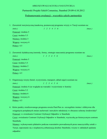 ARKUSZ EWALUACJI DLA NAUCZYCIELA Partnerski Projekt Szkół Comenius, Stambuł 29.09-4.10.2012 Podsumowanie ewaluacji - wszystkie szkoły partnerskie 1. Zawartość merytoryczną (naukową, poznawczą) programu wizyty w Turcji oceniam na: (min.) 1 2 3 4 5 6 (max.) Francuzi: średnia 5 Czesi: średnia 5.5 Niemcy: średnia 3 Węgrzy: wszyscy 6 Polacy: 4.5 2. Zawartość dydaktyczną (metody, formy, strategie nauczania) programu oceniam na: (min.) 1 2 3 4 5 6 (max.) Francuzi: średnia 5 Czesi: średnia 5.5 Niemcy: średnia 2 Węgrzy: wszyscy 6 Polacy: 4.5 3. Organizację wizyty (hotel, wyżywienie, transport, układ zajęć) oceniam na: (min.) 1 2 3 4 5 6 (max.) Francuzi: średnia 4 (ze względu na warunki i wyżywienie w hotelu) Czesi: średnia 5.5 Niemcy: średnia 6 Węgrzy: wszyscy 6 Polacy: 4.5 4. Które punkty zrealizowanego programu uważa Pani/Pan za szczególnie istotne i efektywne dla osiągnięcia pożądanych zmian zachowań i nawyków młodzieży w obszarze ochrony środowiska? Francuzi: w zwiedzanie Centrum Utylizacji Odpadów w Stambule Czesi: zwiedzanie Centrum Utylizacji Odpadów w Stambule, wycieczkę po historycznym centrum Stambułu Niemcy: wykonywanie plakatów podczas warsztatów prowadzonych przez nauczycielkę sztuki z Turcji; zapoznanie się z nieplanową urbanizacją dzielnic Stambułu; wizyta w zakładach spalania odpadów Węgrzy: warsztaty, przede wszystkim świetny pomysł warsztatów ceramicznych, wspólne posiłki wieczorem były okazją do rozmowy, zwiedzanie minibusami – świetne rozwiązanie, rejs statkiem Polacy: wizyta w Centrum Utylizacji Odpadów w Stambule; wykład na temat procesów urbanizacyjnych w Stambule w połączeniu z wycieczką z przewodnikiem po obecnie rewitalizowanych dzielnicach miasta; praca na warsztatach 5. Czy merytoryczna i dydaktyczna oferta programu spotkania w Turcji podsunęła Pani/Panu nowe pomysły do pracy z uczniami w zakresie ochrony środowiska? Tak Nie Nie wiem Francuzi: Brak odpowiedzi Czesi: 2x Tak; 1x Nie Niemcy: Tak Węgrzy: wszyscy Tak Polacy: Tak 6. Jeśli na 5 pytanie odpowiedziała Pani/Pan: „Tak”, to proszę w paru zdaniach napisać, jak praktycznie zamierza Pani/Pan wykorzystać doświadczenie i wiedzę zdobyte podczas spotkania w Turcji w pracy z uczniami (np. propozycje tematów i form działań zainspirowanych wizytami w pozaszkolnych miejscach edukacji w Stambule). Francuzi: brak odpowiedzi Czesi: informacje o procesach urbanizacji, transportu, postępowania ze śmieciami w wielkich miastach na przykładzie Stambułu. Na lekcjach będziemy porównywać problemy występujące w miastach czeskich z rozwiązaniami stosowanymi w Stambule. Będziemy podejmować temat potrzeby segregacji odpadków, zorganizujemy zbiórkę aluminium w szkole. Niemcy: brak odpowiedzi Węgrzy: wspólne warsztaty ceramiczne, podczas których nauczyciele, dyrektorzy oraz uczniowie razem pracowali z poczuciem, że ich wspólna praca jest tak samo ważna Polacy: warsztaty ceramiczne podsunęły nam pomysł zorganizowania w szkole warsztatów np. plastycznych lub kulinarnych, podczas których nauczyciele będą wykonywać coś wspólnie z uczniami. Będziemy również częściej organizować wycieczki do pozaszkolnych miejsc edukacji jak: elektrownie, oczyszczalnie ścieków, systemy wodociągów etc. 7. W jaki sposób Pani/Pana zdaniem można udoskonalić i usprawnić współpracę oraz wzajemną komunikację młodzieży podczas kolejnych wizyt roboczych w krajach partnerskich? Francuzi: komunikacja i relacje między uczniami tureckimi a francuskimi były bardzo dobre. Na warsztatach współpraca pomiędzy młodzieżą z wszystkich krajów była dobra, młodzież dzieliła się obowiązkami i musiała się komunikować. Niestety poza warsztatami dalej był podział na grupy narodowościowe. Co z tym zrobić? Może wprowadzić jakieś wspólne zabawy lub gry sportowe? Podobnie było z nauczycielami. Może łatwiej byłoby gdyby było mniej partnerów w Projekcie (6) Czesi : komunikacja pomiędzy młodzieżą z krajów partnerskich była dobra Niemcy: więcej wydarzeń takich jak rejs statkiem, może zorganizować należy zabawę dla uczniów (party), więcej wspólnych zajęć umożliwiających lepsze poznanie się, zabawy sportowe, więcej okazji do mieszania się różnych narodowości Węgrzy: warsztaty, również ceramiczne, powinny być w mieszanych, międzynarodowych grupach Polacy: w pierwszy wieczór kolejnego spotkania roboczego dobrze byłoby zorganizować wspólne zajęcia zapoznawcze i integracyjne dla młodzieży np. tańce lub quiz, może zakończone wspólną dyskoteką; warsztaty w międzynarodowych grupach powinny odbywać się w miarę możliwości programu codziennie. 8. Inne uwagi i refleksje Francuzi: bardzo ciepłe przyjęcie przez partnerów tureckich, bardzo dobra organizacja spotkania Niemcy: doskonała praca nauczycieli tureckich i przewodników, przyjacielska atmosfera i ciepłe przyjęcie, wspaniała wycieczka po historycznym centrum Stambułu Węgrzy: dziękujemy przyjaciołom z Turcji, byli dla nas bardzo pomocni i przyjacielscy, bardzo smakowało nam jedzenie tureckie Polacy: doskonałe przygotowanie logistyczne spotkania, świetni przewodnicy; bardzo uczynni nauczyciele i uczniowie tureccy. Uwaga a propos konstrukcji ankiety: partnerzy z Francji zwrócili uwagę na konieczność zmiany brzemienia punktu 3 ankiety : Organizacja wizyty (hotel, wyżywienie, transport, układ zajęć), po to żeby oddzielne móc ocenić organizację spotkania, za którą odpowiada szkoła przyjmująca, a osobno jakość usług świadczonych przez zewnętrznych kontrahentów (hotel, wyżywienie). Uwaga Francuzów będzie uwzględniona w ankietach oceniających kolejne spotkania na Węgrzech i w Niemczech.