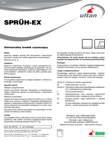 U24 SPRÜH-EX Uniwersalny środek czyszczący Skład: Sprüh-Ex zawiera: poniżej 15% anionowych i niejonowych tenzydów, mydła oraz środki zapachowe i konserwujące. Wartość pH ok. 8. W przypadku silnego tworzenia się piany należy użyć środka odpieniającego Entschäumer. (Entschäumer nie może dostać się do roztworu czyszczącego ani bezpośrednio na czyszczoną powierzchnię). Działanie: Sprüh-Ex rozpuszcza, emulguje i czyści szczególnie skutecznie nawet uciążliwe zabrudzenia na dywanach. Nie zawiera optycznych wybielaczy, środków rozjaśniających, rozpuszczalników i polimerów. Łatwo się pieni, posiada przyjemny zapach. Ekologia: Zastosowane w produkcie składniki ulegają biodegradacji. Dokładne informacje można uzyskać indywidualnie. Zakres stosowania: Do wszystkich odpornych na wilgoć wykładzin z włókna naturalnego i sztucznego. Sposób użycia: Wstępne przygotowanie: Dywan gruntownie odkurzyć. Sprawdzić w niewidocznym miejscu odporność dywanu na przemakanie i ewentualne odbarwienia. Maszyny czyszczące: Czyścić 2%-owym roztworem Sprüh-Ex (200 ml na 10 litrów wody) przy pomocy urządzeń rozpylająco-ekstrakcyjnych zgodnie z zaleceniami producenta tych urządzeń (Sprüh-Ex można stosować we wszystkich dostępnych na rynku urządzeniach tego typu). Wyczyszczone dywany pozostawić do wyschnięcia i w tym czasie nie należy po nich chodzić. Uwagi: W przypadku silnych zabrudzeń proces czyszczenia należy powtórzyć. Aby ułatwić usuwanie uciążliwych plam można zastosować wcześniej preparat Fleck-Ex Top. Art. Nr 04772 10 l kanister Werner & Mertz GmbH, Rheinallee 96, D-55120 MAINZ Tel./Fax 0049 6131 964-01/0049 6131 964-2494 Werner & Mertz POLSKA Sp. z o.o. 05-270 Marki, ul. Okólna 40, tel. 22 771 46 72, fax 22 614 17 54; www.werner-mertz.pl Uwagi o bezpieczeństwie: Przestrzegać ogólnych zasad bezpieczeństwa i higieny. Przed przerwą i po zakończeniu pracy umyć ręce. Przechowywać z dala od napojów, żywności i karmy dla zwierząt. Zwroty R (Określenie rodzaju zagrożenia): 36 Działa drażniąco na oczy. Zwroty S (Określenie dotyczące prawidłowego postępowania z niebezpieczną substancją): 2 Chronić przed dziećmi. 26 Zanieczyszczone oczy przemyć natychmiast dużą ilością wody i zasięgnąć porady lekarza. 35 Usuwać produkt i jego opakowanie w sposób bezpieczny. 46 W razie połknięcia niezwłocznie zasięgnij porady lekarza – pokaż opakowanie lub etykietę. Produkt jest przeznaczony do użytku profesjonalnego pRODUKT JEST WRAŻLIWY NA DZIAŁANIE NISKICH TEMPERATUR Więcej informacji na stronie: www.werner-mertz.pl