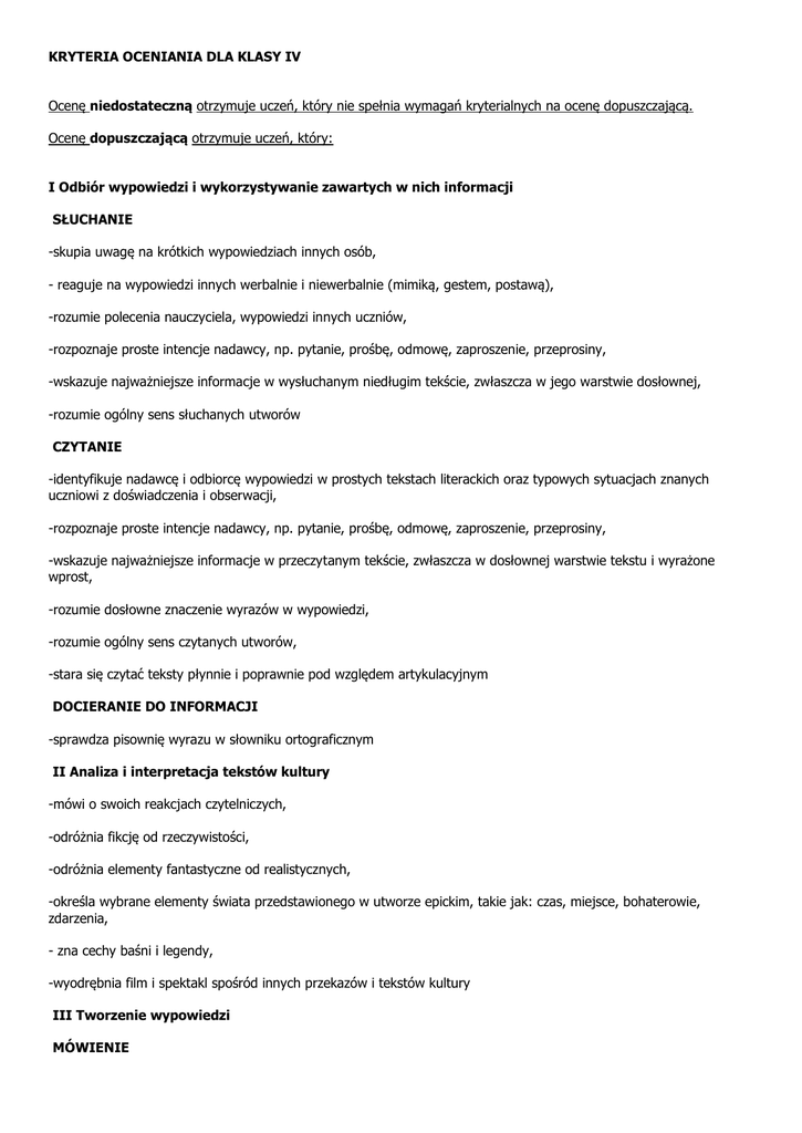 KRYTERIA OCENIANIA DLA KLASY IV Ocenę niedostateczną otrzymuje uczeń, który nie spełnia wymagań kryterialnych na ocenę dopuszczającą. Ocenę dopuszczającą otrzymuje uczeń, który: I Odbiór wypowiedzi i wykorzystywanie zawartych w nich informacji SŁUCHANIE -skupia uwagę na krótkich wypowiedziach innych osób, - reaguje na wypowiedzi innych werbalnie i niewerbalnie (mimiką, gestem, postawą), -rozumie polecenia nauczyciela, wypowiedzi innych uczniów, -rozpoznaje proste intencje nadawcy, np. pytanie, prośbę, odmowę, zaproszenie, przeprosiny, -wskazuje najważniejsze informacje w wysłuchanym niedługim tekście, zwłaszcza w jego warstwie dosłownej, -rozumie ogólny sens słuchanych utworów CZYTANIE -identyfikuje nadawcę i odbiorcę wypowiedzi w prostych tekstach literackich oraz typowych sytuacjach znanych uczniowi z doświadczenia i obserwacji, -rozpoznaje proste intencje nadawcy, np. pytanie, prośbę, odmowę, zaproszenie, przeprosiny, -wskazuje najważniejsze informacje w przeczytanym tekście, zwłaszcza w dosłownej warstwie tekstu i wyrażone wprost, -rozumie dosłowne znaczenie wyrazów w wypowiedzi, -rozumie ogólny sens czytanych utworów, -stara się czytać teksty płynnie i poprawnie pod względem artykulacyjnym DOCIERANIE DO INFORMACJI -sprawdza pisownię wyrazu w słowniku ortograficznym II Analiza i interpretacja tekstów kultury -mówi o swoich reakcjach czytelniczych, -odróżnia fikcję od rzeczywistości, -odróżnia elementy fantastyczne od realistycznych, -określa wybrane elementy świata przedstawionego w utworze epickim, takie jak: czas, miejsce, bohaterowie, zdarzenia, - zna cechy baśni i legendy, -wyodrębnia film i spektakl spośród innych przekazów i tekstów kultury III Tworzenie wypowiedzi MÓWIENIE -nawiązuje i podtrzymuje kontakt werbalny z innymi uczniami i nauczycielem, -formułuje proste pytania i udziela prostych pod względem konstrukcyjnym odpowiedzi, - wypowiada komunikaty zawierające proste informacje, -wyraża wprost swoje intencje, -odróżnia sytuację oficjalną od nieoficjalnej i potrafi odpowiednio do sytuacji komunikacyjnej skierować prośbę, pytanie, odmowę, wyjaśnienie, zaproszenie, -stosuje podstawowe zwroty grzecznościowe podczas rozmowy z osobą dorosłą i rówieśnikiem, -mówi na temat, opowiada o obserwowanych zdarzeniach, akcji książki, filmu, -za pomocą kilku prostych zdań opisuje przedmiot, miejsce, krajobraz, postać, zwierzę -za pomocą kilku prostych zdań opisuje obraz, ilustrację, plakat, -stosuje wyrazy o znaczeniu dosłownym, -wygłasza tekst utworu z pamięci PISANIE -stosuje wielką literę na początku wypowiedzenia i odpowiednie znaki interpunkcyjne na jego końcu, -zna podstawowe zasady dotyczące pisowni wielką literą oraz pisowni ó – u, rz – ż, ch – h, -dzieli wyrazy na sylaby, przenosi wyraz do następnego wersu, -tworzy proste wypowiedzi na podany temat, -uzupełnia prosty schemat, tabelę, -zna podstawowe zasady układu graficznego listu prywatnego, dialogu, zaproszenia, planu ramowego wypowiedzi i z pomocą nauczyciela zapisuje list, dialog, układa plan ramowy wypowiedzi, redaguje zaproszenie, -zapisuje kilkuzdaniowe opowiadanie odtwórcze, -za pomocą kilku prostych zdań tworzy opis przedmiotu, miejsca, krajobrazu, postaci, zwierzęcia, -za pomocą kilku prostych zdań tworzy opis obrazu, ilustracji, plakatu, -stosuje wiedzę językową w zakresie: słownictwa (np. dobiera wyrazy bliskoznaczne), składni (konstruuje poprawne zdania pojedyncze, stosuje wielkie litery na początku wypowiedzenia i odpowiednie znaki interpunkcyjne na końcu), fleksji (wskazuje czasowniki, rzeczowniki, przymiotniki i przysłówki w zdaniu, przy pomocy nauczyciela określa formę odmiennych części mowy), fonetyki (zna alfabet, dzieli wyrazy na litery, głoski i sylaby), -stara się o estetykę zapisu wypowiedzi Ocenę dostateczną otrzymuje uczeń, który spełnia wymagania kryterialne na ocenę dopuszczającą oraz: I Odbiór wypowiedzi i wykorzystywanie zawartych w nich informacji SŁUCHANIE -słucha innych i uczestniczy w rozmowie, zadaje pytania, odpowiada, -wybiera najważniejsze informacje z wysłuchanego tekstu, tworzy prostą notatkę w formie tabeli, schematu, kilkuzdaniowej wypowiedzi, -powtarza swoimi słowami ogólny sens usłyszanej wypowiedzi, opowiada fabułę usłyszanej historii, -rozpoznaje nastrój słuchanych komunikatów CZYTANIE -identyfikuje nadawcę i odbiorcę wypowiedzi, -określa temat i główną myśl tekstu, -oddziela informacje ważne od drugorzędnych, -wybiera potrzebne informacje z instrukcji, tabeli, notatki, schematu, -wskazuje przenośne znaczenie wyrazów w wypowiedzi, -rozpoznaje cechy zaproszenia, życzeń, ogłoszenia, instrukcji, przepisu, -wskazuje części składowe wypowiedzi: tytuł, wstęp, rozwinięcie, zakończenie, -poprawnie artykułuje i akcentuje wyrazy, stosuje intonację zdaniową podczas głośnego czytania utworów DOCIERANIE DO INFORMACJI: -wybiera odpowiednie informacje ze słownika ortograficznego, encyklopedii, czasopisma, stron internetowych II Analiza i interpretacja tekstów kultury -nazywa swoje reakcje czytelnicze, -dostrzega cechy wyróżniające teksty artystyczne (poetyckie i prozatorskie) oraz użytkowe, -odróżnia autora od osoby mówiącej w utworze, -określa i nazywa elementy świata przedstawionego w utworze epickim, takie jak: czas, miejsce, bohaterowie, zdarzenia, -wskazuje cechy baśni i legendy w utworze, -wie, czym jest: wers, zwrotka, rym, -wskazuje w tekście porównanie, przenośnię, -wyodrębnia film spośród innych dziedzin sztuki, -zna pojęcia: gra aktorska, dekoracja, kostiumy, rekwizyty, inscenizacja, scena, widownia, próba, -przypisuje cechy bohaterom oraz ocenia ich postawy w odniesieniu do takich wartości, jak np. miłość–nienawiść, przyjaźń – wrogość, -odczytuje sens utworów na poziomie semantycznym (dosłownym), -odczytuje morał baśni III Tworzenie wypowiedzi MÓWIENIE 