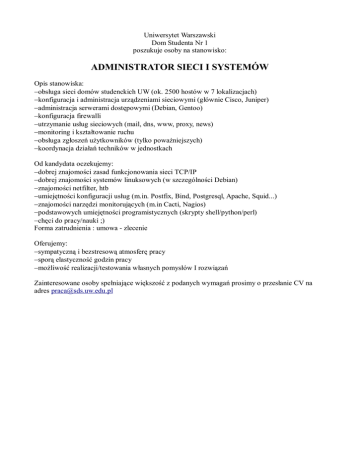 Uniwersytet Warszawski Dom Studenta Nr 1 poszukuje osoby na stanowisko: ADMINISTRATOR SIECI I SYSTEMÓW Opis stanowiska: -obsługa sieci domów studenckich UW (ok. 2500 hostów w 7 lokalizacjach) -konfiguracja i administracja urządzeniami sieciowymi (głównie Cisco, Juniper) -administracja serwerami dostępowymi (Debian, Gentoo) -konfiguracja firewalli -utrzymanie usług sieciowych (mail, dns, www, proxy, news) -monitoring i kształtowanie ruchu -obsługa zgłoszeń użytkowników (tylko poważniejszych) -koordynacja działań techników w jednostkach Od kandydata oczekujemy: -dobrej znajomości zasad funkcjonowania sieci TCP/IP -dobrej znajomości systemów linuksowych (w szczególności Debian) -znajomości netfilter, htb -umiejętności konfiguracji usług (m.in. Postfix, Bind, Postgresql, Apache, Squid...) -znajomości narzędzi monitorujących (m.in Cacti, Nagios) -podstawowych umiejętności programistycznych (skrypty shell/python/perl) -chęci do pracy/nauki ;) Forma zatrudnienia : umowa - zlecenie Oferujemy: -sympatyczną i bezstresową atmosferę pracy -sporą elastyczność godzin pracy -możliwość realizacji/testowania własnych pomysłów I rozwiązań Zainteresowane osoby spełniające większość z podanych wymagań prosimy o przesłanie CV na adres [email protected]