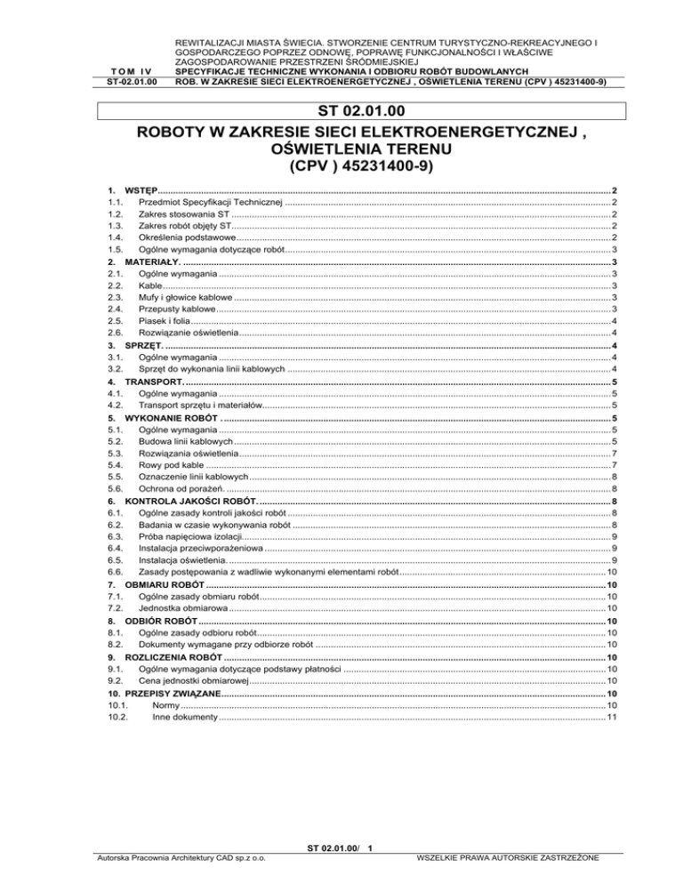 TOM IV ST-02.01.00 REWITALIZACJI MIASTA ŚWIECIA. STWORZENIE CENTRUM TURYSTYCZNO-REKREACYJNEGO I GOSPODARCZEGO POPRZEZ ODNOWĘ, POPRAWĘ FUNKCJONALNOŚCI I WŁAŚCIWE ZAGOSPODAROWANIE PRZESTRZENI ŚRÓDMIEJSKIEJ SPECYFIKACJE TECHNICZNE WYKONANIA I ODBIORU ROBÓT BUDOWLANYCH ROB. W ZAKRESIE SIECI ELEKTROENERGETYCZNEJ , OŚWIETLENIA TERENU (CPV ) 45231400-9) ST 02.01.00 ROBOTY W ZAKRESIE SIECI ELEKTROENERGETYCZNEJ , OŚWIETLENIA TERENU (CPV ) 45231400-9) 1. WSTĘP.................................................................................................................................................................................. 2 1.1. Przedmiot Specyfikacji Technicznej ................................................................................................................................ 2 1.2. Zakres stosowania ST ..................................................................................................................................................... 2 1.3. Zakres robót objęty ST..................................................................................................................................................... 2 1.4. Określenia podstawowe................................................................................................................................................... 2 1.5. Ogólne wymagania dotyczące robót................................................................................................................................ 3 2. MATERIAŁY. ........................................................................................................................................................................ 3 2.1. Ogólne wymagania .......................................................................................................................................................... 3 2.2. Kable................................................................................................................................................................................ 3 2.3. Mufy i głowice kablowe .................................................................................................................................................... 3 2.4. Przepusty kablowe........................................................................................................................................................... 3 2.5. Piasek i folia..................................................................................................................................................................... 4 2.6. Rozwiązanie oświetlenia.................................................................................................................................................. 4 3. SPRZĘT. ............................................................................................................................................................................... 4 3.1. Ogólne wymagania .......................................................................................................................................................... 4 3.2. Sprzęt do wykonania linii kablowych ............................................................................................................................... 4 4. TRANSPORT. ....................................................................................................................................................................... 5 4.1. Ogólne wymagania .......................................................................................................................................................... 5 4.2. Transport sprzętu i materiałów......................................................................................................................................... 5 5. WYKONANIE ROBÓT . ........................................................................................................................................................ 5 5.1. Ogólne wymagania .......................................................................................................................................................... 5 5.2. Budowa linii kablowych .................................................................................................................................................... 5 5.3. Rozwiązania oświetlenia.................................................................................................................................................. 7 5.4. Rowy pod kable ............................................................................................................................................................... 7 5.5. Oznaczenie linii kablowych .............................................................................................................................................. 8 5.6. Ochrona od porażeń. ....................................................................................................................................................... 8 6. KONTROLA JAKOŚCI ROBÓT. .......................................................................................................................................... 8 6.1. Ogólne zasady kontroli jakości robót ............................................................................................................................... 8 6.2. Badania w czasie wykonywania robót ............................................................................................................................. 8 6.3. Próba napięciowa izolacji................................................................................................................................................. 9 6.4. Instalacja przeciwporażeniowa .............................................................................................................................
