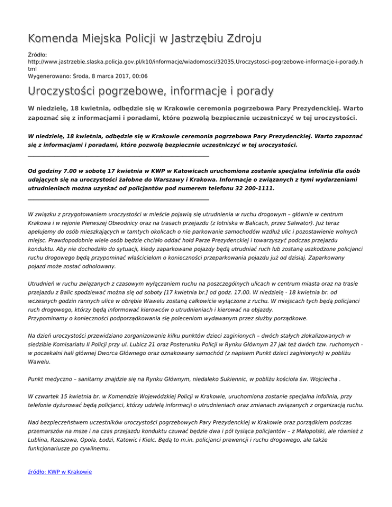 Komenda Miejska Policji w Jastrzębiu Zdroju Źródło: http://www.jastrzebie.slaska.policja.gov.pl/k10/informacje/wiadomosci/32035,Uroczystosci-pogrzebowe-informacje-i-porady.h tml Wygenerowano: Środa, 8 marca 2017, 00:06 Uroczystości pogrzebowe, informacje i porady W niedzielę, 18 kwietnia, odbędzie się w Krakowie ceremonia pogrzebowa Pary Prezydenckiej. Warto zapoznać się z informacjami i poradami, które pozwolą bezpiecznie uczestniczyć w tej uroczystości. W niedzielę, 18 kwietnia, odbędzie się w Krakowie ceremonia pogrzebowa Pary Prezydenckiej. Warto zapoznać się z informacjami i poradami, które pozwolą bezpiecznie uczestniczyć w tej uroczystości. ____________________________________________________________________ Od godziny 7.00 w sobotę 17 kwietnia w KWP w Katowicach uruchomiona zostanie specjalna infolinia dla osób udających się na uroczystości żałobne do Warszawy i Krakowa. Informacje o związanych z tymi wydarzeniami utrudnieniach można uzyskać od policjantów pod numerem telefonu 32 200-1111. ____________________________________________________________________ W związku z przygotowaniem uroczystości w mieście pojawią się utrudnienia w ruchu drogowym – głównie w centrum Krakowa i w rejonie Pierwszej Obwodnicy oraz na trasach przejazdu (z lotniska w Balicach, przez Salwator). Już teraz apelujemy do osób mieszkających w tamtych okolicach o nie parkowanie samochodów wzdłuż ulic i pozostawienie wolnych miejsc. Prawdopodobnie wiele osób będzie chciało oddać hołd Parze Prezydenckiej i towarzyszyć podczas przejazdu konduktu. Aby nie dochodziło do sytuacji, kiedy zaparkowane pojazdy będą utrudniać ruch lub zostaną uszkodzone policjanci ruchu drogowego będą przypominać właścicielom o konieczności przeparkowania pojazdu już od dzisiaj. Zaparkowany pojazd może zostać odholowany. Utrudnień w ruchu związanych z czasowym wyłączaniem ruchu na poszczególnych ulicach w centrum miasta oraz na trasie przejazdu z Balic spodziewać można się od soboty [17 kwietnia br.] od godz. 17.00. W niedzielę - 18 kwietnia br. od wczesnych godzin rannych ulice w obrębie Wawelu zostaną całkowicie wyłączone z ruchu. W miejscach tych będą policjanci ruch drogowego, którzy będą informować kierowców o utrudnieniach i kierować na objazdy. Przypominamy o konieczności podporządkowania się poleceniom wydawanym przez służby porządkowe. Na dzień uroczystości przewidziano zorganizowanie kilku punktów dzieci zaginionych – dwóch stałych zlokalizowanych w siedzibie Komisariatu II Policji przy ul. Lubicz 21 oraz Posterunku Policji w Rynku Głównym 27 jak też dwóch tzw. ruchomych w poczekalni hali głównej Dworca Głównego oraz oznakowany samochód (z napisem Punkt dzieci zaginionych) w pobliżu Wawelu. Punkt medyczno – sanitarny znajdzie się na Rynku Głównym, niedaleko Sukiennic, w pobliżu kościoła św. Wojciecha . W czwartek 15 kwietnia br. w Komendzie Wojewódzkiej Policji w Krakowie, uruchomiona zostanie specjalna infolinia, przy telefonie dyżurować będą policjanci, którzy udzielą informacji o utrudnieniach oraz zmianach związanych z organizacją ruchu. Nad bezpieczeństwem uczestników uroczystości pogrzebowych Pary Prezydenckiej w Krakowie oraz porządkiem podczas przemarszów na msze i na czas przejazdu konduktu czuwać będzie dwa i pół tysiąca policjantów – z Małopolski, ale również z Lublina, Rzeszowa, Opola, Łodzi, Katowic i Kielc. Będą to m.in. policjanci prewencji i ruchu drogowego, ale także funkcjonariusze po cywilnemu. źródło: KWP w Krakowie Zobacz ZAŁĄCZNIKI DO STRONY Ważne informacje i nr telefonów 1.04 MB Ocena: 0/5 (0) Tweetnij