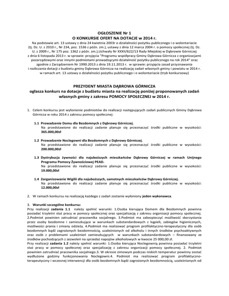 OGŁOSZENIE Nr 1 O KONKURSIE OFERT NA DOTACJE w 2014 r. Na podstawie art. 13 ustawy z dnia 24 kwietnia 2003r o działalności pożytku publicznego i o wolontariacie (tj. Dz. U. z 2010 r., Nr 234, poz. 1536 z późn. zm.), ustawy z dnia 12 marca 2004 r. o pomocy społecznej (tj. Dz. U. z 2009 r., Nr 175 poz. 1362 z późn. zm.),Uchwały Nr XXXII/622/13 Rady Miejskiej w Dąbrowie Górniczej z dnia 6 listopada 2013 r. w sprawie: przyjęcia "Programu współpracy Gminy Dąbrowa Górnicza z organizacjami pozarządowymi oraz innymi podmiotami prowadzącymi działalność pożytku publicznego na rok 2014" oraz zgodnie z Zarządzeniem Nr 1990.2013 z dnia 19.11.2013 r. w sprawie: przyjęcia zasad przyznawania i rozliczania dotacji z budżetu gminy Dąbrowa Górnicza na realizację zadań własnych gminy i powiatu w 2014 r. w ramach art. 13 ustawy o działalności pożytku publicznego i o wolontariacie (tryb konkursowy) PREZYDENT MIASTA DĄBROWA GÓRNICZA ogłasza konkurs na dotacje z budżetu miasta na realizację poniżej proponowanych zadań własnych gminy z zakresu POMOCY SPOŁECZNEJ w 2014 r. 1. Celem konkursu jest wyłonienie podmiotów do realizacji następujących zadań publicznych Gminy Dąbrowa Górnicza w roku 2014 z zakresu pomocy społecznej: 1.1 Prowadzenie Domu dla Bezdomnych z Dąbrowy Górniczej. Na przedstawione do realizacji zadanie planuje się przeznaczyć środki publiczne w wysokości: 365.000,00zł 1.2 Prowadzenie Noclegowni dla Bezdomnych z Dąbrowy Górniczej. Na przedstawione do realizacji zadanie planuje się przeznaczyć środki publiczne w wysokości: 200.000,00zł 1.3 Dystrybucja żywności dla najuboższych mieszkańców Dąbrowy Górniczej w ramach Unijnego Programu Pomocy Żywnościowej PEAD. Na przedstawione do realizacji zadanie planuje się przeznaczyć środki publiczne w wysokości: 19.000,00zł 1.4 Zorganizowanie Wigilii dla najuboższych, samotnych mieszkańców Dąbrowy Górniczej. Na przedstawione do realizacji zadanie planuje się przeznaczyć środki publiczne w wysokości: 12.000,00zł 2. W ramach konkursu na realizację każdego z zadań zostanie wyłoniony jeden wykonawca. 3. Warunki szczególne konkursu: Przy realizacji zadania 1.1 należy spełnić warunki: 1.Osoba kierująca Domem dla Bezdomnych powinna posiadać trzyletni staż pracy w pomocy społecznej oraz specjalizację z zakresu organizacji pomocy społecznej. 2.Podmiot powinien zatrudniać pracownika socjalnego. 3.Podmiot ma zabezpieczyć możliwość skorzystania przez osoby bezdomne i zamieszkujące w warunkach substandardowych z kąpieli, zabiegów higienicznych, możliwości prania i zmiany odzieży. 4.Podmiot ma realizować program profilaktyczno-terapeutyczny dla osób bezdomnych bądź zagrożonych bezdomnością, uzależnionych od alkoholu i innych środków psychoaktywnych oraz osób z problemami uzależnień zamieszkujących w warunkach substandardowych – finansowany ze środków pochodzących z zezwoleń na sprzedaż napojów alkoholowych w kwocie 25 000,00 zł. Przy realizacji zadania 1.2 należy spełnić warunki: 1.Osoba kierująca Noclegownią powinna posiadać trzyletni staż pracy w pomocy społecznej oraz specjalizację z zakresu organizacji pomocy społecznej. 2. Podmiot powinien zatrudniać pracownika socjalnego.3. W okresie zimowym podczas niskich temperatur powinny zostać wydłużone godziny funkcjonowania Noclegowni.4. Podmiot ma realizować program profilaktycznoterapeutyczny i wczesnej interwencji dla osób bezdomnych bądź zagrożonych bezdomnością, uzależnionych od alkoholu i innych środków psychoaktywnych – finansowany ze środków pochodzących z zezwoleń na sprzedaż napojów alkoholowych w kwocie 20 000,00 zł. 4. Zlecenie realizacji w/w zadań publicznych będzie miało formę wspierania tych zadań wraz z udzieleniem dotacji na dofinansowanie ich realizacji. 5. Przyznanie dotacji ma miejsce tylko w przypadku wniesienia przez Dotowanego nie mniej niż 5 % wkładu własnego finansowego lub niefinansowego wkładu własnego osobowego (tzw. wolontariatu). 6. Okres realizacji zadań rozpoczyna się dnia 1.01.2014r. i kończy dnia 31.12.2014r. Jako koszty kwalifikowane finansowane z dotacji będą traktowane tylko te, które zostaną poniesione od dnia podpisania umowy. Koszty poniesione w terminie przed podpisaniem umowy mogą stanowić jedynie koszty własne. 7. Szczegółowe zasady przyznawania i rozliczania dotacji z budżetu Gminy Dąbrowa Górnicza na realizację zadań własnych gminy i powiatu w 2014 roku określone zostały w Zarządzeniu Nr 1990.2013 Prezydenta Miasta Dąbrowy Górniczej z dnia 19.11.2013 r. Ze szczegółowymi warunkami konkursu można zapoznać się w Biurze Organizacji Pozarządowych i Aktywności Obywatelskiej Urzędu Miejskiego w Dąbrowie Górniczej ul. Graniczna 21 (p.327), w Inkubatorze Społecznej Przedsiębiorczości w Dąbrowie Górniczej, Al. T. Kościuszki 25 oraz na stronach www.ngo.dabrowa-gornicza.pl i www.bip.dabrowa-gornicza.pl. 8. Podmiotami mogącymi ubiegać się o dotacje są: a) Organizacje pozarządowe, czyli niebędące jednostkami sektora finansów publicznych, w rozumieniu ustawy o finansach publicznych, niedziałające w celu osiągnięcia zysku osoby prawne lub jednostki organizacyjne nieposiadające osobowości prawnej, którym odrębna ustawa przyznaje zdolność prawną, w tym fundacje i stowarzyszenia, z wyłączeniem: partii politycznych, związków zawodowych i organizacji pracodawców, samorządów zawodowych, fundacji utworzonych przez partie polityczne; b) osoby prawne i jednostki organizacyjne działające na podstawie przepisów o stosunku Państwa do Kościoła Katolickiego w Rzeczypospolitej Polskiej, o stosunku Państwa do innych kościołów i związków wyznaniowych oraz o gwarancjach wolności sumienia i wyznania, jeżeli ich cele statutowe obejmują prowadzenie działalności pożytku publicznego; c) stowarzyszenia jednostek samorządu terytorialnego; d) spółdzielnie socjalne; 