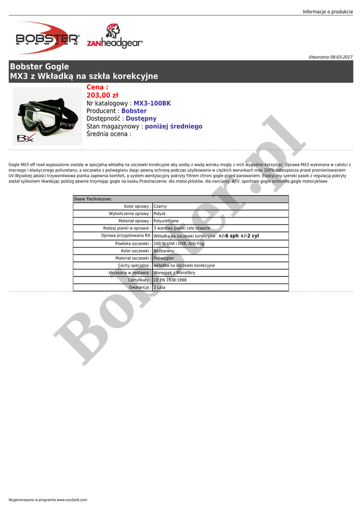 Informacje o produkcie Utworzono 08-03-2017 Bobster Gogle MX3 z Wkładką na szkła korekcyjne Cena : 203,00 zł .p l Nr katalogowy : MX3-100BK Producent : Bobster Dostępność : Dostępny Stan magazynowy : poniżej średniego Średnia ocena : Dane Techniczne: er Gogle MX3 off road wyposażone zostały w specjalną wkładkę na soczewki korekcyjne aby osoby z wadą wzroku mogły z nich wygodnie korzystać. Oprawa MX3 wykonana w całości z mocnego i elastycznego poliuretanu, a soczewka z poliwęglanu dając pewną ochronę podczas użytkowania w ciężkich warunkach oraz 100% zabezpiecza przed promieniowaniem UV.Wysokiej jakości trzywarstwowa pianka zapewnia komfort, a system wentylacyjny pokryty filtrem chroni gogle przed parowaniem. Elastyczny szeroki pasek z regulacją pokryty został sylikonem likwidując poślizg pewnie trzymając gogle na kasku.Przeznaczenie: dla motocyklistów, dla narciarzy, ATV, sportowe gogle ochronne,gogle motocyklowe Kolor oprawy : Czarny Wykończenie oprawy : Połysk Materiał oprawy : Polyurethane Rodzaj pianki w oprawie : 3 warstwy pianki cele otwarte Oprawa przygotowana RX: Wkładka na soczewki korekcyjne +/-6 sph +/-2 cyl st Powłoka soczewki : 100 % UVA i UVB, Anti-Fog Kolor soczewki : Bezbarwny Materiał soczewki : Poliwęglan Cechy specjalne : wkładka na soczewki korekcyjne Akcesoria w zestawie : Woreczek z Mikrofibry ob Certyfikaty : CE EN 1938:1998 B Gwarancja : 2 Lata Wygenerowano w programie www.oscGold.com