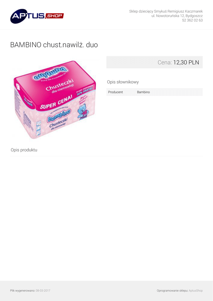 Sklep dziecięcy Smykuś Remigiusz Kaczmarek ul. Nowotoruńska 12, Bydgoszcz 52 362 02 63 BAMBINO chust.nawilż. duo Cena: 12,30 PLN Opis słownikowy Producent Bambino Opis produktu Plik wygenerowano: 08-03-2017 Powered by TCPDF (www.tcpdf.org) Oprogramowanie sklepu: AptusShop