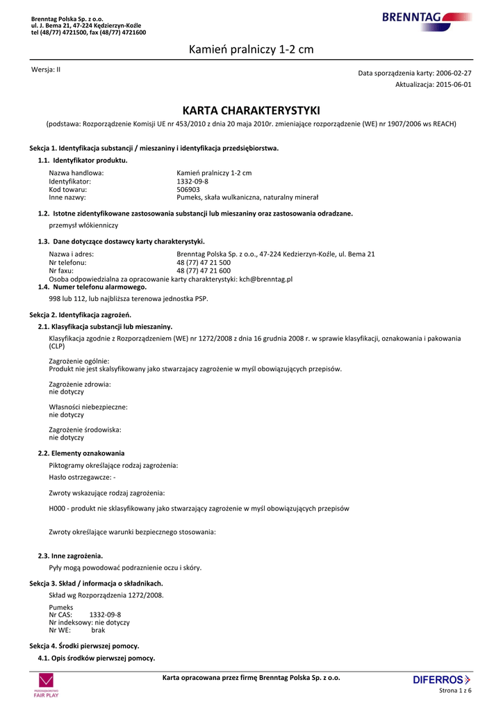 Brenntag Polska Sp. z o.o. ul. J. Bema 21, 47-224 Kędzierzyn-Koźle tel (48/77) 4721500, fax (48/77) 4721600 Kamień pralniczy 1-2 cm Wersja: II Data sporządzenia karty: 2006-02-27 Aktualizacja: 2015-06-01 KARTA CHARAKTERYSTYKI (podstawa: Rozporządzenie Komisji UE nr 453/2010 z dnia 20 maja 2010r. zmieniające rozporządzenie (WE) nr 1907/2006 ws REACH) Sekcja 1. Identyfikacja substancji / mieszaniny i identyfikacja przedsiębiorstwa. 1.1. Identyfikator produktu. Nazwa handlowa: Identyfikator: Kod towaru: Inne nazwy: Kamień pralniczy 1-2 cm 1332-09-8 506903 Pumeks, skała wulkaniczna, naturalny minerał 1.2. Istotne zidentyfikowane zastosowania substancji lub mieszaniny oraz zastosowania odradzane. przemysł włókienniczy 1.3. Dane dotyczące dostawcy karty charakterystyki. Nazwa i adres: Brenntag Polska Sp. z o.o., 47-224 Kedzierzyn-Koźle, ul. Bema 21 Nr telefonu: 48 (77) 47 21 500 Nr faxu: 48 (77) 47 21 600 Osoba odpowiedzialna za opracowanie karty charakterystyki: [email protected] 1.4. Numer telefonu alarmowego. 998 lub 112, lub najbliższa terenowa jednostka PSP. Sekcja 2. Identyfikacja zagrożeń. 2.1. Klasyfikacja substancji lub mieszaniny. Klasyfikacja zgodnie z Rozporządzeniem (WE) nr 1272/2008 z dnia 16 grudnia 2008 r. w sprawie klasyfikacji, oznakowania i pakowania (CLP) Zagrożenie ogólnie: Produkt nie jest skalsyfikowany jako stwarzajacy zagrożenie w myśl obowiązujących przepisów. Zagrożenie zdrowia: nie dotyczy Własności niebezpieczne: nie dotyczy Zagrożenie środowiska: nie dotyczy 2.2. Elementy oznakowania Piktogramy określające rodzaj zagrożenia: Hasło ostrzegawcze: Zwroty wskazujące rodzaj zagrożenia: H000 - produkt nie sklasyfikowany jako stwarzający zagrożenie w myśl obowiązujących przepisów Zwroty określające warunki bezpiecznego stosowania: 2.3. Inne zagrożenia. Pyły mogą powodować podraznienie oczu i skóry. Sekcja 3. Skład / informacja o składnikach. Skład wg Rozporządzenia 1272/2008. Pumeks Nr CAS: 1332-09-8 Nr indeksowy: nie dotyczy Nr WE: brak Sekcja 4. Środki pierwszej pomocy. 4.1. Opis środków pierwszej pomocy. Karta opracowana przez firmę Brenntag Polska Sp. z o.o. Strona 1 z 6 Brenntag Polska Sp. z o.o. ul. J. Bema 21, 47-224 Kędzierzyn-Koźle tel (48/77) 4721500, fax (48/77) 4721600 Kamień pralniczy 1-2 cm Wdychanie: W razie narażenia inhalacyjnego na wdychanie pyłu zapewnić dostęp świeżego powietrza. Przy wystąpieniu dolegliwości skonsultować się z lekarzem. Kontakt ze skórą: W razie zanieczyszczenia skóry zmyć wodą. Kontakt z oczami: W razie zanieczyszczania oczu pyłem natychmiast przemywać dużą ilością wody przez co najmniej 15 minut przy szeroko otwartych powiekach. Spożycie: nie dotyczy 4.2. Najważniejsze ostre i opóźnione objawy oraz skutki narażenia. brak dostępnych danych 4.3. Wskazania dotyczące wszelkiej natychmiastowej pomocy lekarskiej i szczególnego postępowania z poszkodowanym. brak dostępnych danych Sekcja 5. Postępowanie w przypadku pożaru. 5.1. Środki gaśnicze. Pożary w obecności produktu gasić środkami odpowiednimi dla palących się materiałów. 5.2. Szczególne zagrożenia związane z substancją lub mieszaniną. Produkt niepalny. 5.3. Informacje dla straży pożarnej. brak szczególnych zaleceń Sekcja 6. Postępowanie w przypadku niezamierzonego uwolnienia do środowiska. 6.1. Indywidualne środki ostrożności, wyposażenie ochronne i procedury w sytuacjach awaryjnych. Stosować środki ochrony osobistej. Unikać wdychania pyłu. 6.2. Środki ostrożności w zakresie ochrony środowiska. nie są wymagane 6.3. Metody i materiały zapobiegające rozprzestrzenianiu się skażenia i służące do usuwania skażenia. Nie należy pozostawiac produktu przez dłuzszy czas na słońcu, ponieważ ulega spyleniu. Rozsypany produkt zebrać mechanicznie, pozostałość spłukać dużą ilością wody. Przekazać do likwidacji. 6.4. Odniesienia do innych sekcji. Informacje dotyczące odpowiedniego sprzętu ochrony osobistej podano w sekcji 8. Usuwać zgodnie z zaleceniami przedstawionymi w sekcji 13 Sekcja 7. Postępowanie z substancjami i mieszaninami oraz ich magazynowanie. 7.1. Środki ostrożności dotyczące bezpiecznego postępowania. Unikać wzniecania pyłu, stosować wentylację. Unikać zanieczyszczenia oczu i skóry. Nie wdychać pyłu. 7.2. Warunki bezpiecznego magazynowania, łącznie z informacjami dotyczącymi wszelkich wzajemnych niezgodności. Chronić przed wilgocią. Chronic przed bezposrednim nasłonecznieniem. 7.3. Szczególne zastosowania końcowe. brak dostępnych danych Sekcja 8. Kontrola narażenia / środki ochrony indywidualnej. 8.1. Parametry dotyczące kontroli. NDS, NDSCh - nie ustalono (wg Rozporzadzenia MPiPS z dn. 29 listopada 2002 ; Dz.U. Nr 217, poz. 1833 z późniejszymi zmianami) Zalecenia dotyczące procedury monitoringu zawartości składników niebezpiecznych w powietrzu – metodyka pomiarów: -Rozporządzenie Ministra Zdrowia z dnia 20 kwietnia 2005 r. w sprawie badań i pomiarów czynników szkodliwych dla zdrowia w środowisku pracy (Dz.U. Nr 73, poz.645) -PN-89/Z-01001/06. Ochrona czystości powietrza. Nazwy, określenia i jednostki. Terminologia dotycząca badań jakości powietrza na stanowiskach pracy. -PN Z-04008-7:2002. Ochrona czystości powietrza. Pobieranie próbek. Zasady pobierania próbek powietrza w środowisku pracy i Karta opracowana przez firmę Brenntag Polska Sp. z o.o. Strona 2 z 6 Brenntag Polska Sp. z o.o. ul. J. Bema 21, 47-224 Kędzierzyn-Koźle tel (48/77) 4721500, fax (48/77) 4721600 Kamień pralniczy 1-2 cm interpretacja wyników. -PN-EN-689: 2002. Powietrze na stanowiskach pracy – wytyczne oceny narażenia inhalacyjnego na czynniki chemiczne przez porównanie z wartościami dopuszczalnymi i strategia pomiarowa. Uwaga: Gdy stężenie substancji jest ustalone i znane, doboru środków ochrony indywidualnej należy dokonywać z uwzględnieniem stężenia substancji występującego na danym stano