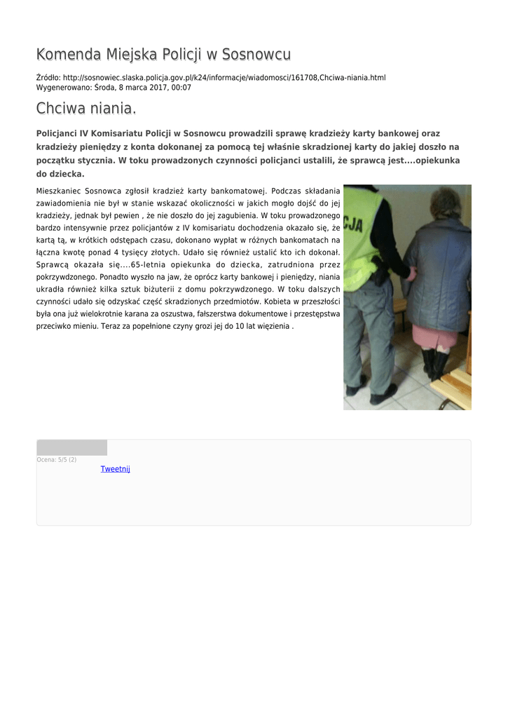 Komenda Miejska Policji w Sosnowcu Źródło: http://sosnowiec.slaska.policja.gov.pl/k24/informacje/wiadomosci/161708,Chciwa-niania.html Wygenerowano: Środa, 8 marca 2017, 00:07 Chciwa niania. Policjanci IV Komisariatu Policji w Sosnowcu prowadzili sprawę kradzieży karty bankowej oraz kradzieży pieniędzy z konta dokonanej za pomocą tej właśnie skradzionej karty do jakiej doszło na początku stycznia. W toku prowadzonych czynności policjanci ustalili, że sprawcą jest....opiekunka do dziecka. Mieszkaniec Sosnowca zgłosił kradzież karty bankomatowej. Podczas składania zawiadomienia nie był w stanie wskazać okoliczności w jakich mogło dojść do jej kradzieży, jednak był pewien , że nie doszło do jej zagubienia. W toku prowadzonego bardzo intensywnie przez policjantów z IV komisariatu dochodzenia okazało się, że kartą tą, w krótkich odstępach czasu, dokonano wypłat w różnych bankomatach na łączna kwotę ponad 4 tysięcy złotych. Udało się również ustalić kto ich dokonał. Sprawcą okazała się....65-letnia opiekunka do dziecka, zatrudniona przez pokrzywdzonego. Ponadto wyszło na jaw, że oprócz karty bankowej i pieniędzy, niania ukradła również kilka sztuk biżuterii z domu pokrzywdzonego. W toku dalszych czynności udało się odzyskać część skradzionych przedmiotów. Kobieta w przeszłości była ona już wielokrotnie karana za oszustwa, fałszerstwa dokumentowe i przestępstwa przeciwko mieniu. Teraz za popełnione czyny grozi jej do 10 lat więzienia . Ocena: 5/5 (2) Tweetnij