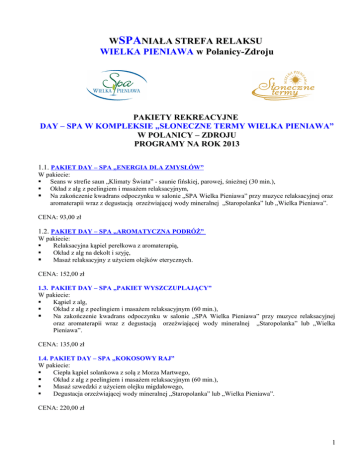 WSPANIAŁA STREFA RELAKSU WIELKA PIENIAWA w Polanicy-Zdroju PAKIETY REKREACYJNE DAY – SPA W KOMPLEKSIE „SŁONECZNE TERMY WIELKA PIENIAWA” W POLANICY – ZDROJU PROGRAMY NA ROK 2013 1.1. PAKIET DAY – SPA „ENERGIA DLA ZMYSŁÓW” W pakiecie: Seans w strefie saun „Klimaty Świata” - saunie fińskiej, parowej, śnieżnej (30 min.), Okład z alg z peelingiem i masażem relaksacyjnym, Na zakończenie kwadrans odpoczynku w salonie „SPA Wielka Pieniawa” przy muzyce relaksacyjnej oraz aromaterapii wraz z degustacją orzeźwiającej wody mineralnej „Staropolanka” lub „Wielka Pieniawa”. CENA: 93,00 zł 1.2. PAKIET DAY – SPA „AROMATYCZNA PODRÓŻ” W pakiecie: Relaksacyjna kąpiel perełkowa z aromaterapią, Okład z alg na dekolt i szyję, Masaż relaksacyjny z użyciem olejków eterycznych. CENA: 152,00 zł 1.3. PAKIET DAY – SPA „PAKIET WYSZCZUPLAJĄCY” W pakiecie: Kąpiel z alg, Okład z alg z peelingiem i masażem relaksacyjnym (60 min.), Na zakończenie kwadrans odpoczynku w salonie „SPA Wielka Pieniawa” przy muzyce relaksacyjnej oraz aromaterapii wraz z degustacją orzeźwiającej wody mineralnej „Staropolanka” lub „Wielka Pieniawa”. CENA: 135,00 zł 1.4. PAKIET DAY – SPA „KOKOSOWY RAJ” W pakiecie: Ciepła kąpiel solankowa z solą z Morza Martwego, Okład z alg z peelingiem i masażem relaksacyjnym (60 min.), Masaż szwedzki z użyciem olejku migdałowego, Degustacja orzeźwiającej wody mineralnej „Staropolanka” lub „Wielka Pieniawa”. CENA: 220,00 zł 1 1.5. PAKIET DAY – SPA „POPOŁUDNIE Z PRZYJACIÓŁKĄ” (pakiet dla 2 osób) W pakiecie: Ciepła kąpiel solankowa z solą z Morza Martwego, Antycellulitowy masaż bańką chińską, Aromatyczny seans zapachowy w saunie fińskiej (60 min.) w tym aromaterapia oraz koloroterapia pod „prysznicem wrażeń”, Manualny masaż antycelulitowy, Na zakończenie kwadrans odpoczynku w salonie „SPA Wielka Pieniawa” przy muzyce relaksacyjnej oraz aromaterapii wraz z degustacją orzeźwiającej wody mineralnej „Staropolanka” lub „Wielka Pieniawa”. CENA: 127,00 zł 1.6. PAKIET DAY – SPA „SZYBKA REGENERACJA DLA PANÓW” W pakiecie: Seans w strefie saun „Klimaty Świata” - saunie fińskiej, parowej, śnieżnej (60 min.), Masaż szwedzki. CENA: 117,00 zł 1.7. PAKIET DAY – SPA „CHWILA RELAKSU” W pakiecie: Rozgrzewająca kąpiel z solą z Morza Martwego, Okłady z alg na całe ciało, Seans w strefie saun „Klimaty Świata” - saunie fińskiej, parowej, śnieżnej (30 min.), Masaż relaksacyjny z użyciem olejków eterycznych. CENA: 196,00 zł 1.8. PAKIET DAY – SPA „PAKIET ANTYCELLULITOWY” W pakiecie: Seans w strefie saun „Klimaty Świata” - saunie fińskiej, parowej, śnieżnej (30 min.), Kąpiel rekreacyjna w basenie z 14 stacjami masażu (30 min.), Kąpiel z alg, Masaż antycellulitowy bańką chińską, Na zakończenie kwadrans odpoczynku w salonie „SPA Wielka Pieniawa” przy muzyce relaksacyjnej oraz aromaterapii wraz z degustacją orzeźwiającej wody mineralnej „Staropolanka” lub „Wielka Pieniawa”. CENA: 104,00 zł 1.9. PAKIET DAY – SPA „ROMANTYCZNY WEEKAND DLA DWOJGA” W pakiecie: Seans w strefie saun „Klimaty Świata” - saunie fińskiej, parowej, śnieżnej (60 min.) – strefa saun na wyłączność po godzinie 21.00/22.00 (w zależności od sezonu). Uwagi: wymagana jest wcześniejsza rezerwacja terminu oraz godziny wynajęcia strefy saun na wyłączność u pracownika kompleksu na min. 3 dni przed dokonaniem rezerwacji. Realizacja usługi – w godzinach funkcjonowania kompleksu. CENA: 144,00 zł 1.10. PAKIET DAY – SPA „PODRÓŻ W KLIMATY ŚWIATA” DLA 6 OSÓB W pakiecie: Seans w strefie saun „Klimaty Świata” - saunie fińskiej, parowej, śnieżnej (60 min.) – strefa saun na wyłączność dla max 6 osób po godzinie 21.00/22.00 (w zależności od sezonu). 2 Uwagi: wymagana jest wcześniejsza rezerwacja terminu oraz godziny wynajęcia strefy saun na wyłączność u pracownika kompleksu na min. 3 dni przed dokonaniem rezerwacji. Realizacja usługi – w godzinach funkcjonowania kompleksu. CENA: 188,00 zł 1.11. PAKIET DAY – SPA „PODRÓŻ W KLIMATY ŚWIATA” DLA 12 OSÓB W pakiecie: Seans w strefie saun „Klimaty Świata” - saunie fińskiej, parowej, śnieżnej (60 min.) – strefa saun na wyłączność dla max 12 osób po godzinie 21.00/22.00 (w zależności od sezonu). Uwagi: wymagana jest wcześniejsza rezerwacja terminu oraz godziny wynajęcia strefy saun na wyłączność u pracownika kompleksu na min. 3 dni przed dokonaniem rezerwacji. Realizacja usługi – w godzinach funkcjonowania kompleksu. CENA: 260,00 zł 1.12. PAKIET DAY – SPA „TWÓJ DZIEŃ” W pakiecie: Kompleks basenów „Słoneczne Termy Wielka pieniawa” na wyłączność (60 min.). Uwagi: wymagana jest wcześniejsza rezerwacja terminu oraz godziny wynajęcia basenów na wyłączność u pracownika kompleksu na min. 3 dni przed dokonaniem rezerwacji. Realizacja usługi – w godzinach funkcjonowania basenów. Strefa saun płatna dodatkowo zgodnie z cennikiem. Maksymalna liczba osób korzystających z usługi – 50. CENA ZA PIERWSZE 60 MINUT: 672,00 zł CENA ZA KOLEJNE 60 MINUT: 576,00 zł 3