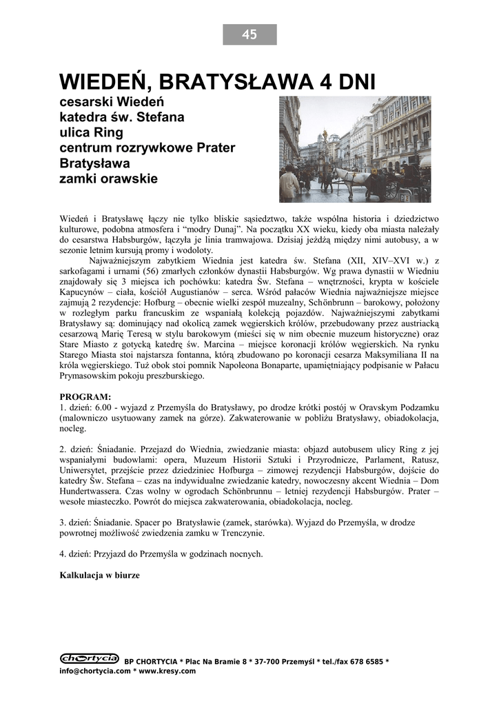 45 WIEDEŃ, BRATYSŁAWA 4 DNI cesarski Wiedeń katedra św. Stefana ulica Ring centrum rozrywkowe Prater Bratysława zamki orawskie Wiedeń i Bratysławę łączy nie tylko bliskie sąsiedztwo, także wspólna historia i dziedzictwo kulturowe, podobna atmosfera i “modry Dunaj”. Na początku XX wieku, kiedy oba miasta należały do cesarstwa Habsburgów, łączyła je linia tramwajowa. Dzisiaj jeżdżą między nimi autobusy, a w sezonie letnim kursują promy i wodoloty. Najważniejszym zabytkiem Wiednia jest katedra św. Stefana (XII, XIV–XVI w.) z sarkofagami i urnami (56) zmarłych członków dynastii Habsburgów. Wg prawa dynastii w Wiedniu znajdowały się 3 miejsca ich pochówku: katedra Św. Stefana – wnętrzności, krypta w kościele Kapucynów – ciała, kościół Augustianów – serca. Wśród pałaców Wiednia najważniejsze miejsce zajmują 2 rezydencje: Hofburg – obecnie wielki zespół muzealny, Schönbrunn – barokowy, położony w rozległym parku francuskim ze wspaniałą kolekcją pojazdów. Najważniejszymi zabytkami Bratysławy są: dominujący nad okolicą zamek węgierskich królów, przebudowany przez austriacką cesarzową Marię Teresą w stylu barokowym (mieści się w nim obecnie muzeum historyczne) oraz Stare Miasto z gotycką katedrę św. Marcina – miejsce koronacji królów węgierskich. Na rynku Starego Miasta stoi najstarsza fontanna, którą zbudowano po koronacji cesarza Maksymiliana II na króla węgierskiego. Tuż obok stoi pomnik Napoleona Bonaparte, upamiętniający podpisanie w Pałacu Prymasowskim pokoju preszburskiego. PROGRAM: 1. dzień: 6.00 - wyjazd z Przemyśla do Bratysławy, po drodze krótki postój w Oravskym Podzamku (malowniczo usytuowany zamek na górze). Zakwaterowanie w pobliżu Bratysławy, obiadokolacja, nocleg. 2. dzień: Śniadanie. Przejazd do Wiednia, zwiedzanie miasta: objazd autobusem ulicy Ring z jej wspaniałymi budowlami: opera, Muzeum Historii Sztuki i Przyrodnicze, Parlament, Ratusz, Uniwersytet, przejście przez dziedziniec Hofburga – zimowej rezydencji Habsburgów, dojście do katedry Św. Stefana – czas na indywidualne zwiedzanie katedry, nowoczesny akcent Wiednia – Dom Hundertwassera. Czas wolny w ogrodach Schönbrunnu – letniej rezydencji Habsburgów. Prater – wesołe miasteczko. Powrót do miejsca zakwaterowania, obiadokolacja, nocleg. 3. dzień: Śniadanie. Spacer po Bratysławie (zamek, starówka). Wyjazd do Przemyśla, w drodze powrotnej możliwość zwiedzenia zamku w Trenczynie. 4. dzień: Przyjazd do Przemyśla w godzinach nocnych. Kalkulacja w biurze BP CHORTYCIA * Plac Na Bramie 8 * 37-700 Przemyśl * tel./fax 678 6585 * [email protected] * www.kresy.com