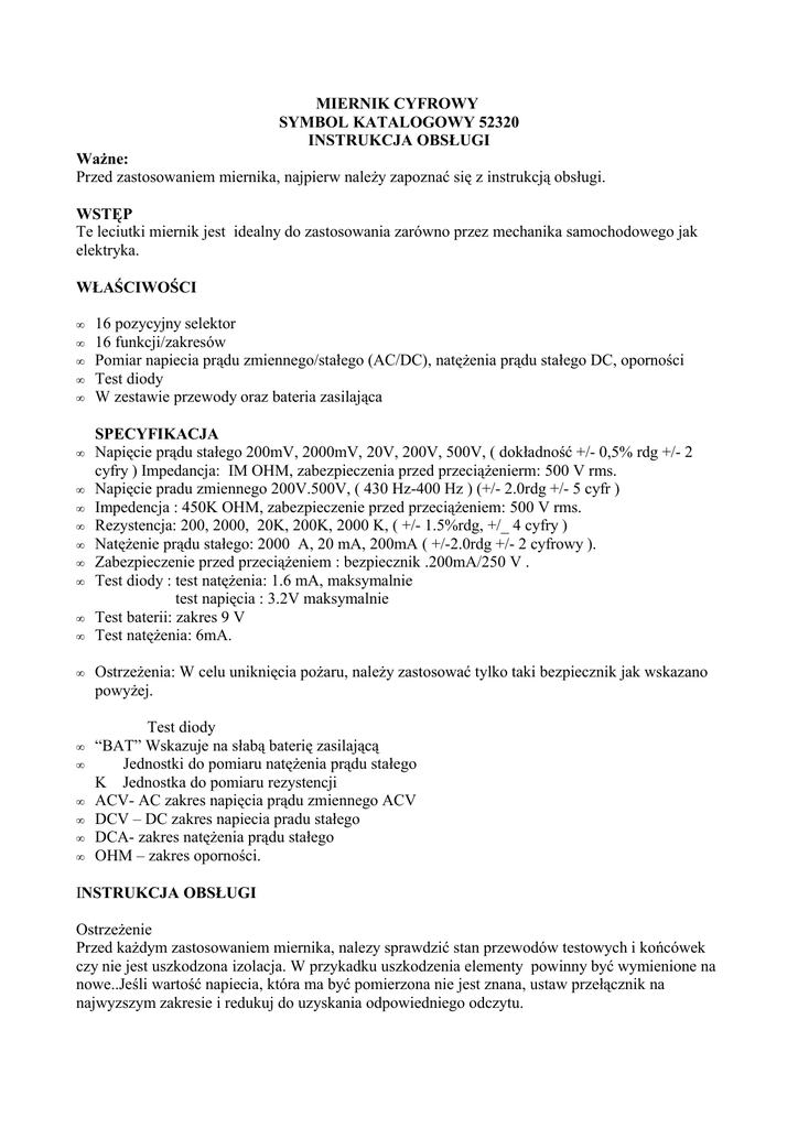 MIERNIK CYFROWY SYMBOL KATALOGOWY 52320 INSTRUKCJA OBSŁUGI Ważne: Przed zastosowaniem miernika, najpierw należy zapoznać się z instrukcją obsługi. WSTĘP Te leciutki miernik jest idealny do zastosowania zarówno przez mechanika samochodowego jak elektryka. WŁAŚCIWOŚCI • • • • • • • • • • • • • • • • • • • • • 16 pozycyjny selektor 16 funkcji/zakresów Pomiar napiecia prądu zmiennego/stałego (AC/DC), natężenia prądu stałego DC, oporności Test diody W zestawie przewody oraz bateria zasilająca SPECYFIKACJA Napięcie prądu stałego 200mV, 2000mV, 20V, 200V, 500V, ( dokładność +/- 0,5% rdg +/- 2 cyfry ) Impedancja: IM OHM, zabezpieczenia przed przeciążenierm: 500 V rms. Napięcie pradu zmiennego 200V.500V, ( 430 Hz-400 Hz ) (+/- 2.0rdg +/- 5 cyfr ) Impedencja : 450K OHM, zabezpieczenie przed przeciążeniem: 500 V rms. Rezystencja: 200, 2000, 20K, 200K, 2000 K, ( +/- 1.5%rdg, +/_ 4 cyfry ) Natężenie prądu stałego: 2000 A, 20 mA, 200mA ( +/-2.0rdg +/- 2 cyfrowy ). Zabezpieczenie przed przeciążeniem : bezpiecznik .200mA/250 V . Test diody : test natężenia: 1.6 mA, maksymalnie test napięcia : 3.2V maksymalnie Test baterii: zakres 9 V Test natężenia: 6mA. Ostrzeżenia: W celu uniknięcia pożaru, należy zastosować tylko taki bezpiecznik jak wskazano powyżej. Test diody “BAT” Wskazuje na słabą baterię zasilającą Jednostki do pomiaru natężenia prądu stałego K Jednostka do pomiaru rezystencji ACV- AC zakres napięcia prądu zmiennego ACV DCV – DC zakres napiecia pradu stałego DCA- zakres natężenia prądu stałego OHM – zakres oporności. INSTRUKCJA OBSŁUGI Ostrzeżenie Przed każdym zastosowaniem miernika, nalezy sprawdzić stan przewodów testowych i końcówek czy nie jest uszkodzona izolacja. W przykadku uszkodzenia elementy powinny być wymienione na nowe..Jeśli wartość napiecia, która ma być pomierzona nie jest znana, ustaw przełącznik na najwyzszym zakresie i redukuj do uzyskania odpowiedniego odczytu. Pomiar napiecia prądu stałego DC 1. Ustawić przełącznik na wymaganym zakresie napiecia prądu stałego DCV. 2. Podłaczyć do zasilania obwód, który ma być pomierzony. 3. Podłaczyć przewody testowe, do obwodu, który ma być pomierzony. Wartość napięcia powinna ukazać się wyświetlaczu cyfrowym wraz z biegunowością ( tylko jeśli jest odwrócona ). 4. Pomiar napiecia prądu zmiennego AC. 1. Ustawić przełącznik na wymaganym zakresie napięcia prądu zmiennego. 2. Podłączyć do zasilania obwód , który mabyć pomierzony.. 3. Podłaczyć przewody testowe do obwodu, który ma być pomierzony. Wartość napiecia powinna ukazać się na wyświetlaczu cyfrowym. Pomiar natężenia prądu stałego DC. 1. Ustawić przełącznik na wymaganym na zakresie DCA 2. Otwórz obwód, który ma być pomierzony i podłączyć przewody testowe szeregowo z obciążeniem, w którym prąd ma być pomierzony. Patrz rys. 1. . . 3. Podłaczyć zasilanie do obwodu, króry ma być pomierzony, wartość natężenia, ukaże się na cyfrowym wyswietlaczu. Pomiar oporności 1. Ustawić przełacznik zakresu na wymaganym zakresie OHM. Ostrzeżenia: Jesli oporność, która ma być pomierzona jest częścią obwodu, odłączyć zasilanie i rozładować wszystkie kondensatory przed pomiarem. 2. Podłaczyć przewody testowe do obwodu, który ma być pomierzony. 3. Wartośc oporności powinna ukazać się na wyświetlaczu cyfrowym. Pomiar diody 1. Ustawić przełacznik na pozycji Dioda. 2. Podłaczyć czerwony przewód testowy do anody diody, która ma być pomierzona i czarny przewód testowy do katody. 3. Na wyswietlaczu pokaze się spadek napięcia przewodzenia w mV., jeśli dioda jest odwrócona, na wyświetlacza powinna pokazać się cyfra “I”.