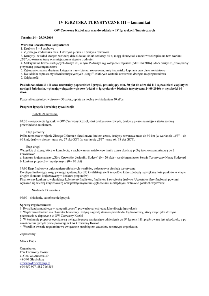 IV IGRZYSKA TURYSTYCZNE 111 – komunikat OW Czerwony Kozioł zaprasza do udziału w IV Igrzyskach Turystycznych Termin: 24 – 25.09.2016 Warunki uczestnictwa i odpłatność: 1. Drużyny 3 – 5 osobowe 2. Z jednego środowiska max. 1 drużyna piesza i 1 drużyna rowerowa 3. Drużyny, w skład których wchodzą dzieci do lat 10 lub seniorzy 65 +, mogą skorzystać z możliwości zapisu na tzw. wariant „2/3”, co oznacza trasy o zmniejszonym stopniu trudności 4. Maksymalna liczba startujących drużyn 20, w tym 15 drużyn wg kolejności zapisów (od 01.04.2016) i do 5 drużyn z „dziką kartą” przyznaną przez organizatora 5. Zgłoszenie: nazwa drużyny, kategoria trasy (piesza, rowerowa), imię i nazwisko kapitana oraz dane kontaktowe 6. Do udziału zapraszamy również turystycznych „singli”, z których zostanie utworzona drużyna międzynarodowa 7. Odpłatność: Posiadacze odznaki 111 oraz uczestnicy poprzednich Igrzysk, posiadający min. 50 pkt do odznaki 111 są zwolnieni z opłaty za noclegi i śniadania, wpłacają wyłącznie wpisowe (udział w Igrzyskach + biesiada turystyczna 24.09.2016) w wysokości 10 zł/os. Pozostali uczestnicy: wpisowe - 30 zł/os., opłata za nocleg ze śniadaniem 30 zł/os. Program Igrzysk i przebieg rywalizacji: Sobota 24 września 07:30 – rozpoczęcie Igrzysk w OW Czerwony Kozioł, start drużyn rowerowych, drużyny piesze na miejsca startu zostaną przewiezione autokarem. Etap pierwszy Próba terenowa w rejonie Zlatego Chlumu z określonym limitem czasu, drużyny rowerowe trasa do 90 km (w wariancie „2/3” – do 60 km), drużyny piesze - trasa ok. 27 pkt GOT (w wariancie „2/3” - trasa ok. 18 pkt GOT). Etap drugi Wszystkie drużyny, które w komplecie, z zachowaniem ustalonego limitu czasu ukończą próbę terenową przystępują do 2 konkursów: a. konkurs krajoznawczy „Góry Opawskie, Jesioniki, Sudety” (0 – 20 pkt) – współorganizator Serwis Turystyczny Nasze Sudety.pl b. konkurs proporców turystycznych (0 – 10 pkt) 19:00 Etap finałowy z ogłoszeniem oficjalnych wyników, połączony z biesiadą turystyczną Do etapu finałowego, rozgrywanego system play off, kwalifikuje się 8 zespołów, które zdobędą największą ilość punktów w etapie drugim (konkurs krajoznawczy + konkurs proporców). Finał to trzy konkursy, wyłaniające kolejno półfinalistów, finalistów i zwycięską drużynę. Uczestnicy fazy finałowej powinni wykazać się wiedzą krajoznawczą oraz praktycznymi umiejętnościami niezbędnymi w trakcie górskich wędrówek. Niedziela 25 września 09:00 – śniadanie, zakończenie Igrzysk Sprawy regulaminowe: 1. Rywalizacja przebiega w kategorii „open”, prowadzona jest jedna klasyfikacja Igrzyskach 2. Współzawodnictwo ma charakter honorowy. Jedyną nagrodę stanowi przechodni kij honorowy, który zwycięska drużyna pozostawia w depozycie w OW Czerwony Kozioł 3. W konkursie proporcy oceniane są wyłącznie prace zawierające odniesienia do IV Igrzysk 111, preferowane jest rękodzieło, a po zakończeniu Igrzysk prace pozostają w OW Czerwony Kozioł 4. Wszelkie kwestie regulaminowe związane z przebiegiem zawodów rozstrzyga organizator. Zapraszamy! Marek Duda Organizator: OW Czerwony Kozioł ul.Gen.Wł.Andersa 39 48-340 Głuchołazy [email protected] 604 650 907, 882 716 856