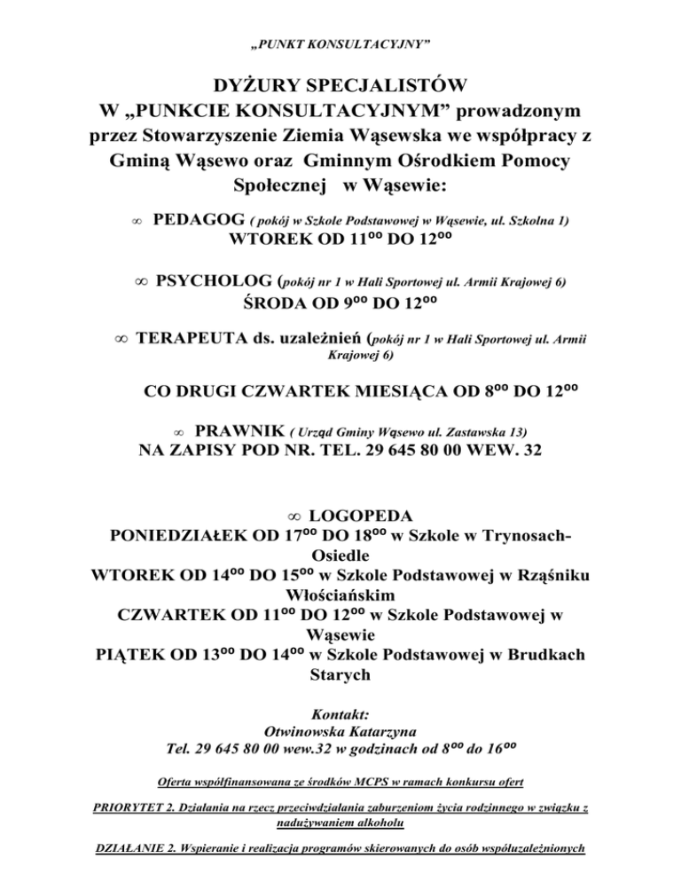 „PUNKT KONSULTACYJNY” DYŻURY SPECJALISTÓW W „PUNKCIE KONSULTACYJNYM” prowadzonym przez Stowarzyszenie Ziemia Wąsewska we współpracy z Gminą Wąsewo oraz Gminnym Ośrodkiem Pomocy Społecznej w Wąsewie: • PEDAGOG ( pokój w Szkole Podstawowej w Wąsewie, ul. Szkolna 1) WTOREK OD 11⁰⁰ DO 12⁰⁰ • PSYCHOLOG (pokój nr 1 w Hali Sportowej ul. Armii Krajowej 6) ŚRODA OD 9⁰⁰ DO 12⁰⁰ • TERAPEUTA ds. uzależnień (pokój nr 1 w Hali Sportowej ul. Armii Krajowej 6) CO DRUGI CZWARTEK MIESIĄCA OD 8⁰⁰ DO 12⁰⁰ • PRAWNIK ( Urząd Gminy Wąsewo ul. Zastawska 13) NA ZAPISY POD NR. TEL. 29 645 80 00 WEW. 32 • LOGOPEDA PONIEDZIAŁEK OD 17⁰⁰ DO 18⁰⁰ w Szkole w TrynosachOsiedle WTOREK OD 14⁰⁰ DO 15⁰⁰ w Szkole Podstawowej w Rząśniku Włościańskim CZWARTEK OD 11⁰⁰ DO 12⁰⁰ w Szkole Podstawowej w Wąsewie PIĄTEK OD 13⁰⁰ DO 14⁰⁰ w Szkole Podstawowej w Brudkach Starych Kontakt: Otwinowska Katarzyna Tel. 29 645 80 00 wew.32 w godzinach od 8⁰⁰ do 16⁰⁰ Oferta współfinansowana ze środków MCPS w ramach konkursu ofert PRIORYTET 2. Działania na rzecz przeciwdziałania zaburzeniom życia rodzinnego w związku z nadużywaniem alkoholu DZIAŁANIE 2. Wspieranie i realizacja programów skierowanych do osób współuzależnionych